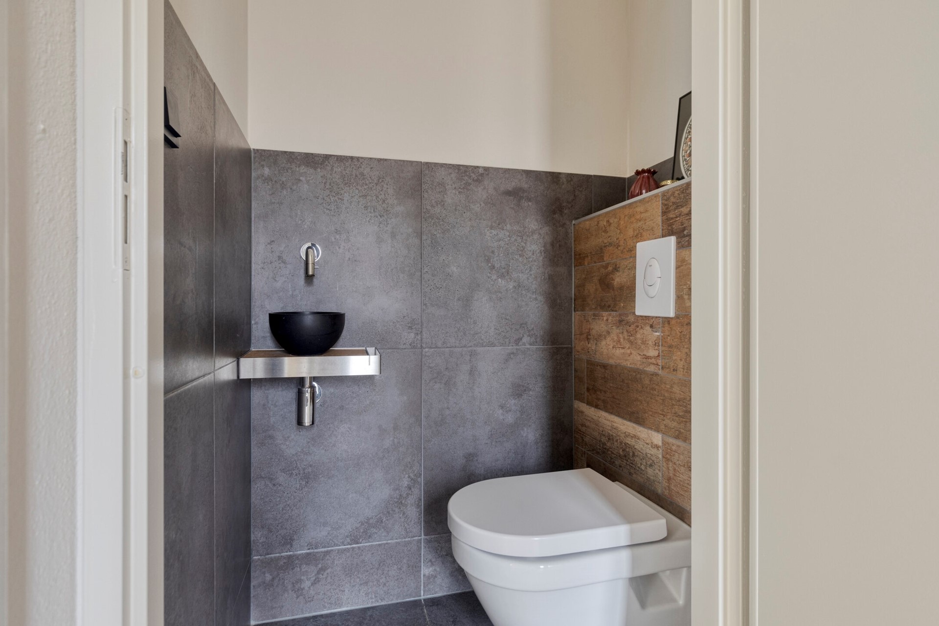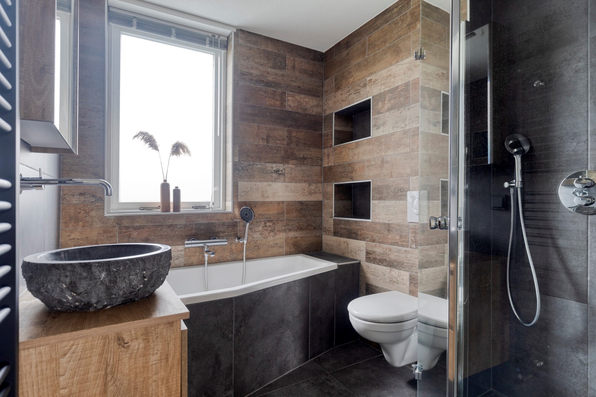 De stijlvolle badkamer is compleet uitgevoerd met een ligbad, douche, toilet en badkamermeubel. De badkamer heeft een oppervlakte van ca. 4,7 m2.