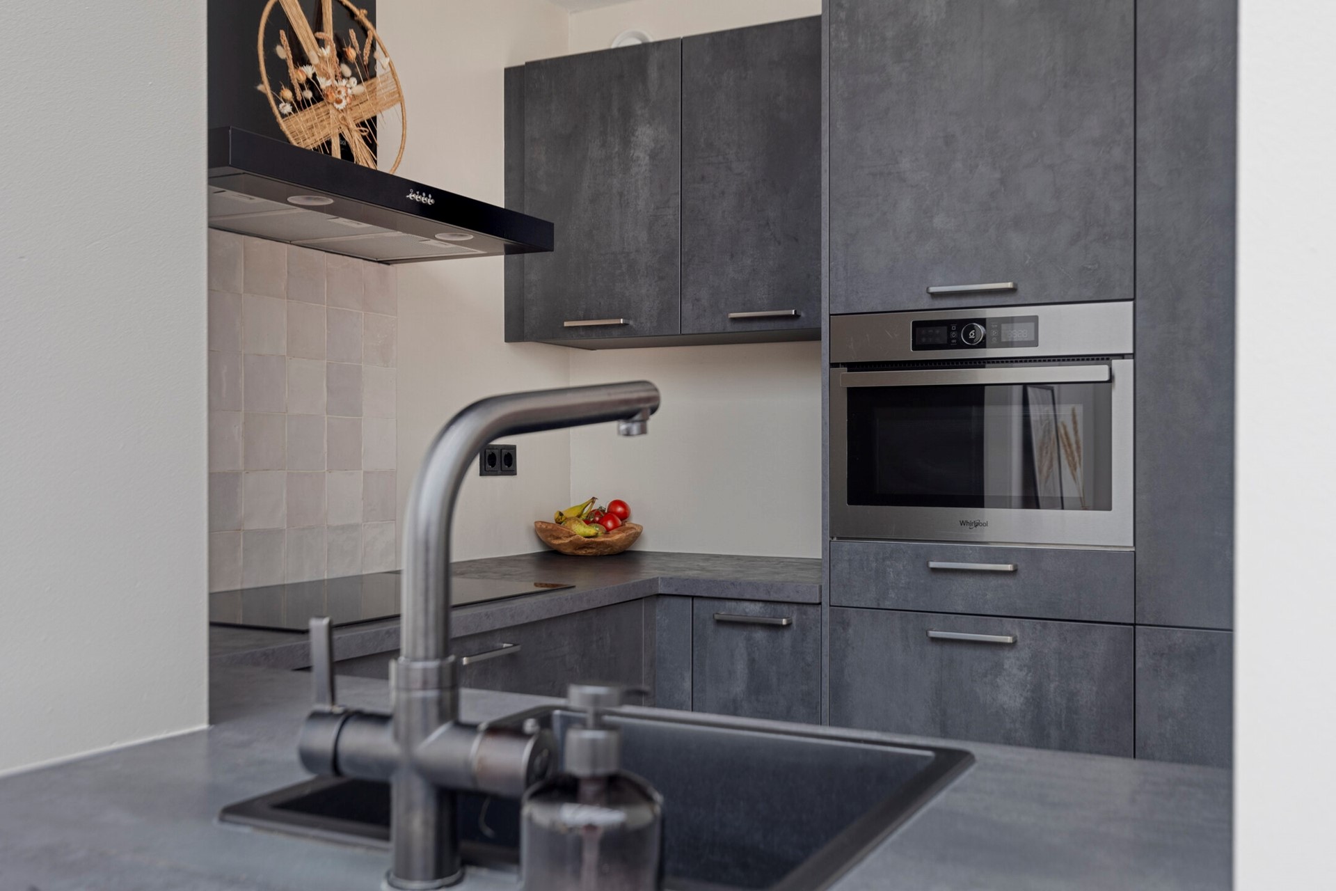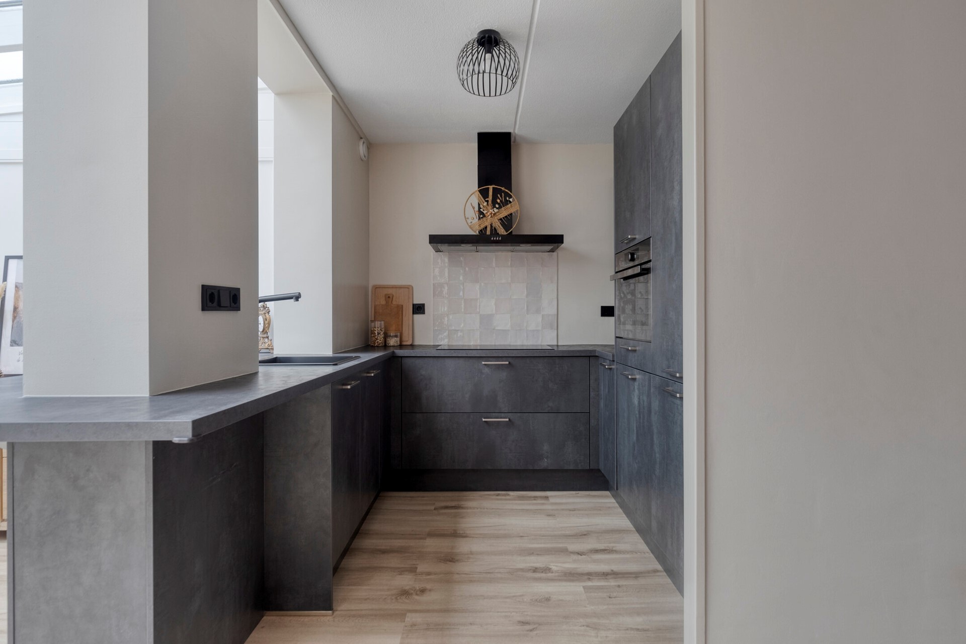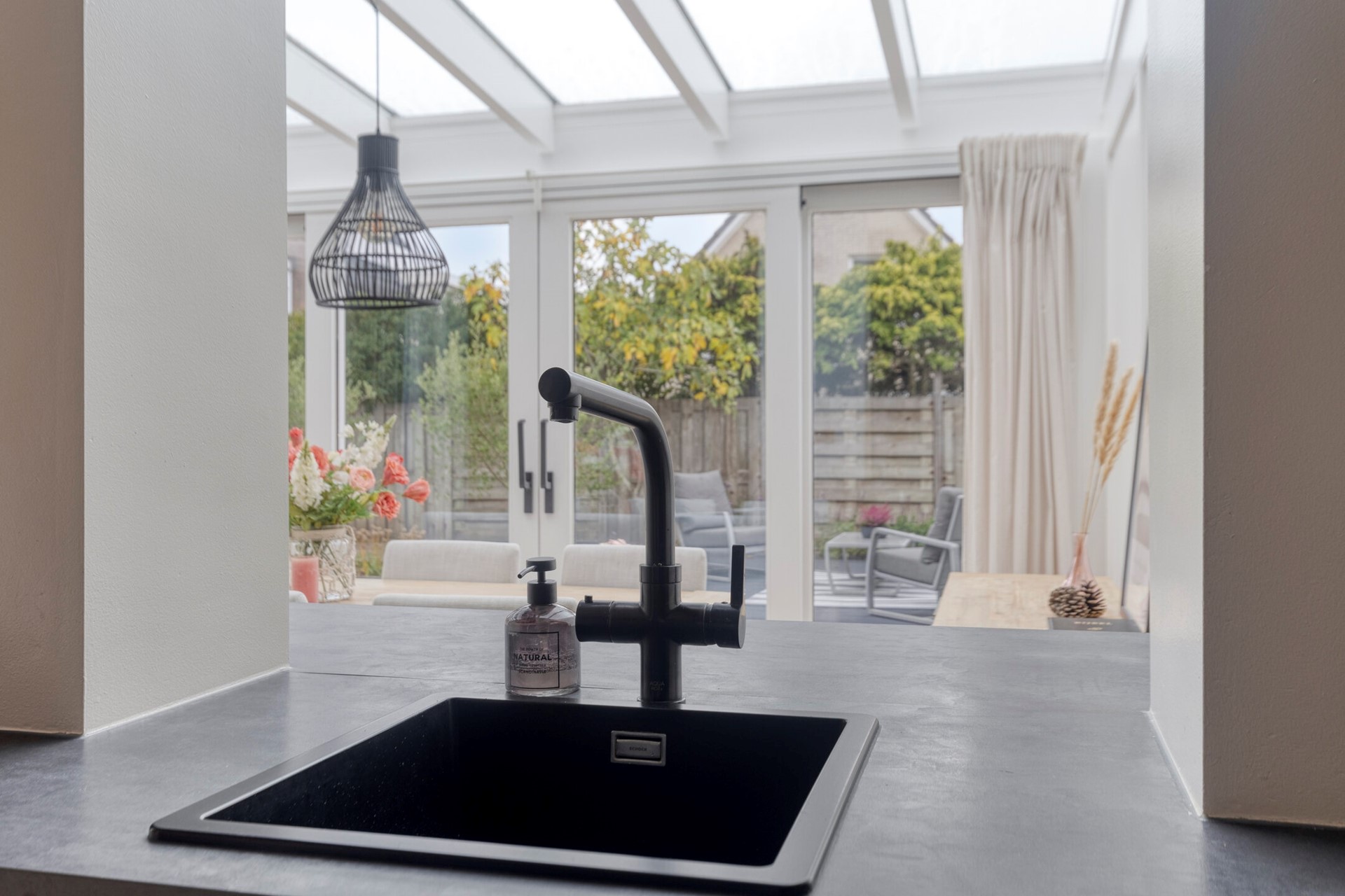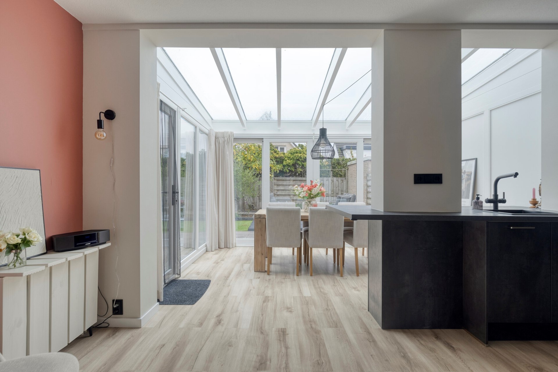 U komt de woning binnen in de hal met meterkast en toilet. Het toilet is keurig en modern uitgevoerd met een hangtoilet en een fonteintje. De lichte, gezellige woonkamer biedt een prettige leefruimte en een fijne zithoek aan de voorzijde. De serre aan de achterzijde is voorzien van de eethoek en staat met de schuifpui in directe verbinding met de tuin, ideaal om tijdens warme dagen van het buitenleven te genieten. De moderne keuken is uitgevoerd in een eigentijdse opstelling met eetbar en voorzien van alle wenselijke inbouwapparatuur: een koel-/vriescombinatie, vaatwasser, oven, inductiekookplaat en Quooker. De keuken staat in open verbinding met de serre, wat zorgt voor een ruimtelijk gevoel.