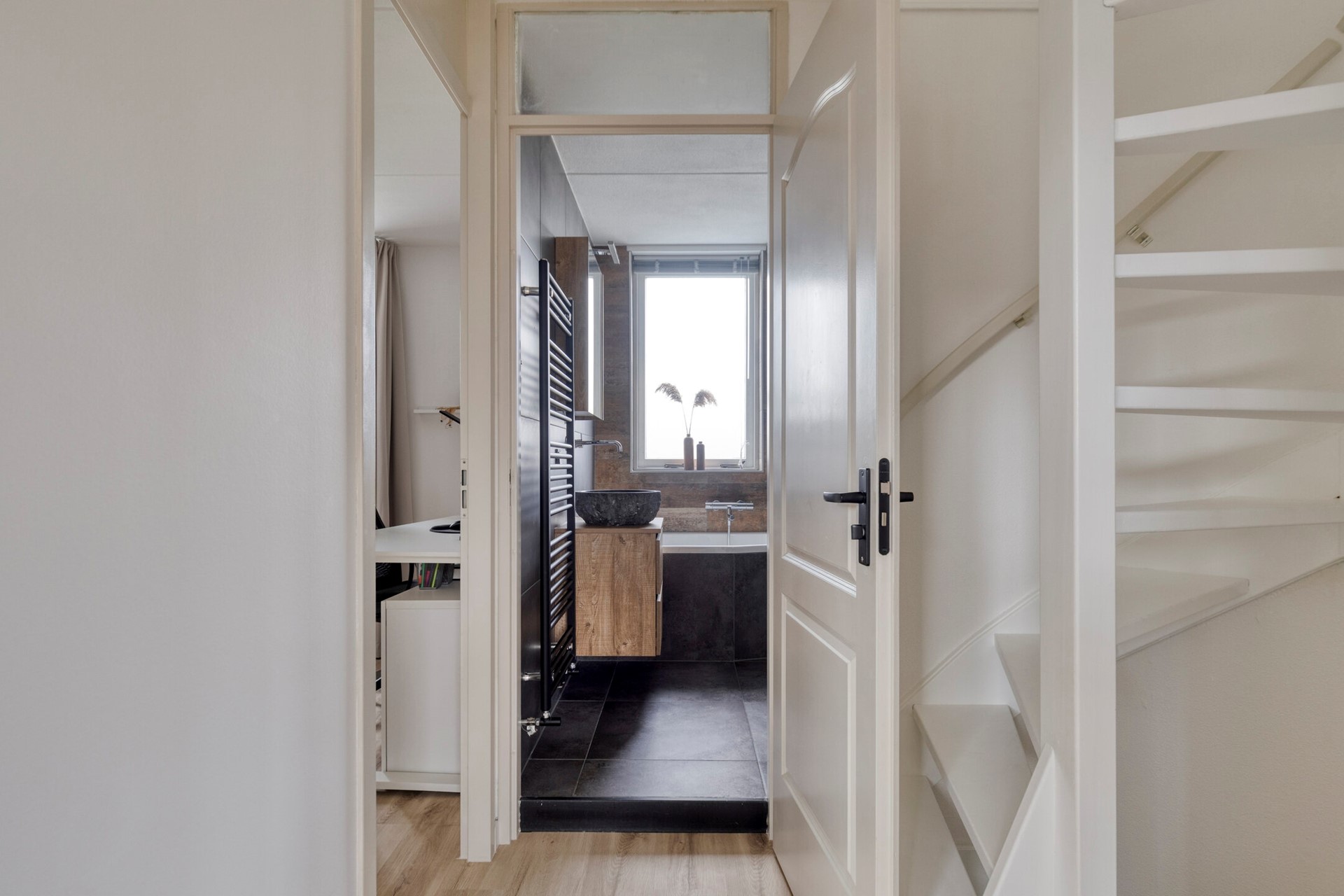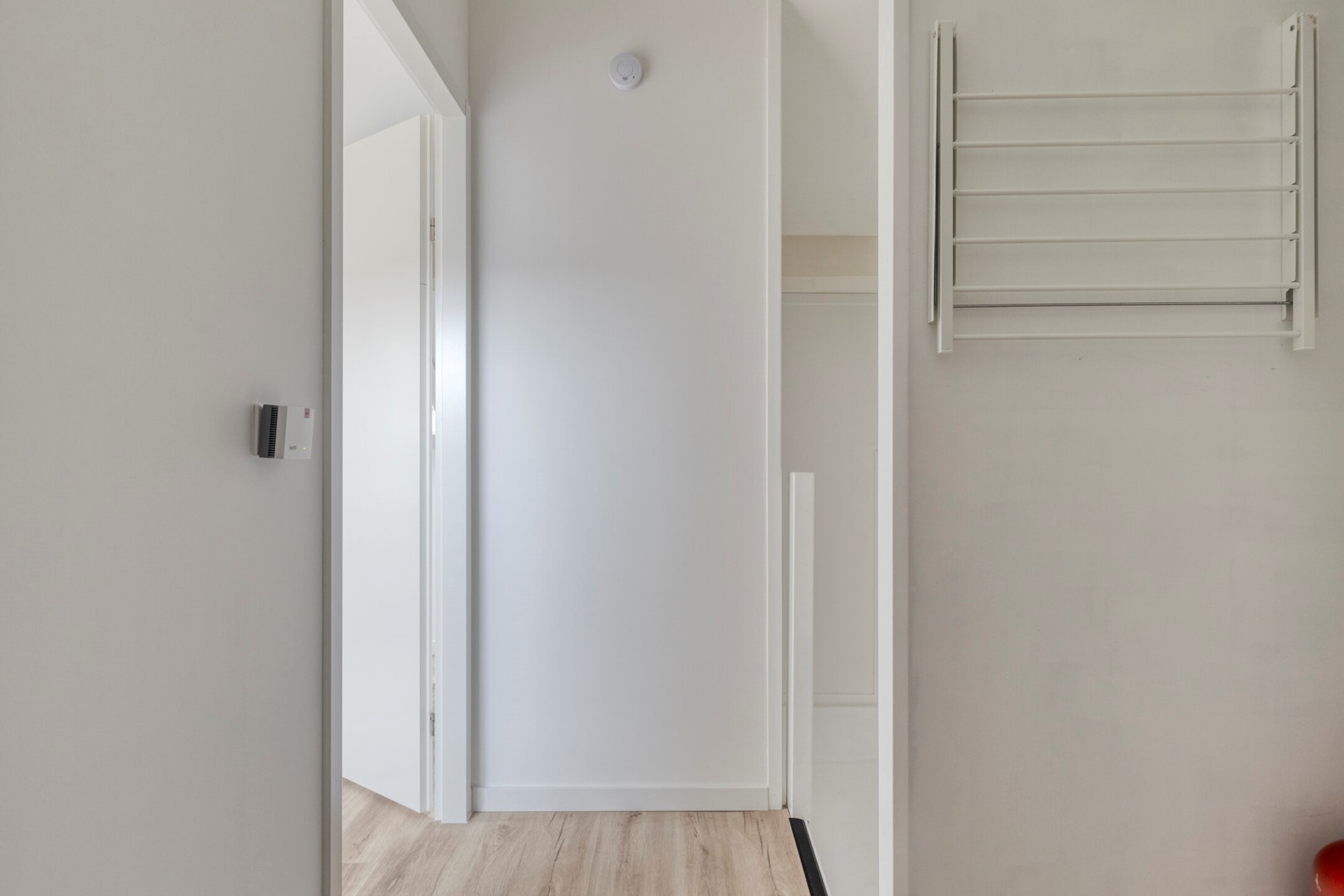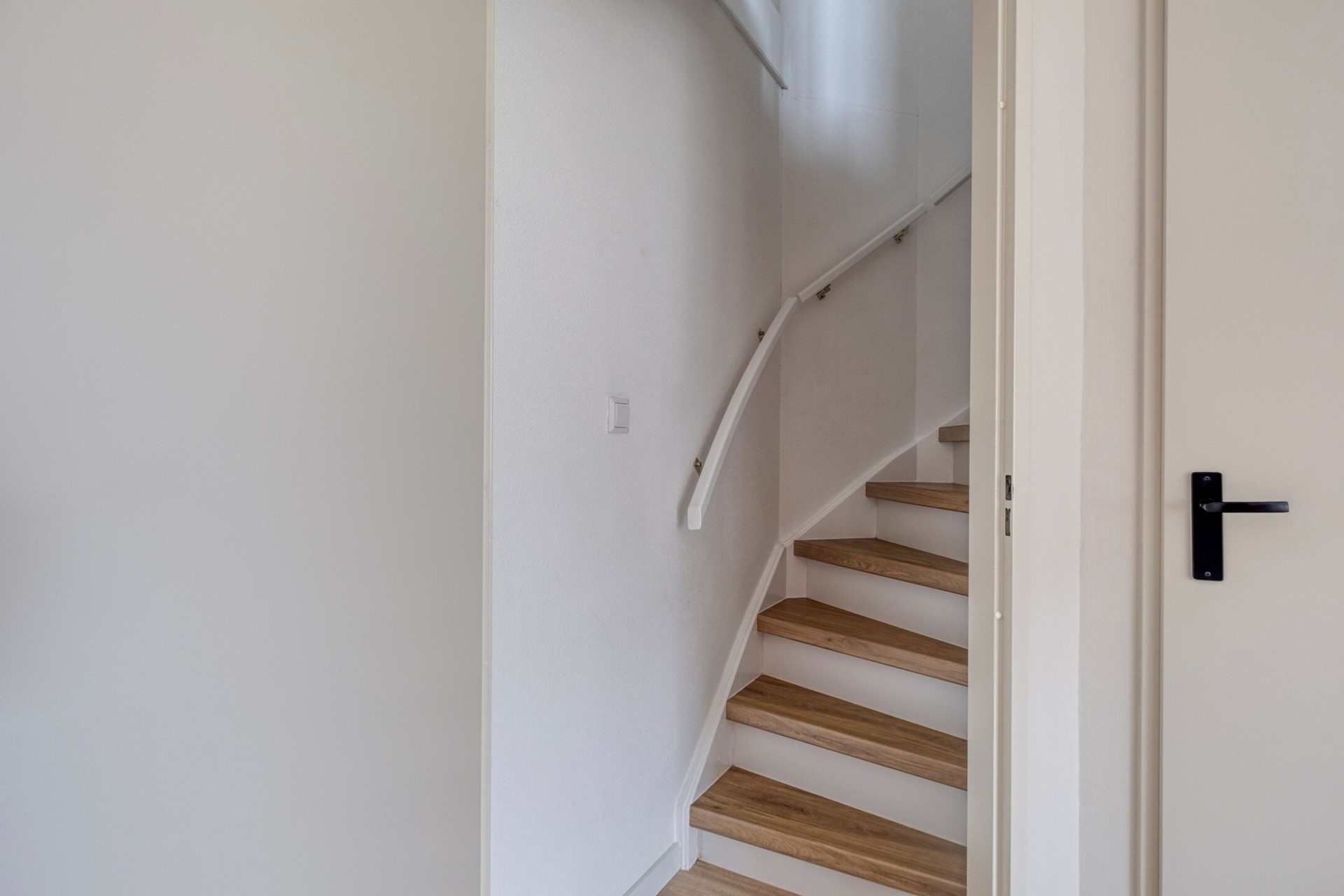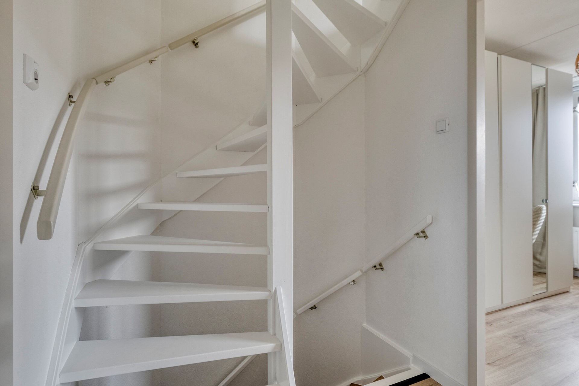 Verder is er in de woonkamer een praktische trapkast aanwezig en biedt de tussenhal toegang tot de bovenverdiepingen.