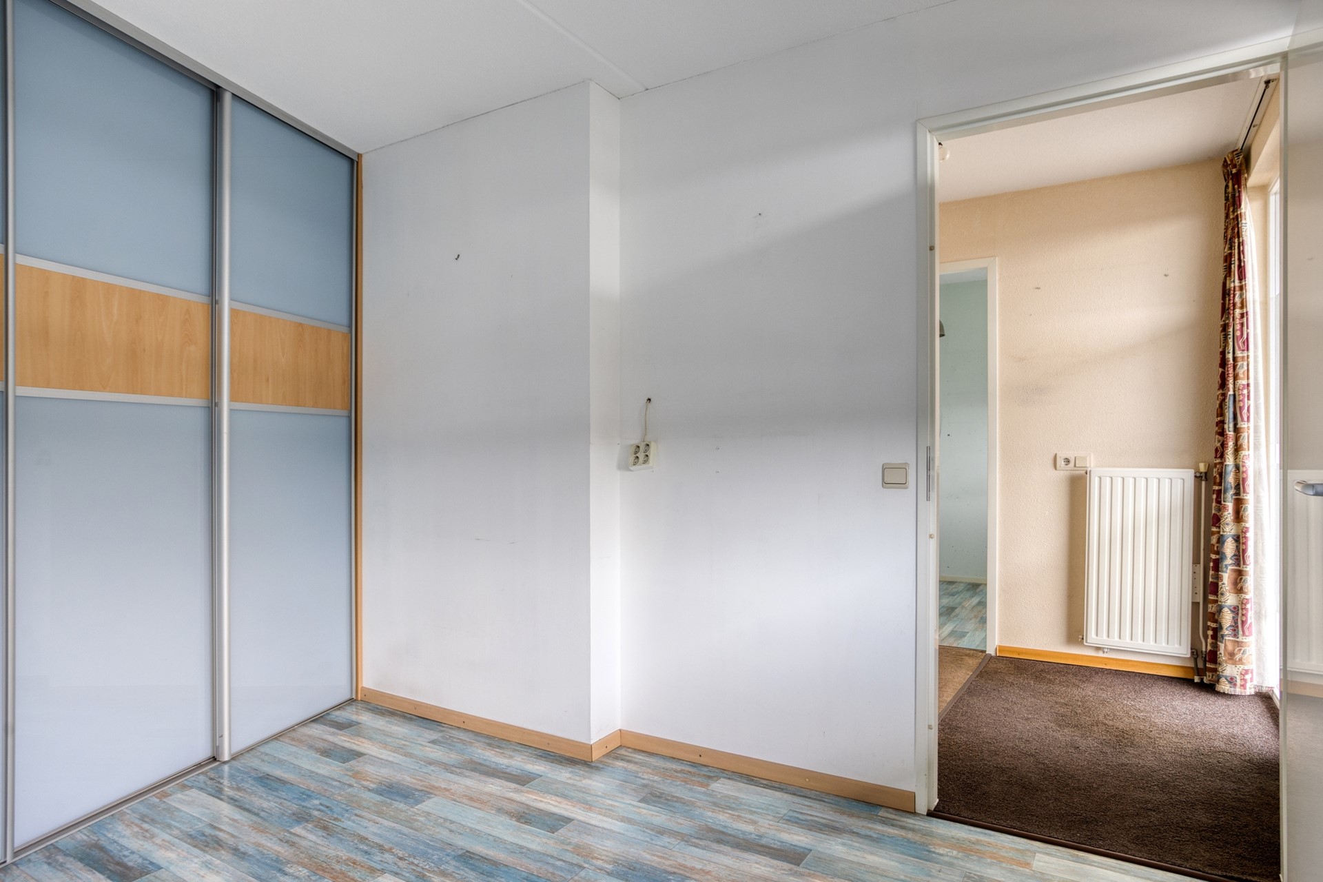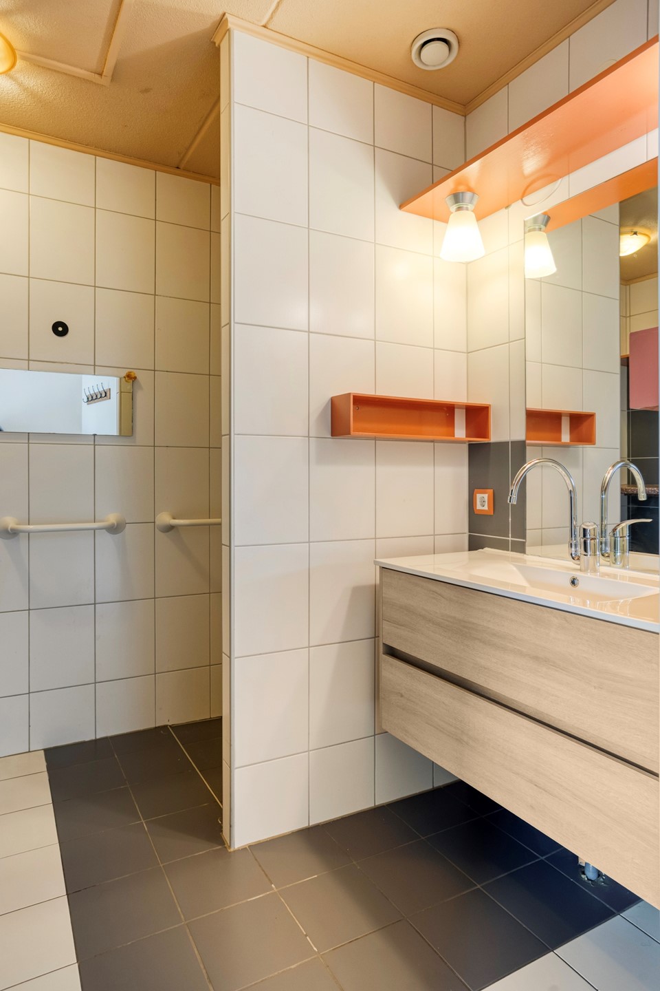 De badkamer is uitgerust met een douchehoek, wastafelmeubel en aansluitingen voor huishoudelijk apparatuur. De badkamer heeft een oppervlakte van ca. 5 m2. Verder zijn er twee slaapkamers aanwezig met een oppervlakte van ca. 7,7 m2 en ca. 8,6 m2. De grootste slaapkamer is voorzien van een vaste kast.
