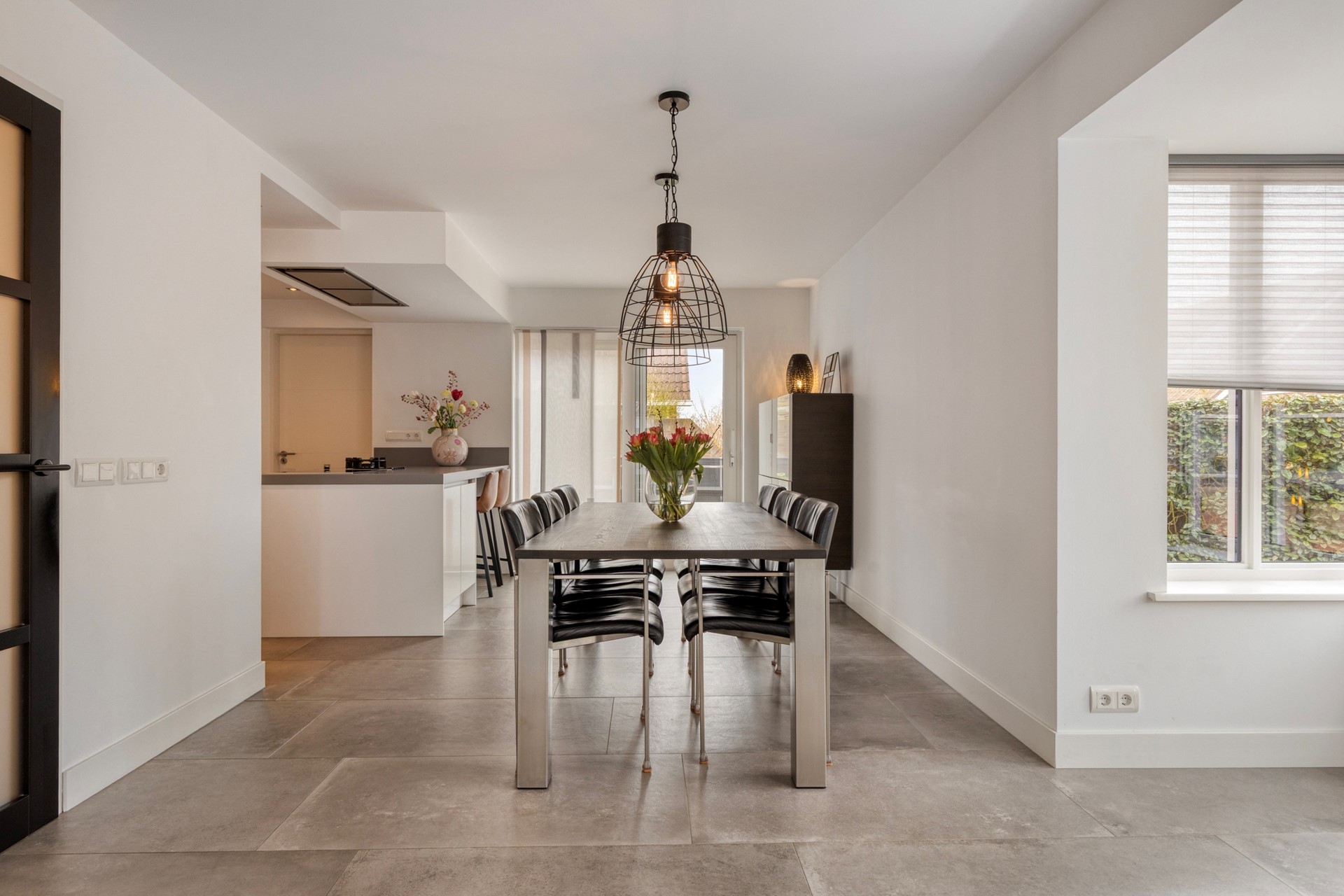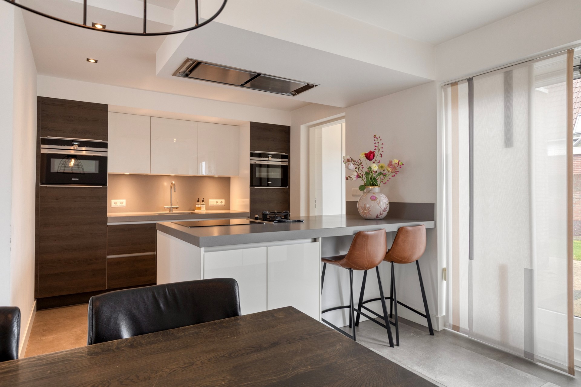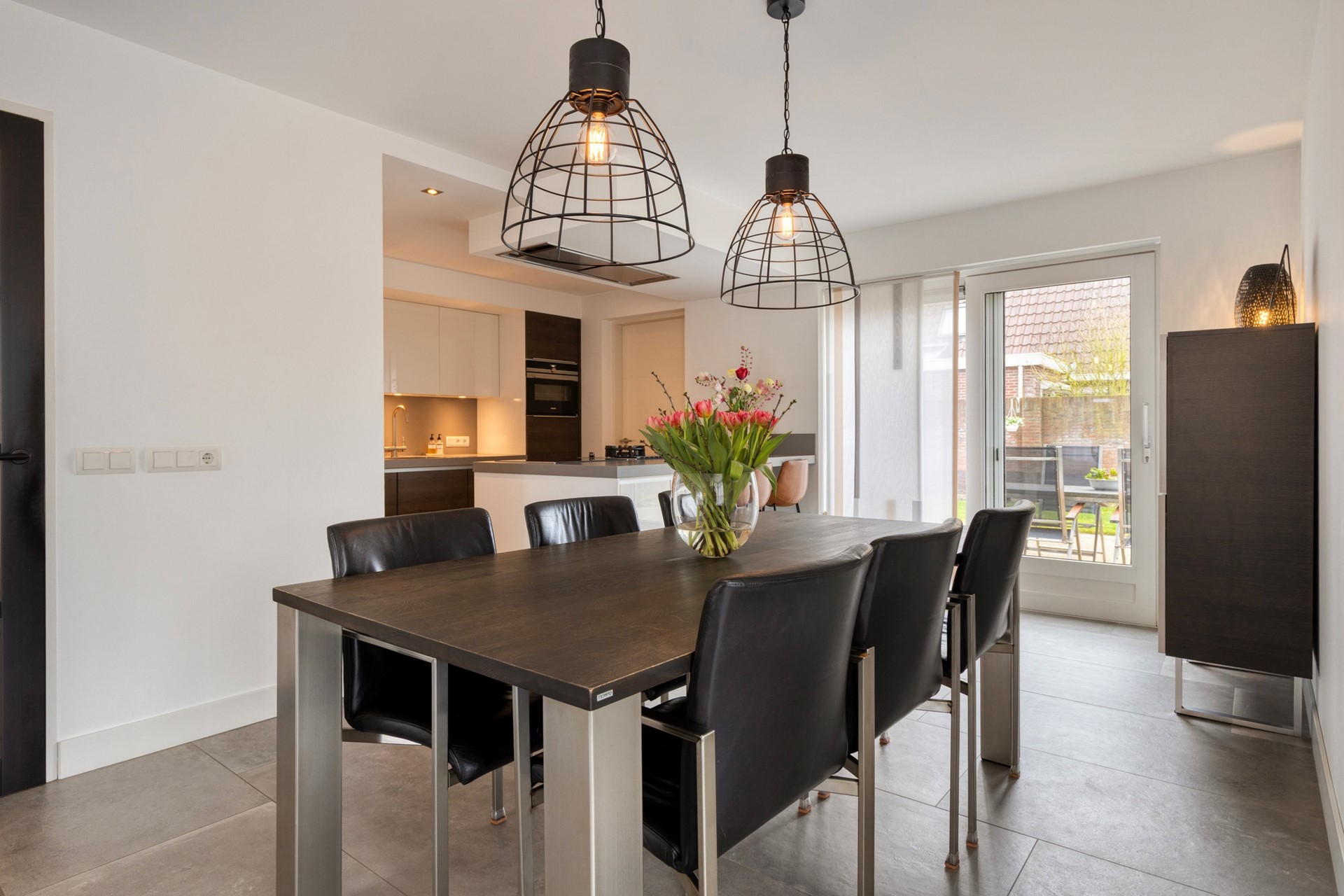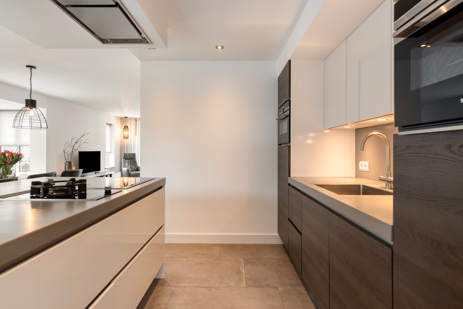U betreedt de woning via de hal met meterkast, toilet en trapopgang. Vanuit de hal komt u in de royale woonruimte met open woonkeuken. De woonkamer is heerlijk licht dankzij de erker en de grote raampartijen. De zithoek is gesitueerd aan de voorzijde van de woning en biedt een leuk uitzicht op de straat. De eethoek bevindt zich aan de achterzijde, naast de woonkeuken. De schuifpui zorgt voor een fijne verbinding met de tuin. De woonkamer en keuken hebben samen een oppervlakte van circa 50 m², zijn keurig afgewerkt en voorzien van fraaie vloertegels met vloerverwarming. De moderne keuken (2019) is uitgerust met een kookeiland en alle gewenste inbouwapparatuur en vormt het hart van de woning. De apparatuur bestaat onder andere uit een inductiekookplaat, wokbrander, afzuigkap, vaatwasser, koelkast, oven, combimagnetron en Quooker.