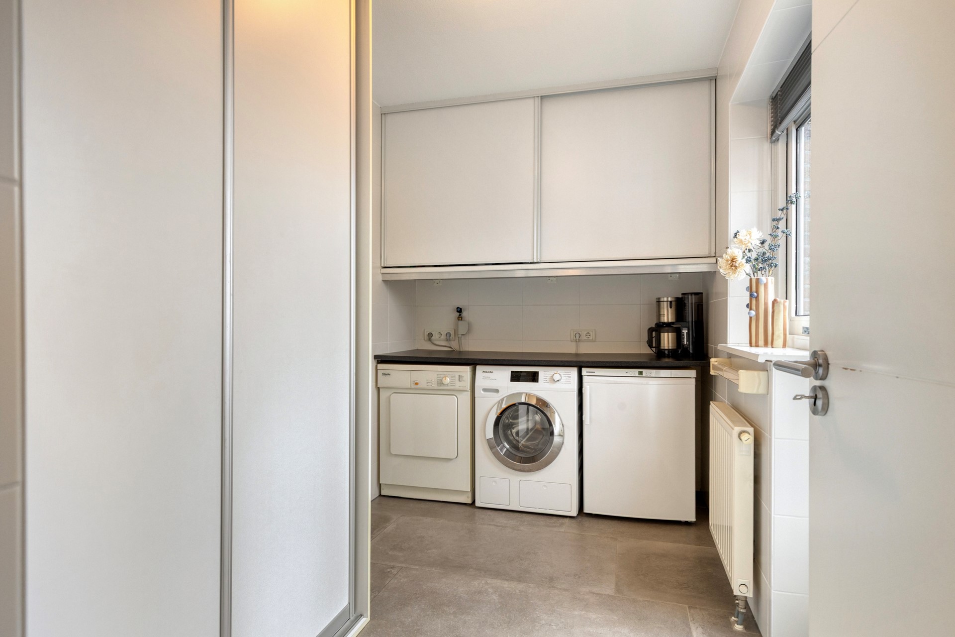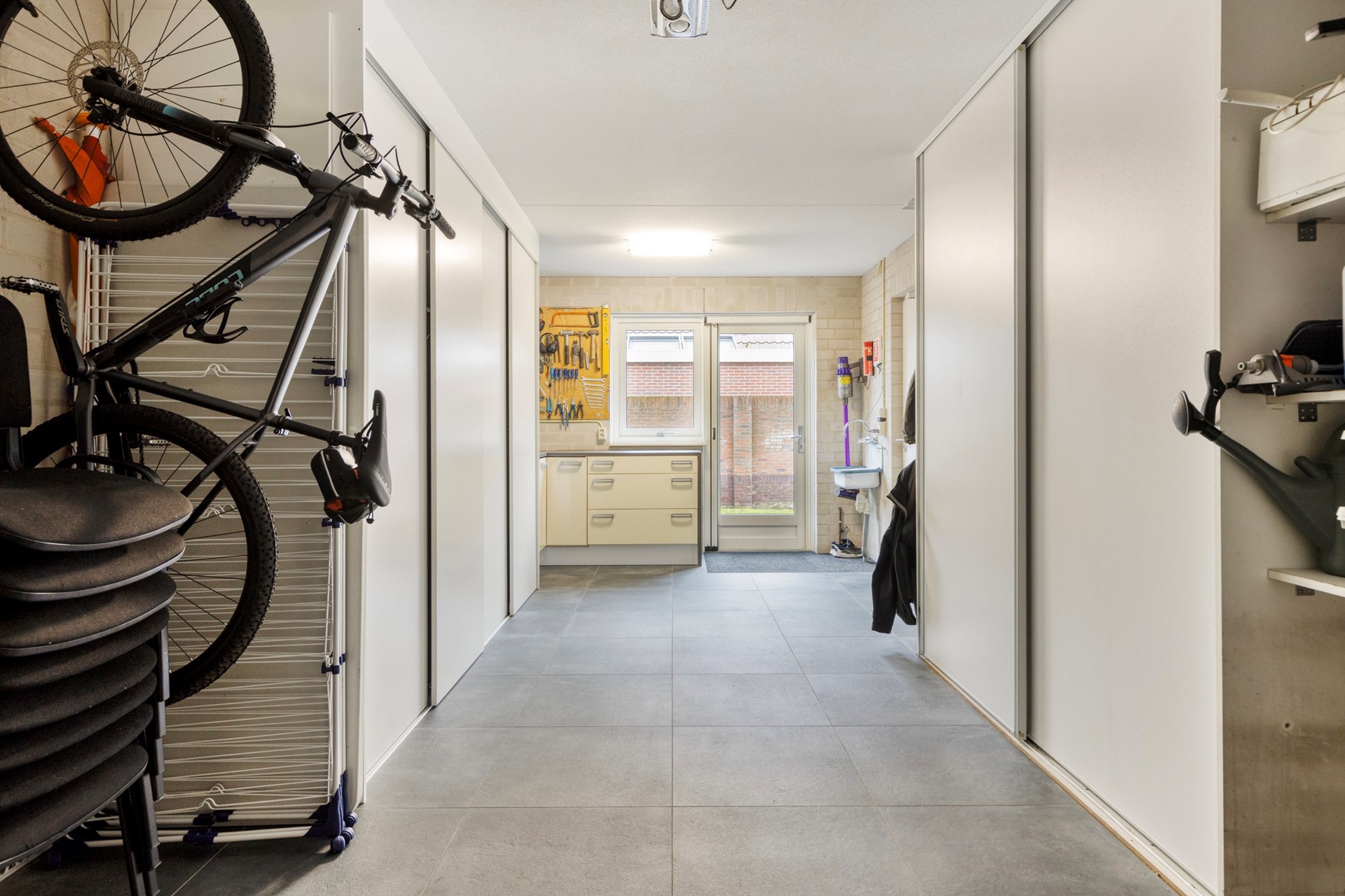 Aansluitend bevindt zich de praktische bijkeuken (circa 5,9 m²) met vaste kastruimte, aansluitingen voor huishoudelijke apparatuur en toegang tot de tuin en garage.