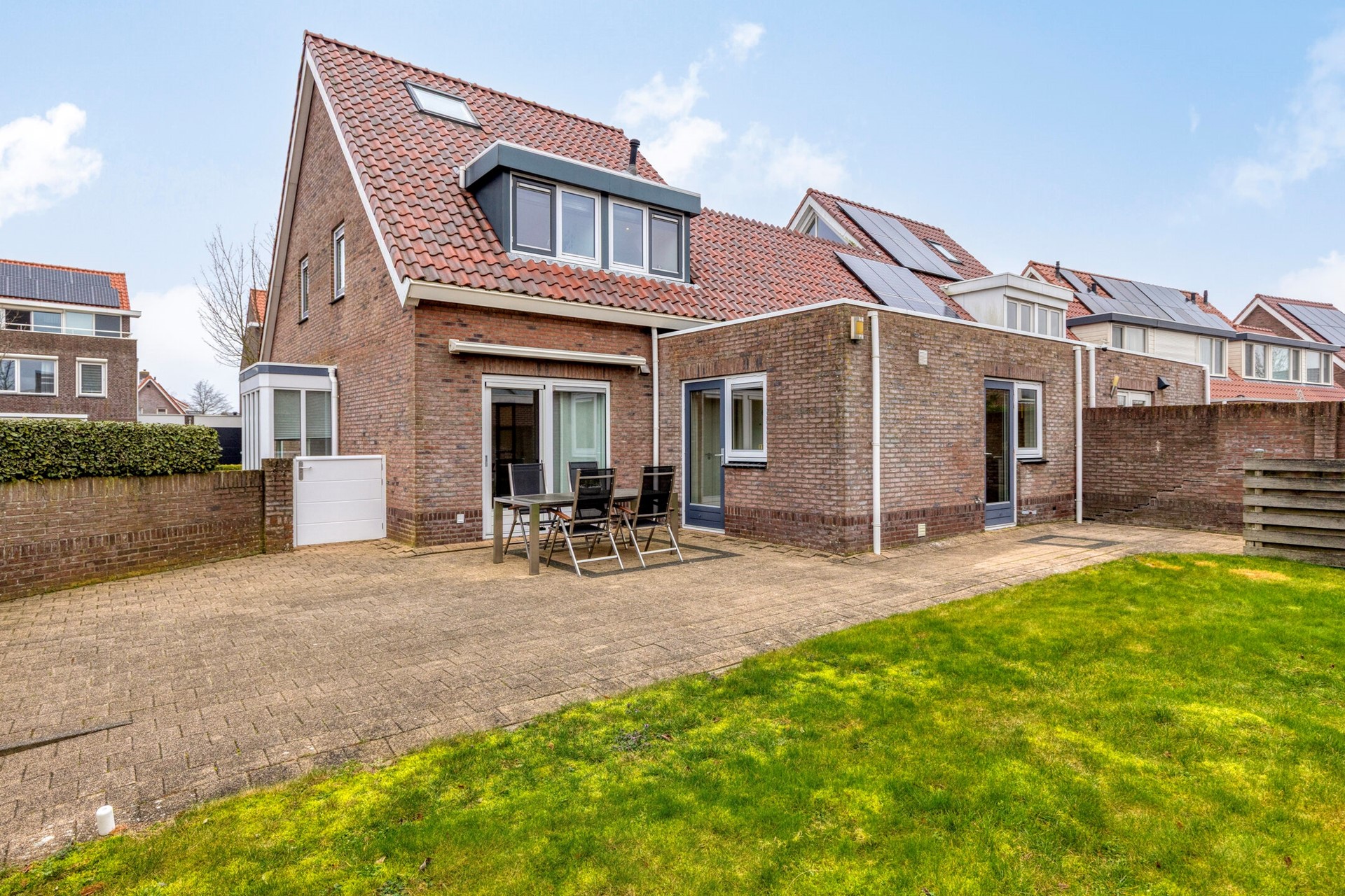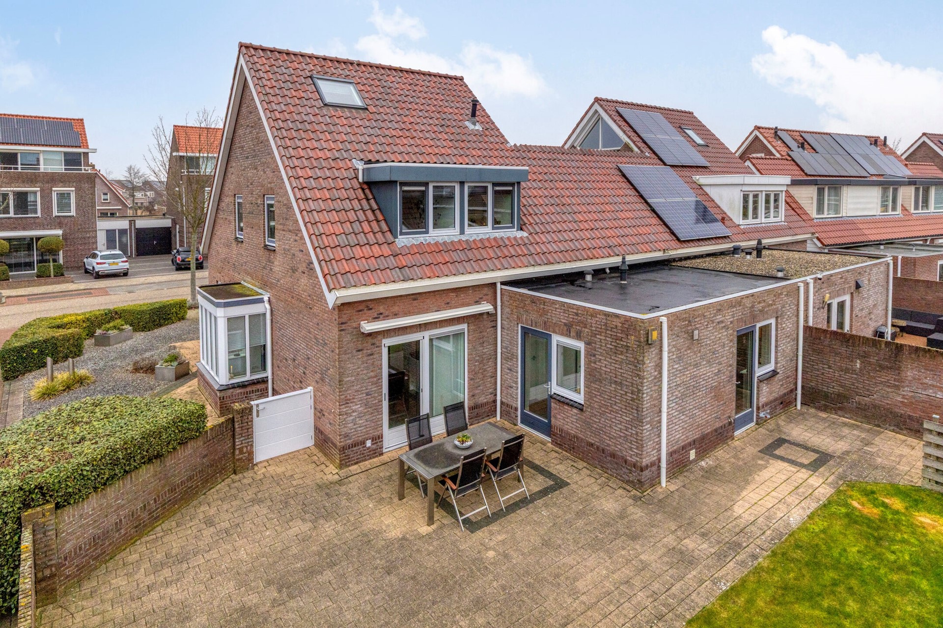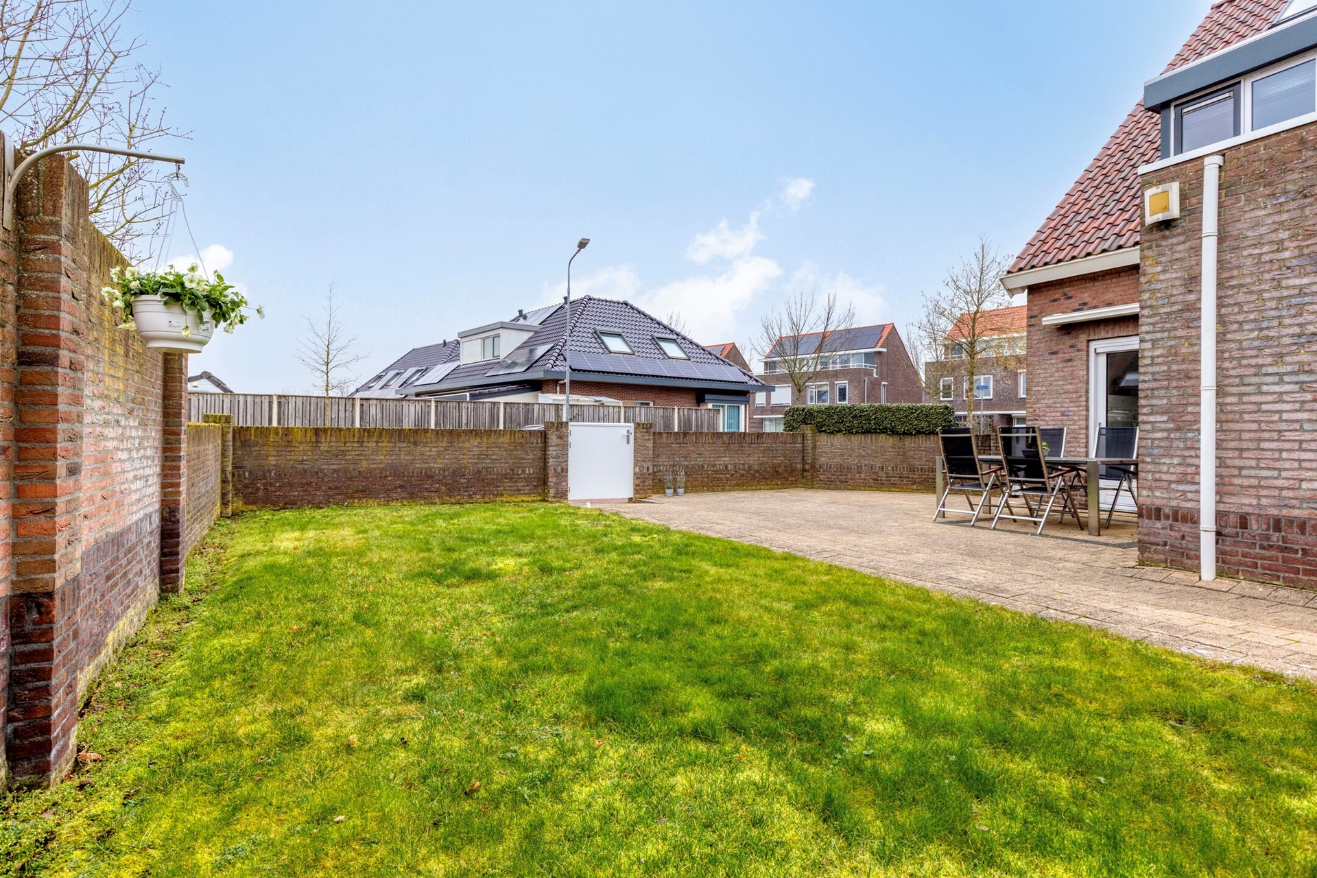 De ruime achtertuin is open aangelegd met bestrating en gras en is gunstig gelegen op het zuidwesten, waardoor u hier optimaal van de zon kunt genieten. Aan de gevel bevindt zich een zonnescherm. De tuin beschikt over een vrije achterom. Aan de voorzijde ligt een diepe oprit met parkeergelegenheid voor meerdere auto’s.