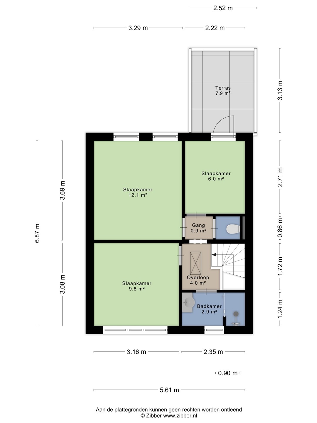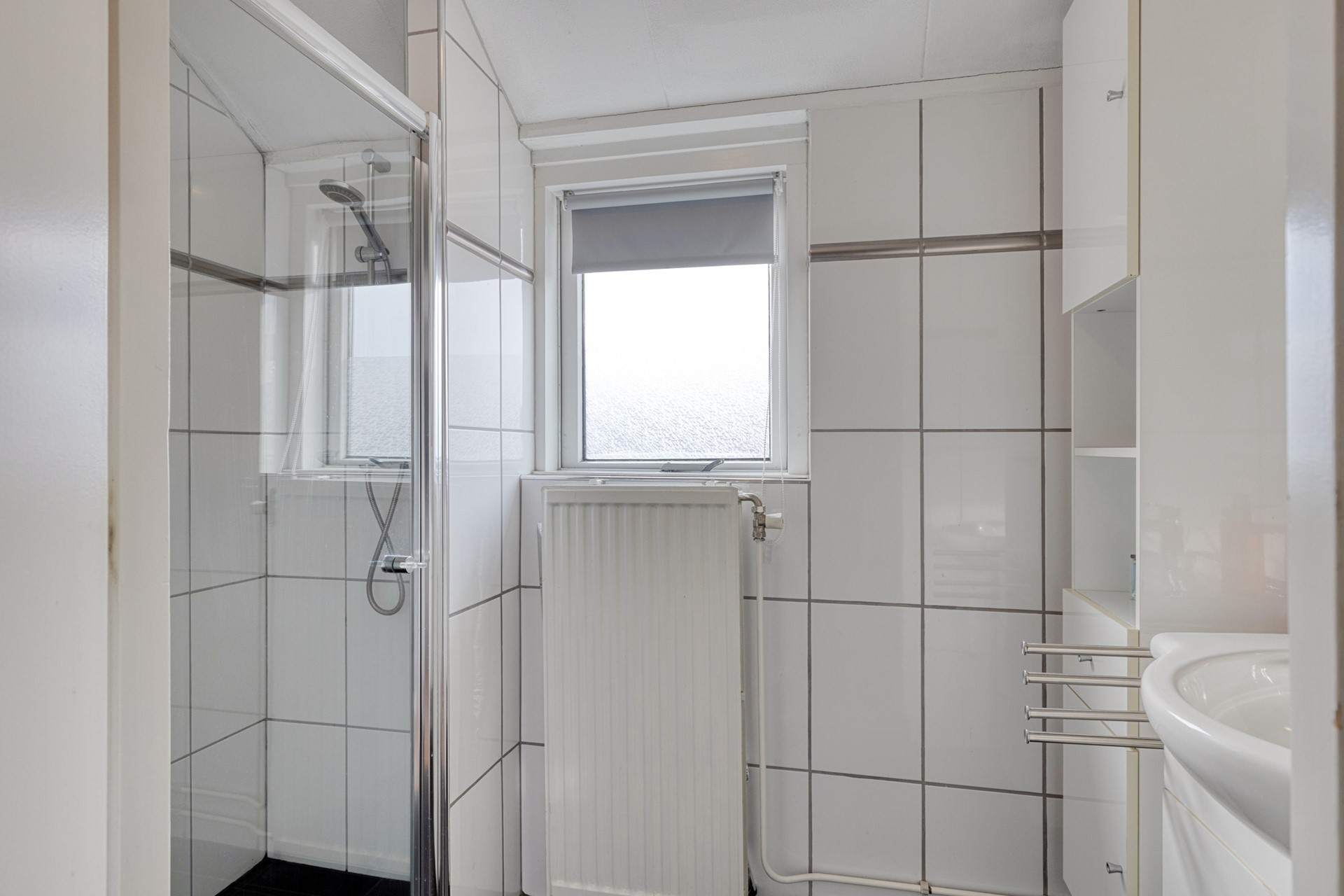 De kleinste slaapkamer aan de achterzijde biedt toegang tot het dakterras op het oosten (ca. 8 m²), ideaal voor bijvoorbeeld het drogen van de was. De badkamer bevindt zich aan de voorzijde, heeft een oppervlakte van ca. 3 m² en is praktisch ingericht met een douchehoek en een badkamermeubel.