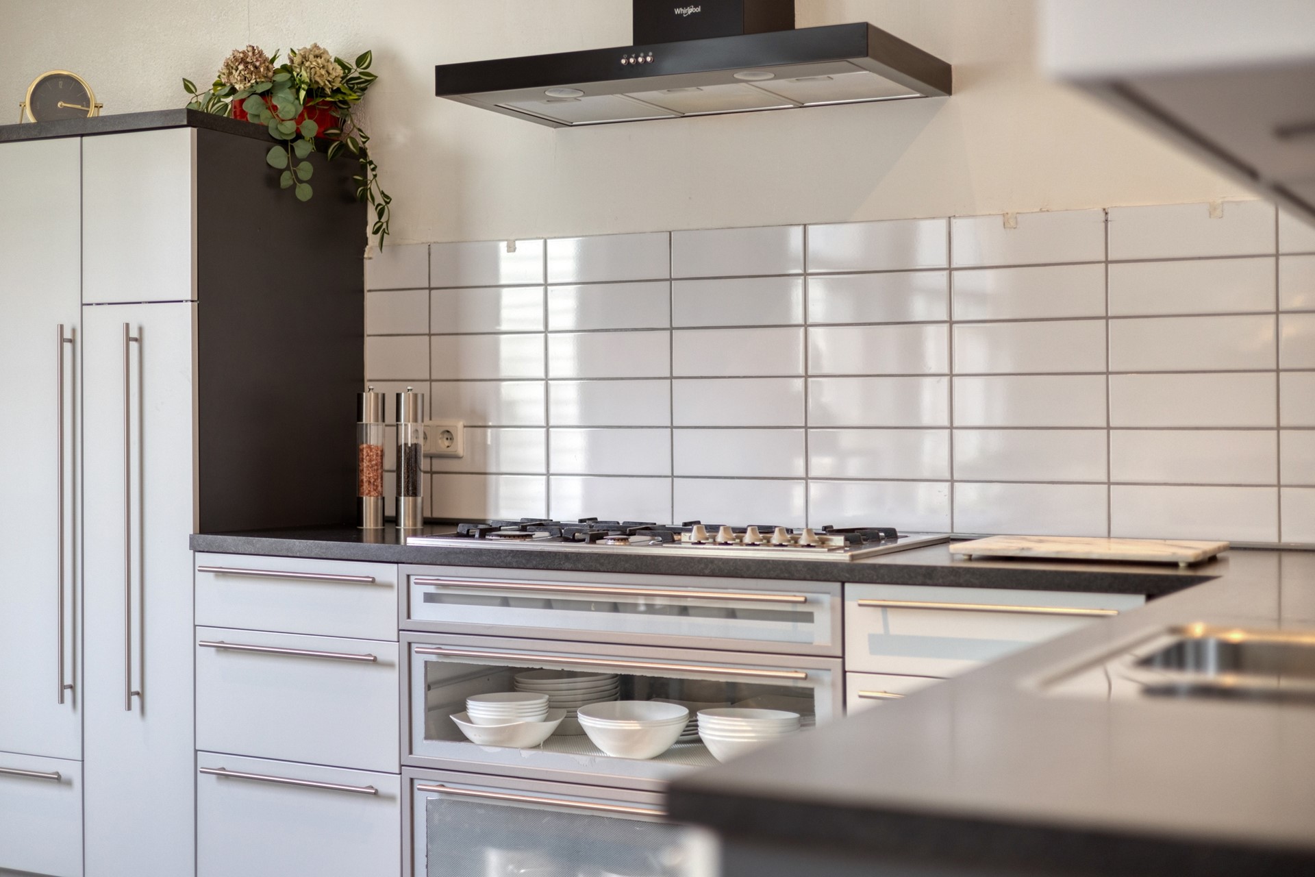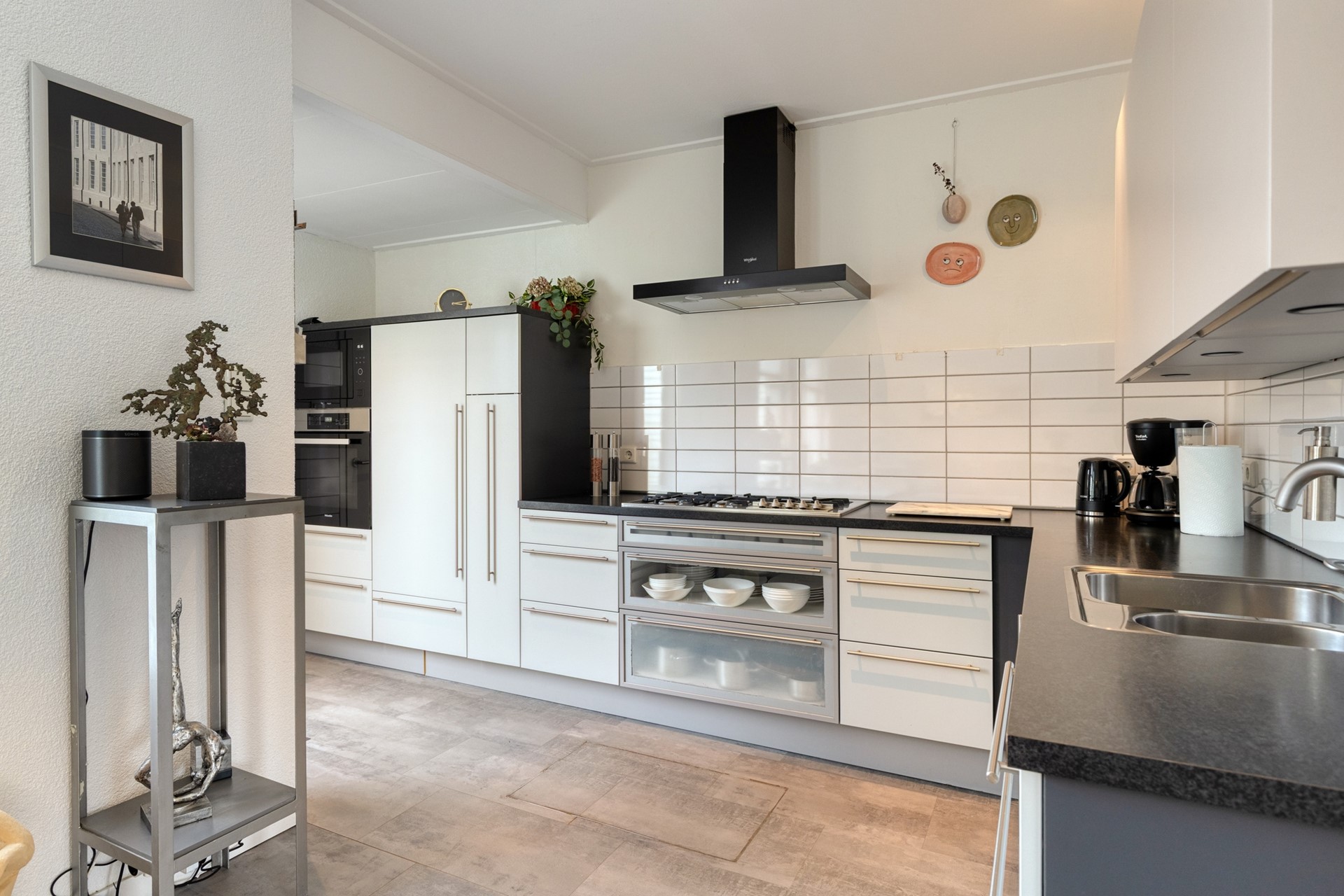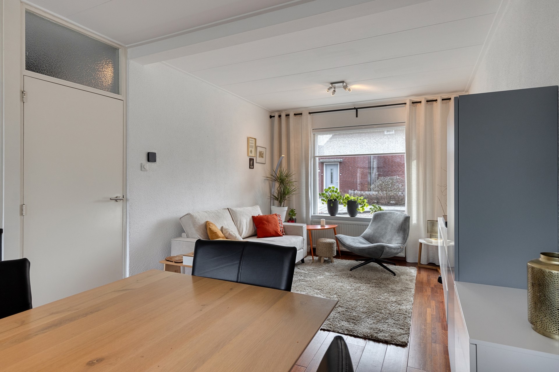 De lichte en sfeervolle woonkamer heeft een oppervlakte van ca. 22 m² en biedt een prettige leefruimte met een open doorgang naar de keuken. De zithoek bevindt zich aan de voorzijde, terwijl de eethoek grenst aan de open keuken. De keuken (ca. 9 m²) is voorzien van een nette keukenopstelling en is deels vernieuwd in 2025. De inbouwapparatuur bestaat onder andere uit een gaskookplaat, afzuigkap, oven, magnetron, vaatwasser en koelkast. Vanuit de keuken heeft u direct toegang tot de tuin. Aangrenzend bevindt zich de praktische bijkeuken met aansluitingen voor wasmachine en droger, ideaal voor extra opslag en huishoudelijk gemak.