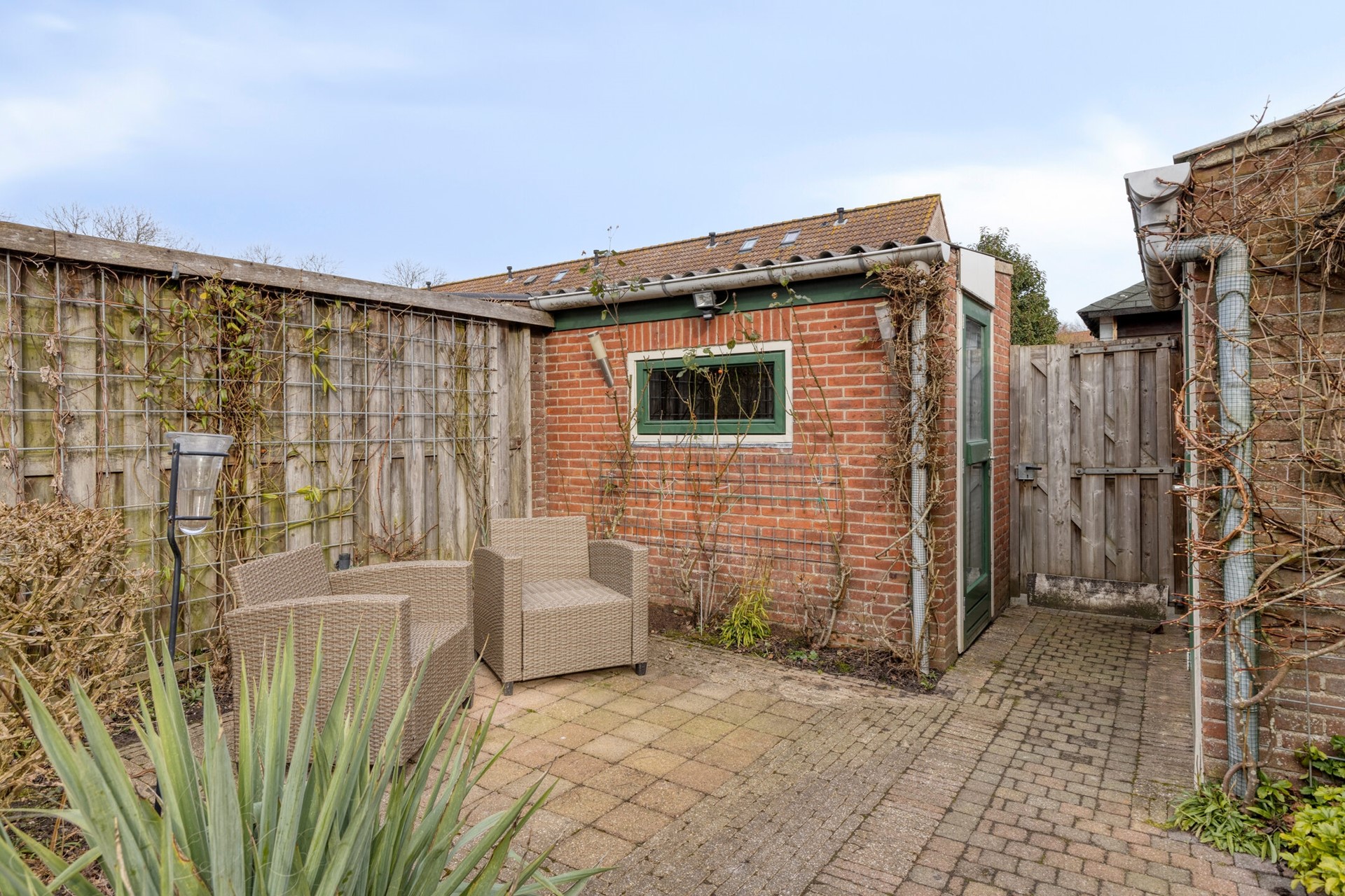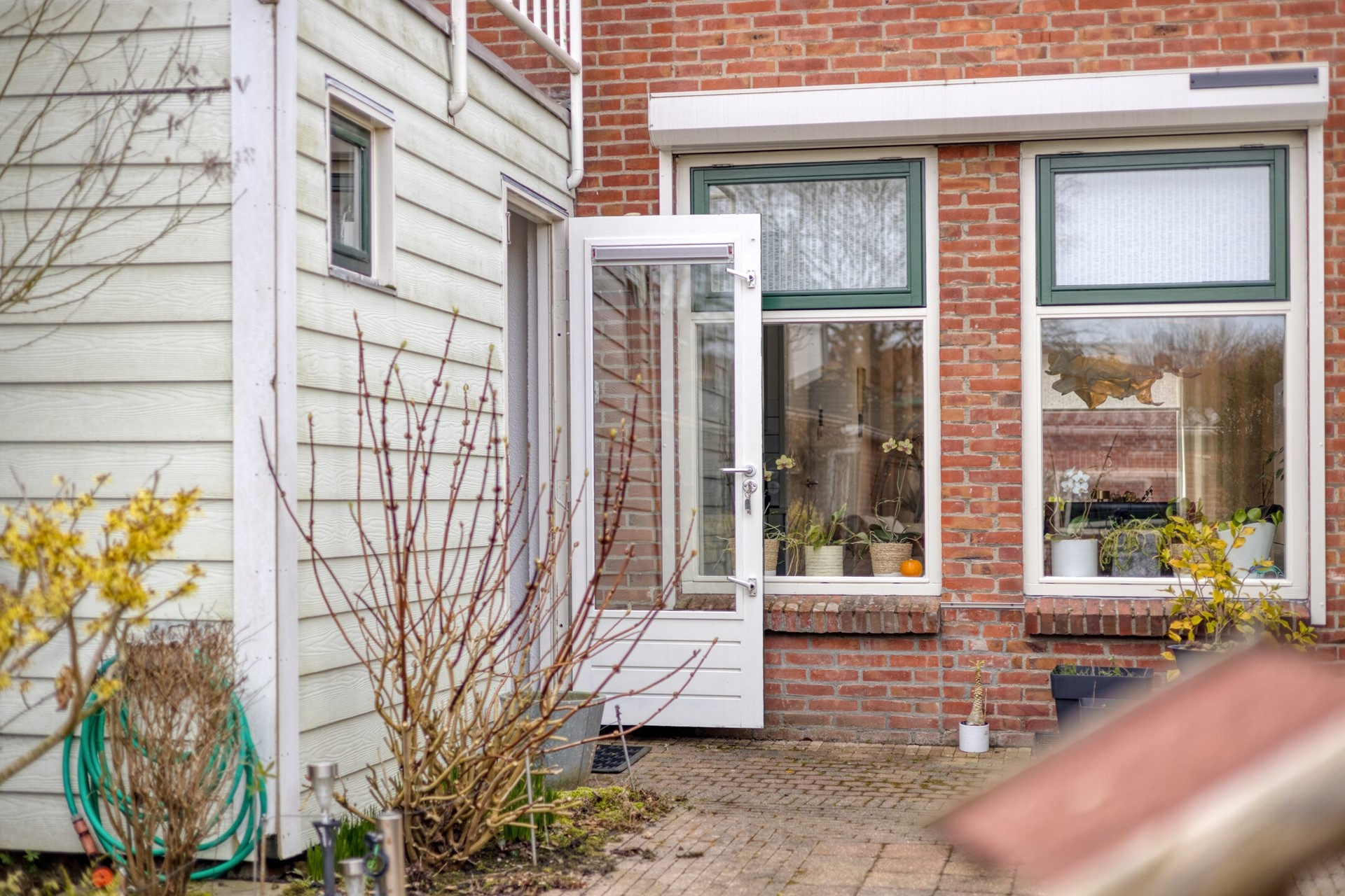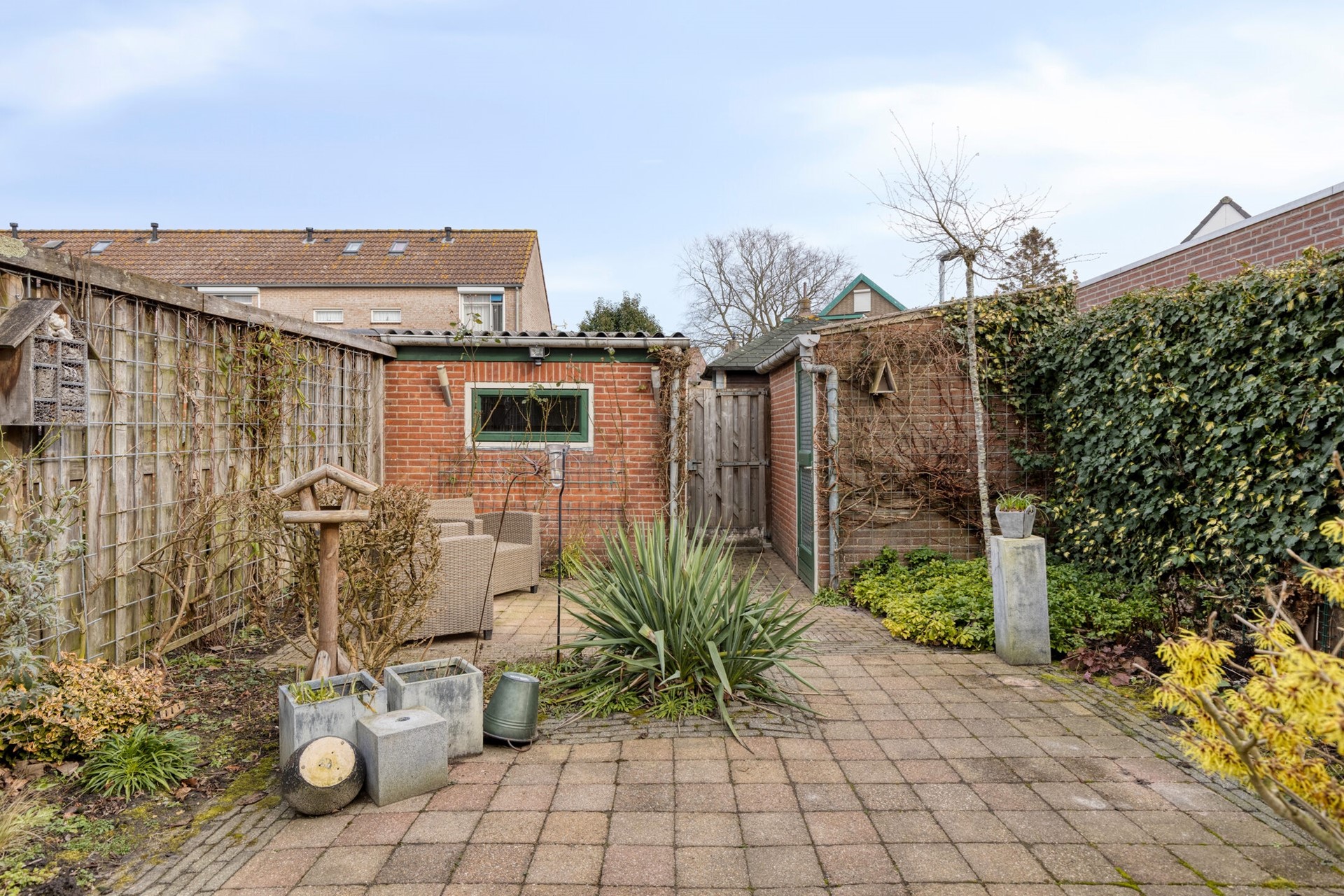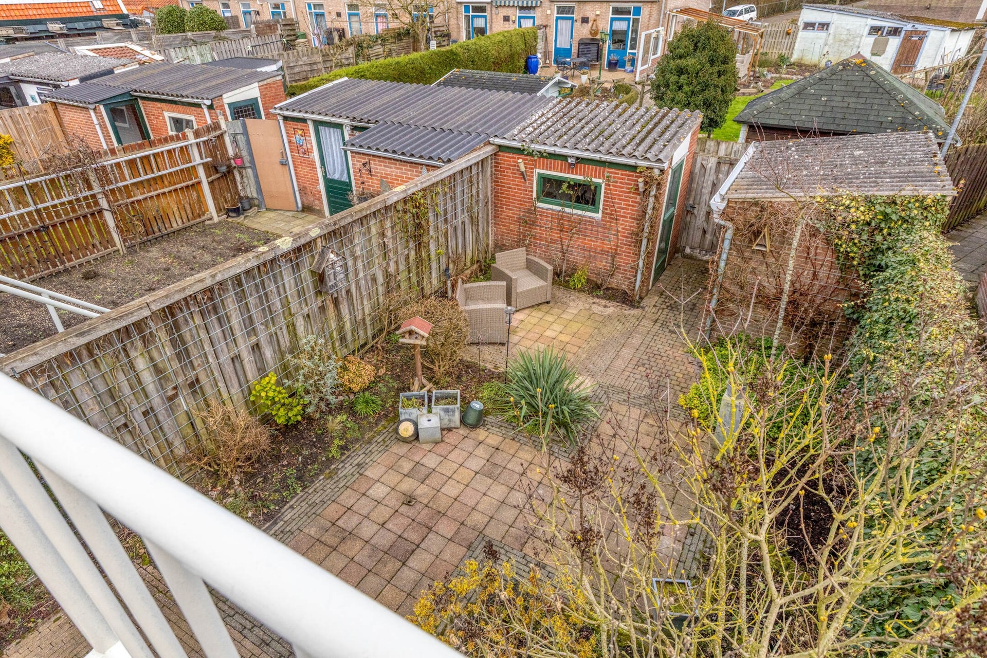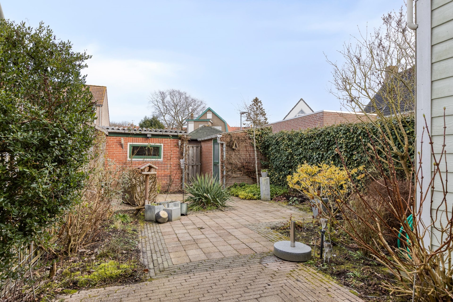 De ruime achtertuin is gelegen op het oosten en biedt goede bezonningsmogelijkheden. De tuin is aangelegd met bestrating en vaste beplanting en vormt een fijne plek voor ontspanning, spelende kinderen of een gezellige barbecue. Achter in de tuin bevinden zich twee stenen bergingen van ca. 5 m² en 4,5 m², perfect voor fietsen, gereedschap en opslag. Daarnaast beschikt de woning over een vrije achterom.