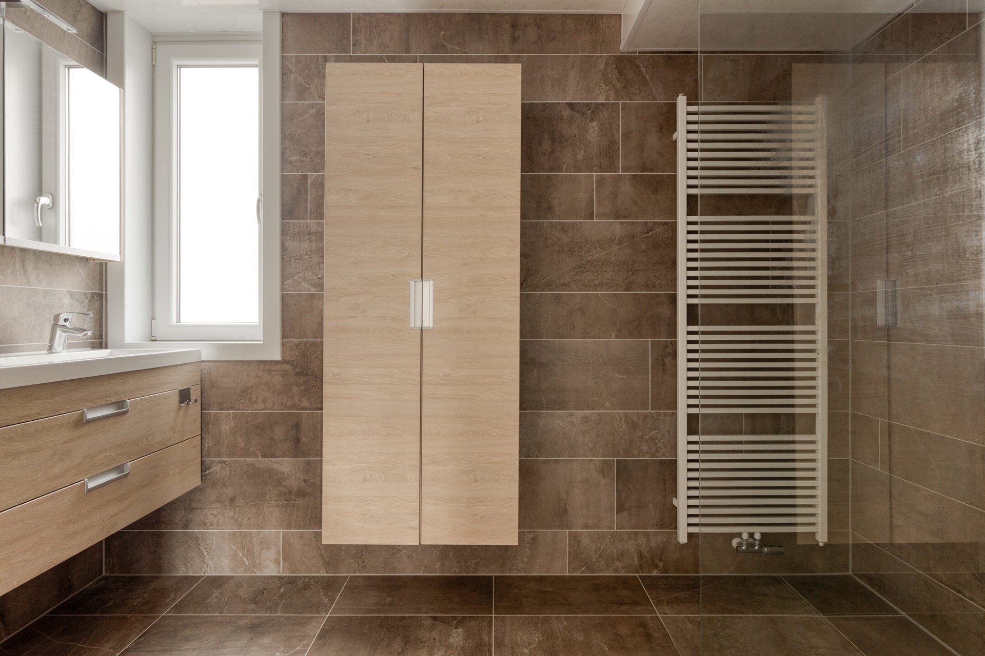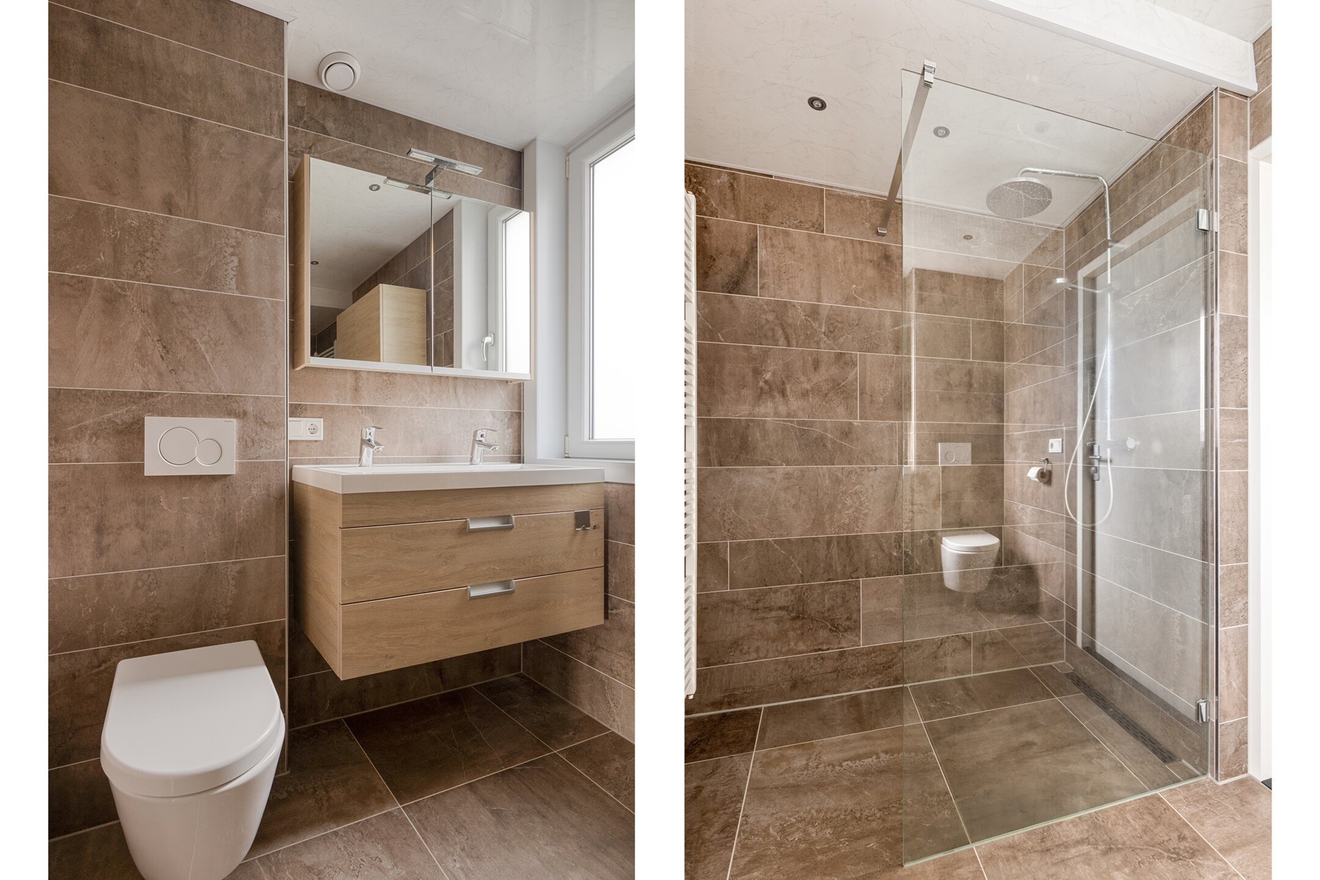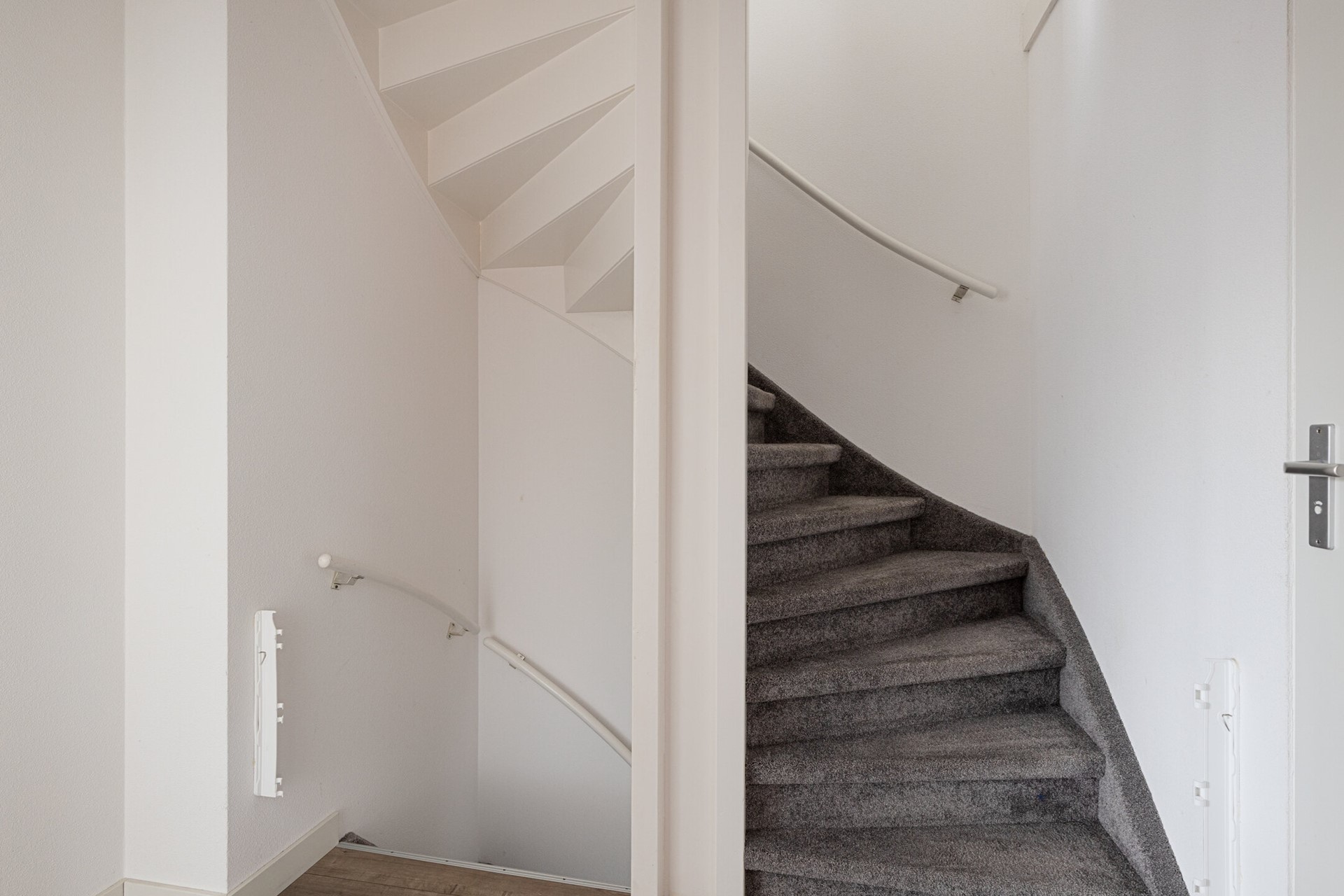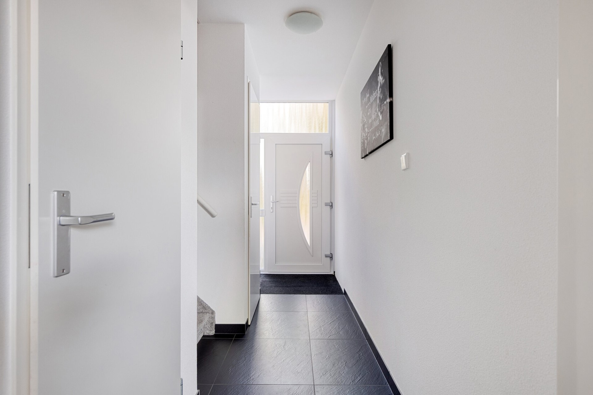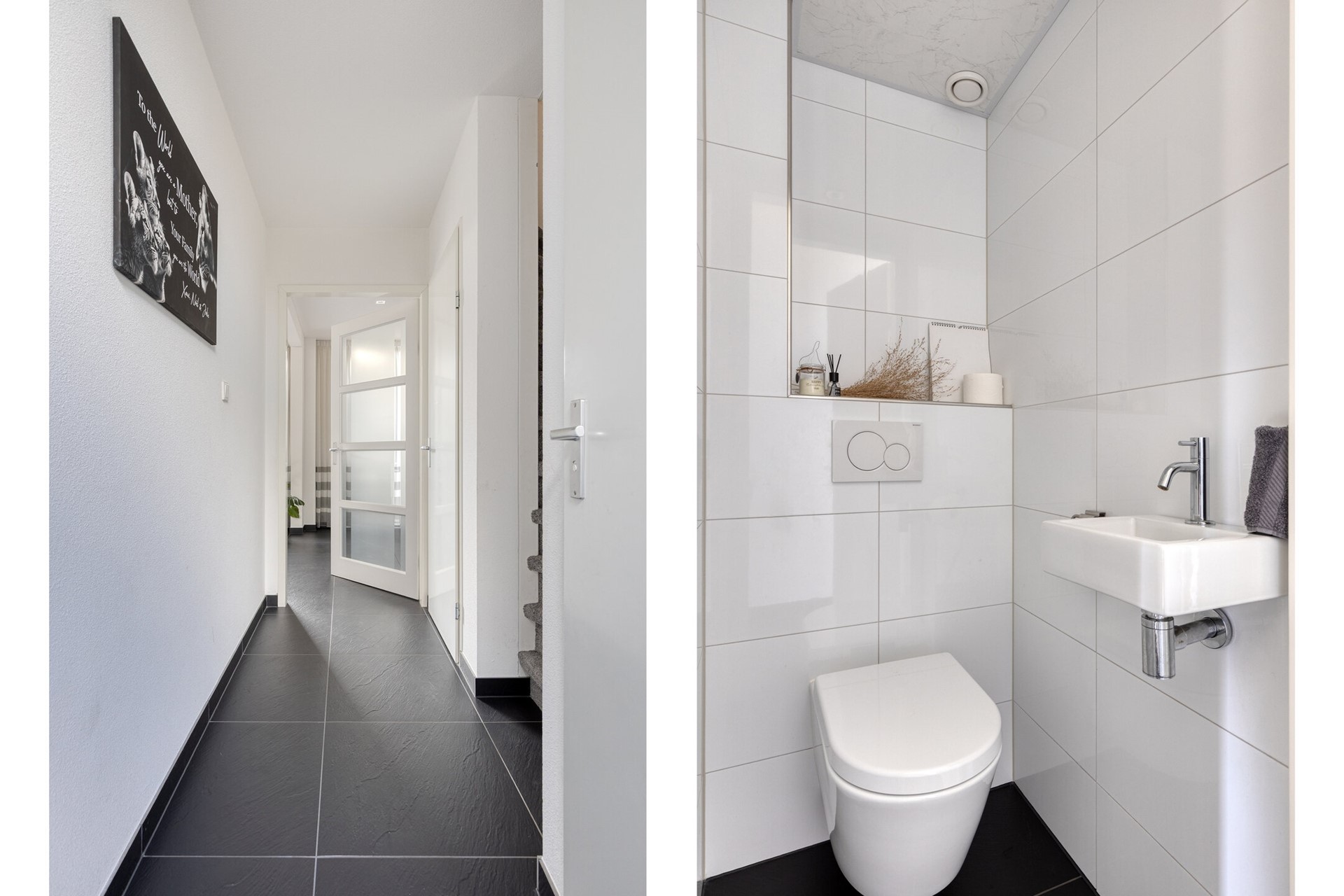 Je komt de woning binnen via de hal met meterkast, toilet, trapkast en trapopgang naar de bovenliggende verdiepingen. Het toilet is modern afgewerkt en voorzien van een hangtoilet en fonteintje. In de trapkast bevindt zich de unit voor de vloerverwarming.