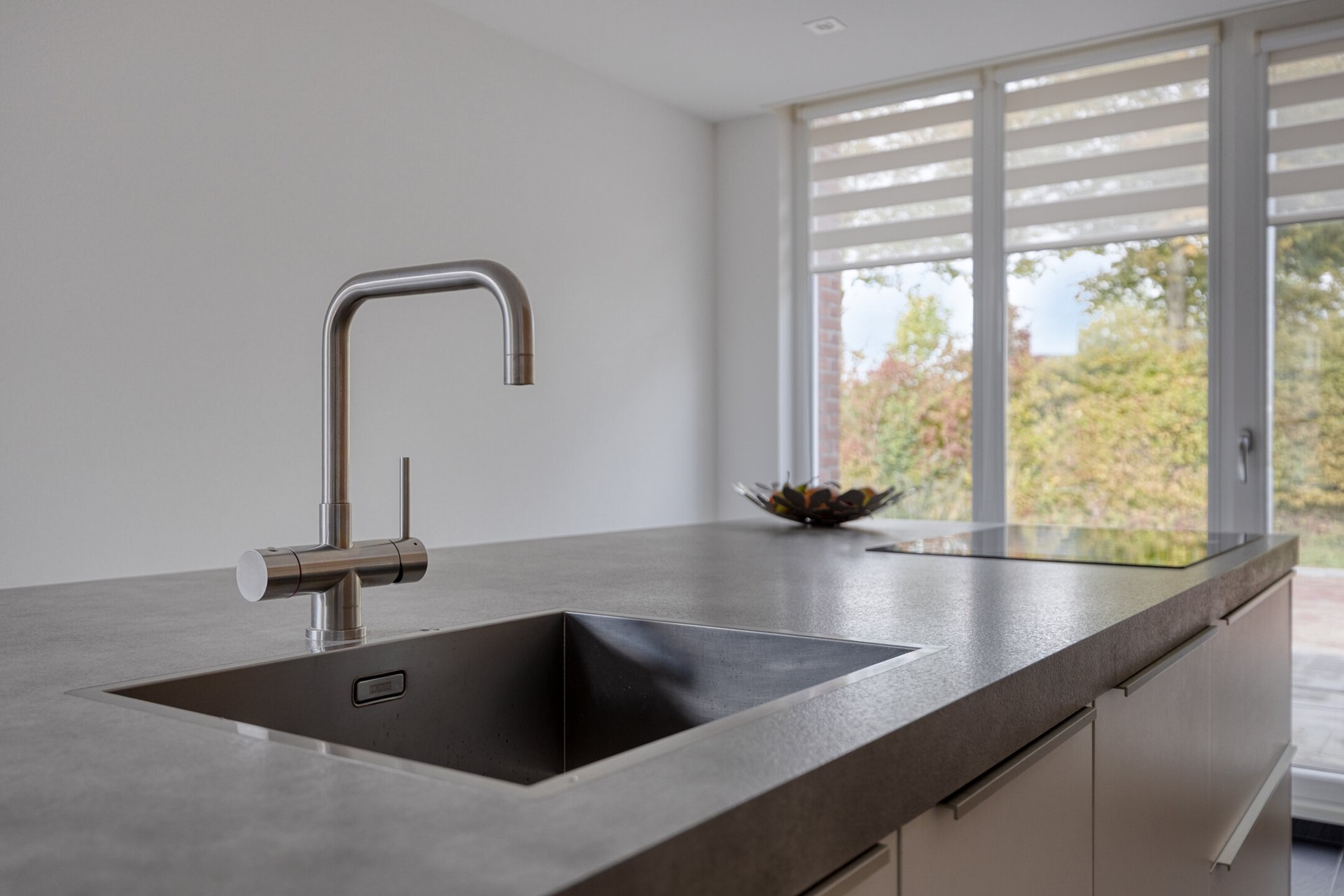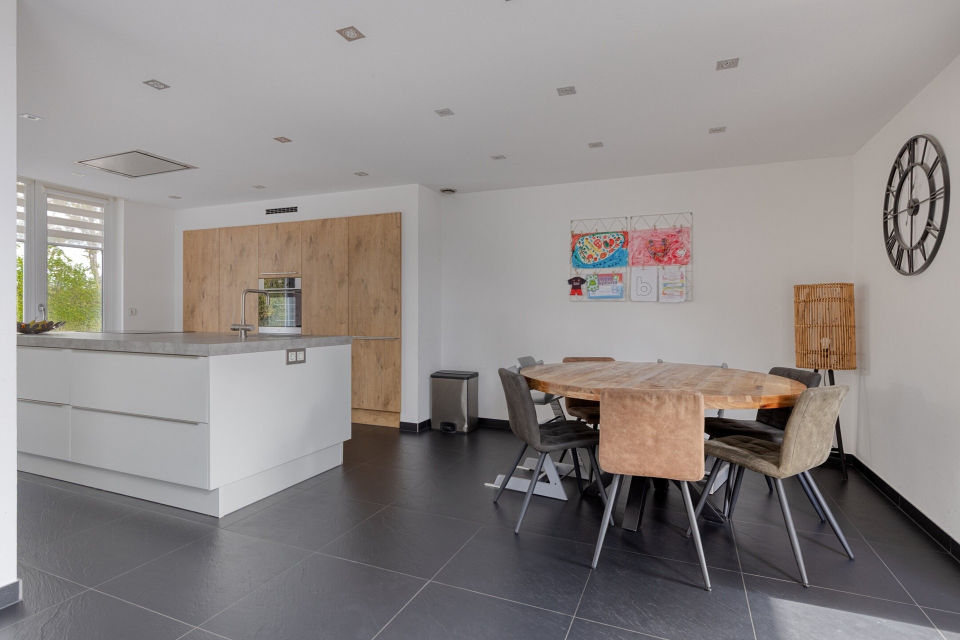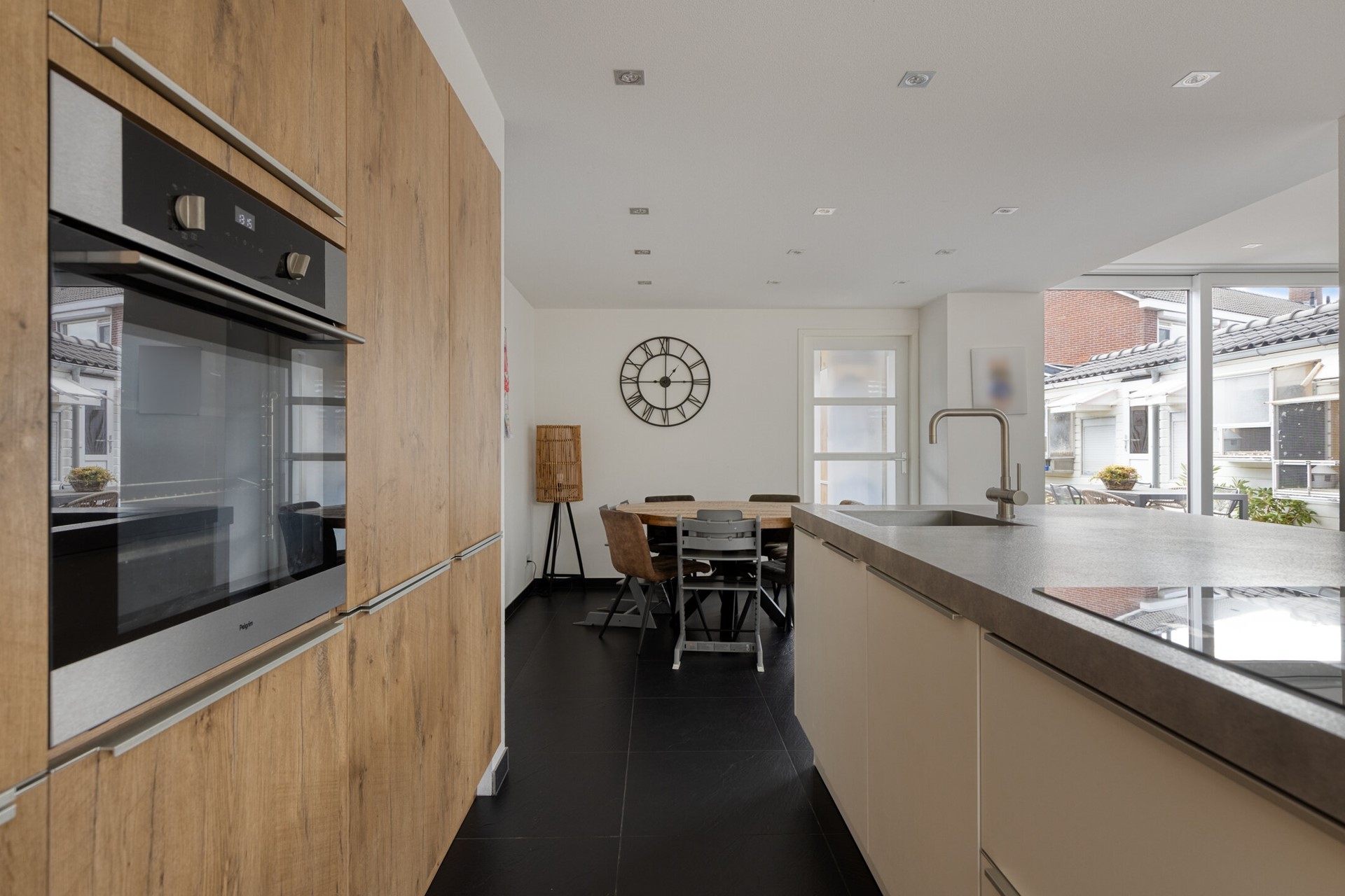 De moderne woonkeuken is met ca. 24 m2 een echte eyecatcher en vormt het hart van het huis. Uitgerust met een kook-spoeleiland en een kastenwand met inbouwapparatuur is dit een heerlijke plek om te koken en gezellig na te tafelen. In de keukenruimte bevindt zich tevens de ruime eethoek. De ruimtes hebben een fraaie vloer- en wandafwerking en dankzij de grote raampartijen geniet je hier de hele dag van natuurlijk licht.