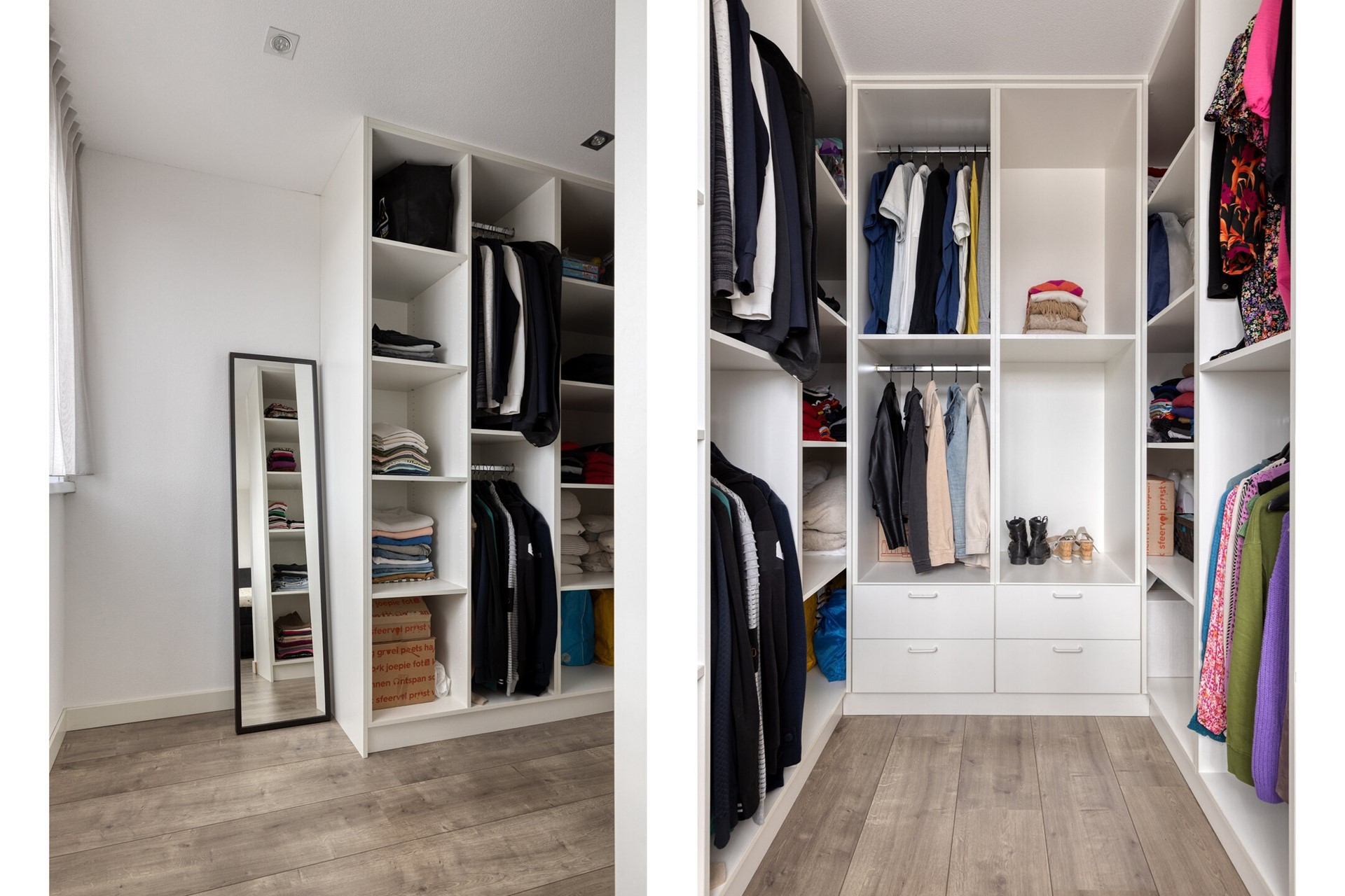 De eerste verdieping beschikt over een overloop, twee slaapkamers, inloopkast en een badkamer. De slaapkamers hebben afmetingen van ca. 10 m2 en ca. 14 m2. In de voormalige slaapkamer aan de achterzijde is een walk-in-closet gerealiseerd met een open verbinding naar de slaapkamer. De badkamer is vergroot en heeft een oppervlakte van ca. 5,6 m2. De badkamer is strak vormgegeven, keurig afgewerkt en beschikt over een inloopdouche, toilet en een dubbel wastafelmeubel.