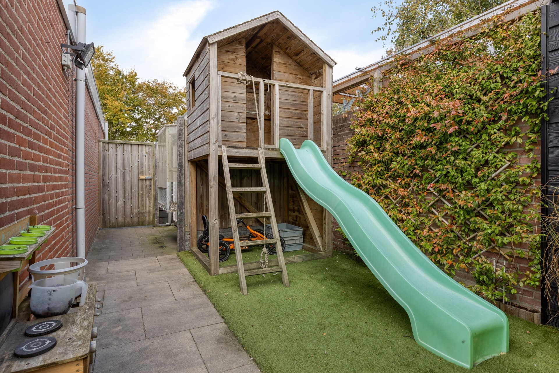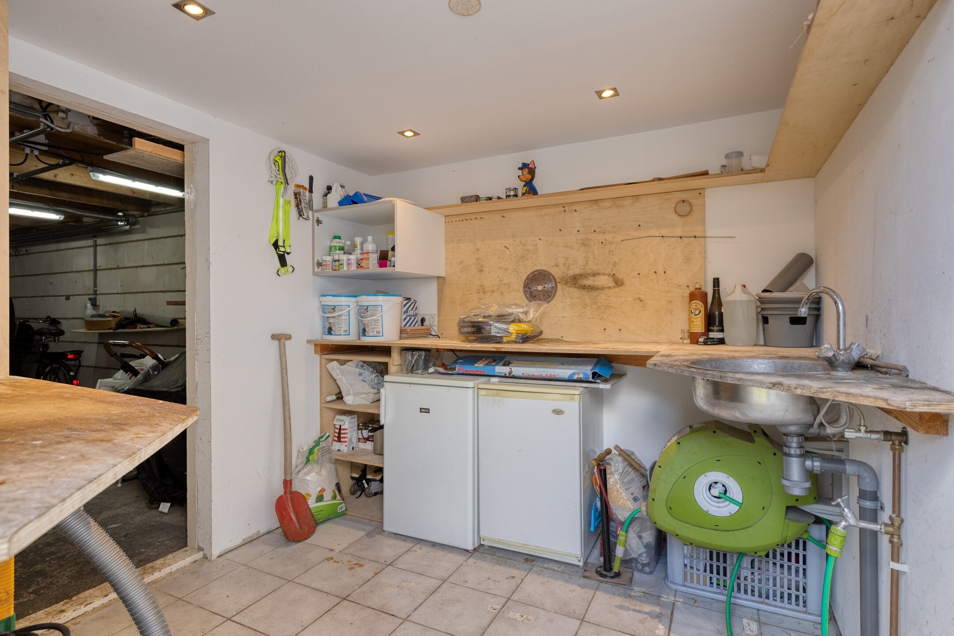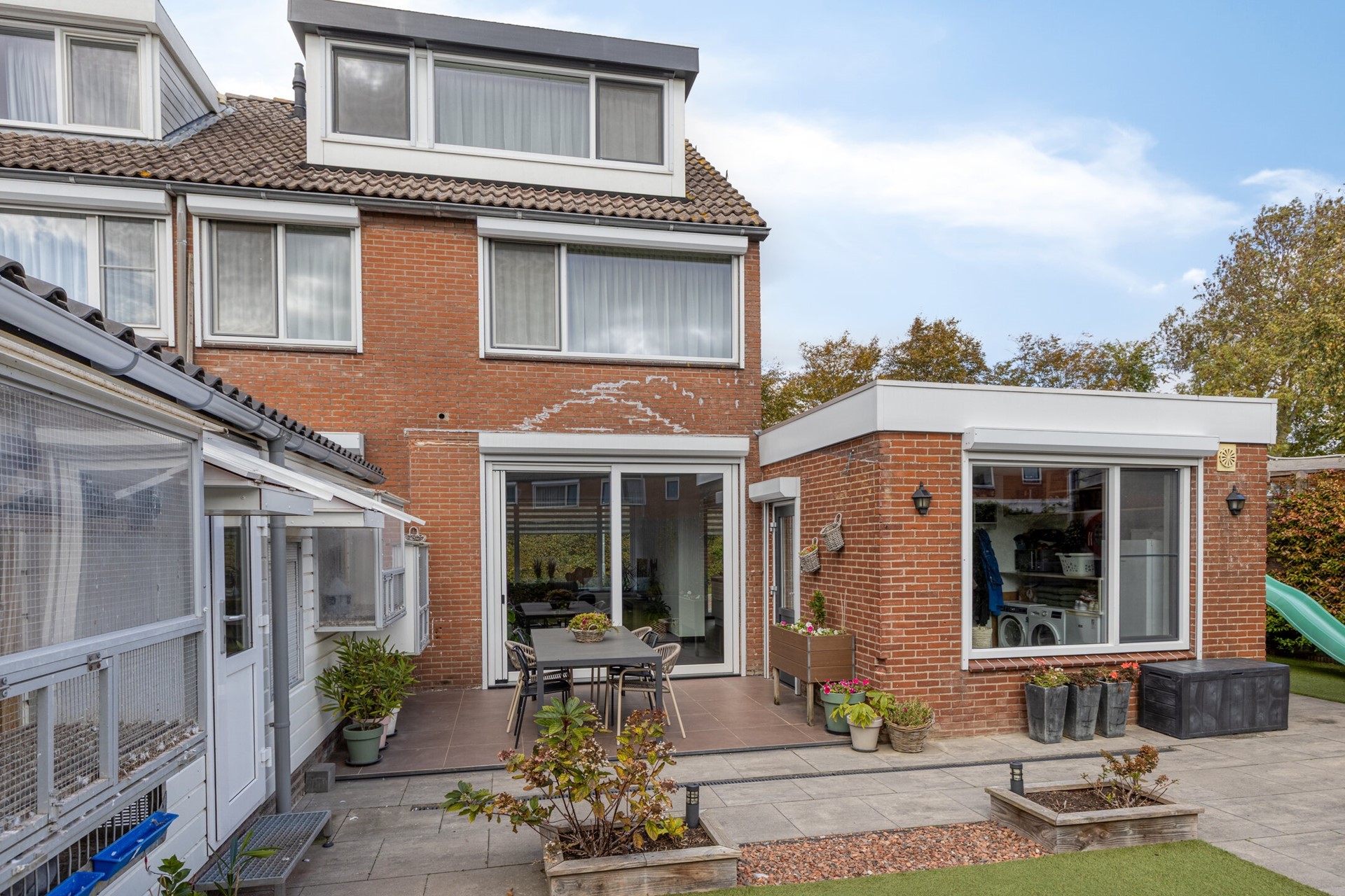 Aangrenzend vind je de praktische bijkeuken met toegang tot de tuin. Deze bijkeuken is voorzien van aansluitingen voor huishoudelijke apparatuur en is ideaal als extra bergruimte.