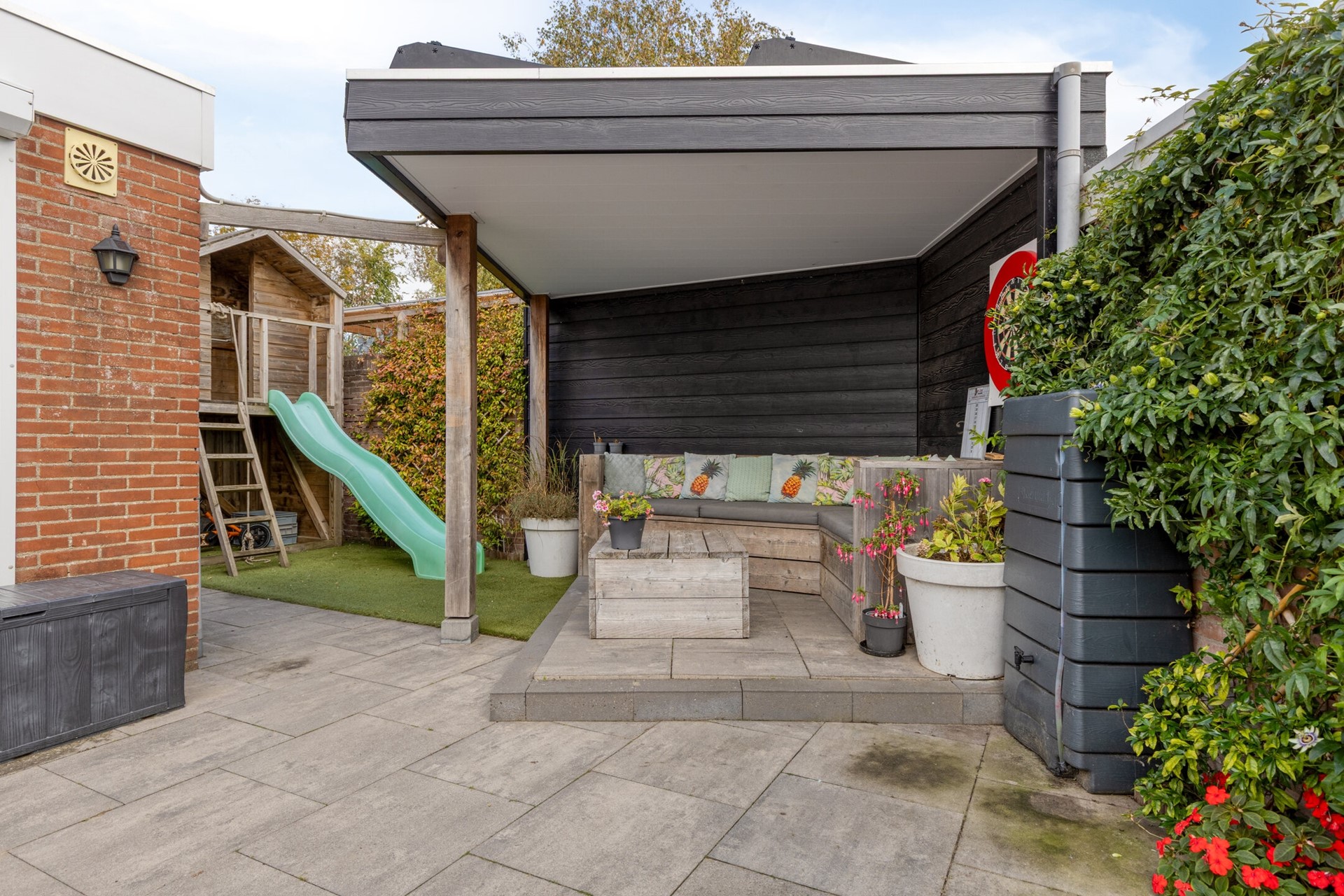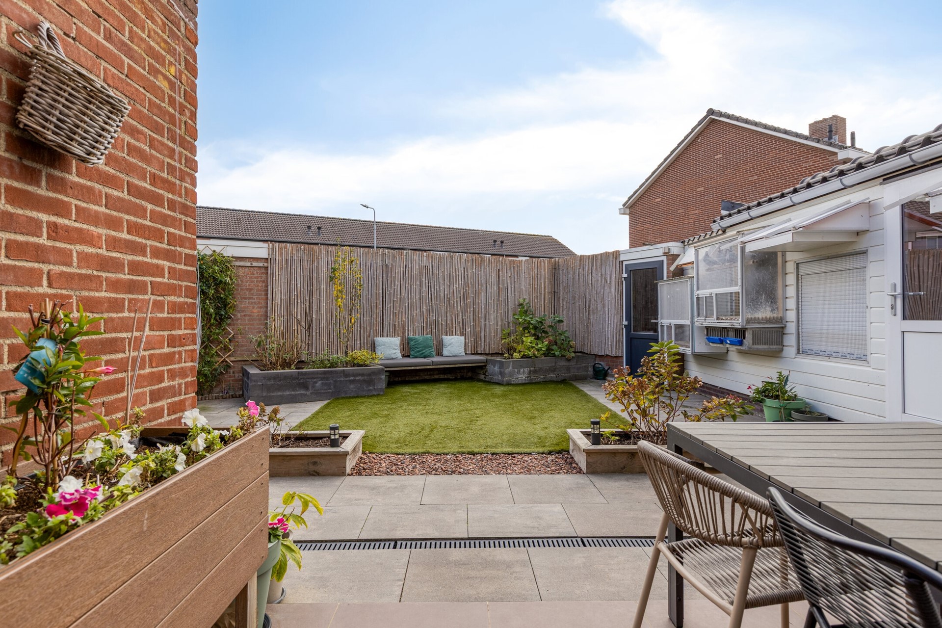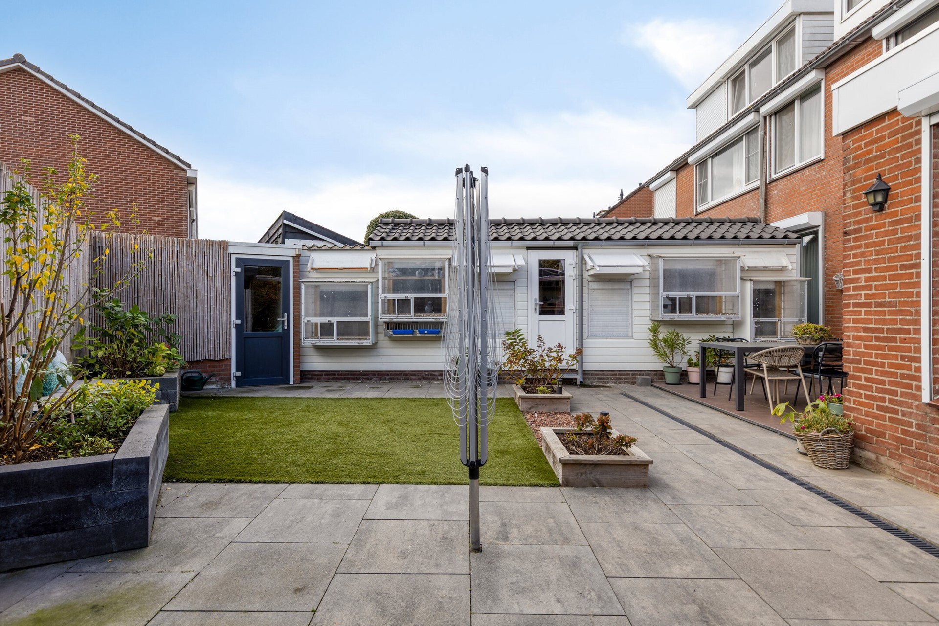 Aangrenzend vind je de praktische bijkeuken met toegang tot de tuin. Deze bijkeuken is voorzien van aansluitingen voor huishoudelijke apparatuur en is ideaal als extra bergruimte.
