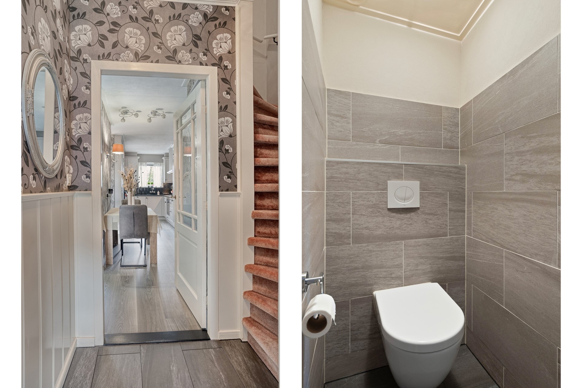 Via de entree kom je in de ruime hal met meterkast en toiletruimte. Het toilet is netjes afgewerkt met een hangtoilet en fonteintje.