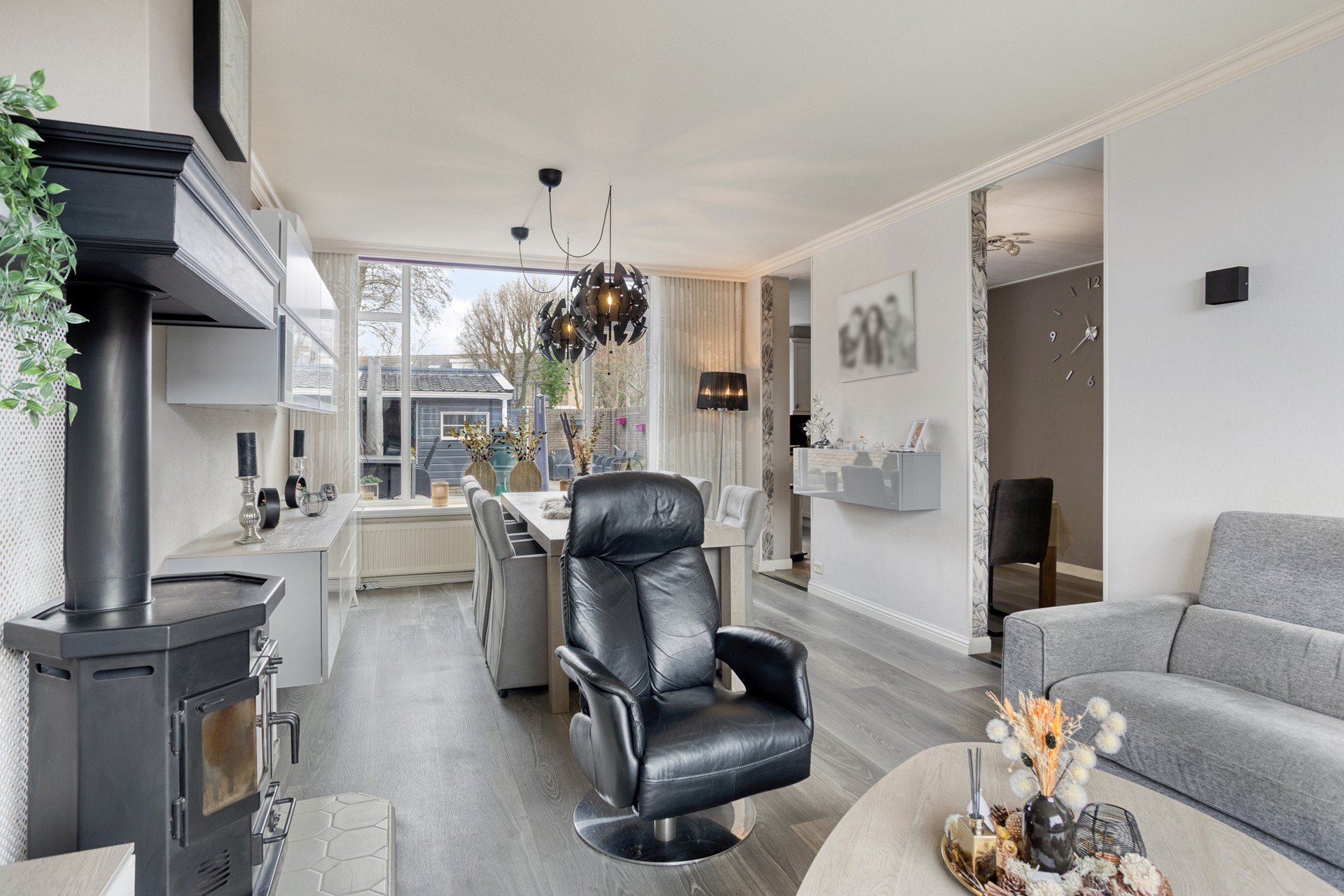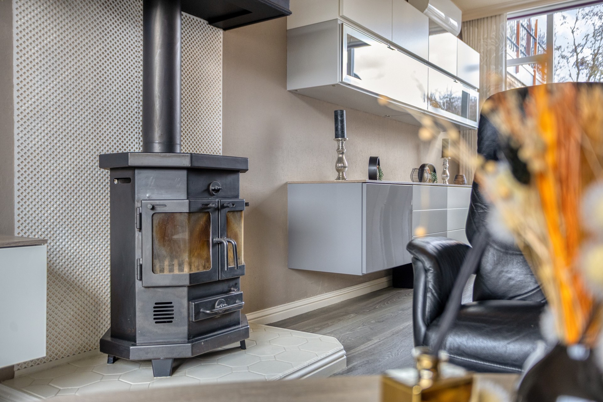 De lichte woonkamer beschikt over een gezellige zithoek aan de voorzijde en een eethoek aan de achterzijde, grenzend aan de open keuken. In de woonkamer is een sfeervolle houtkachel aanwezig.