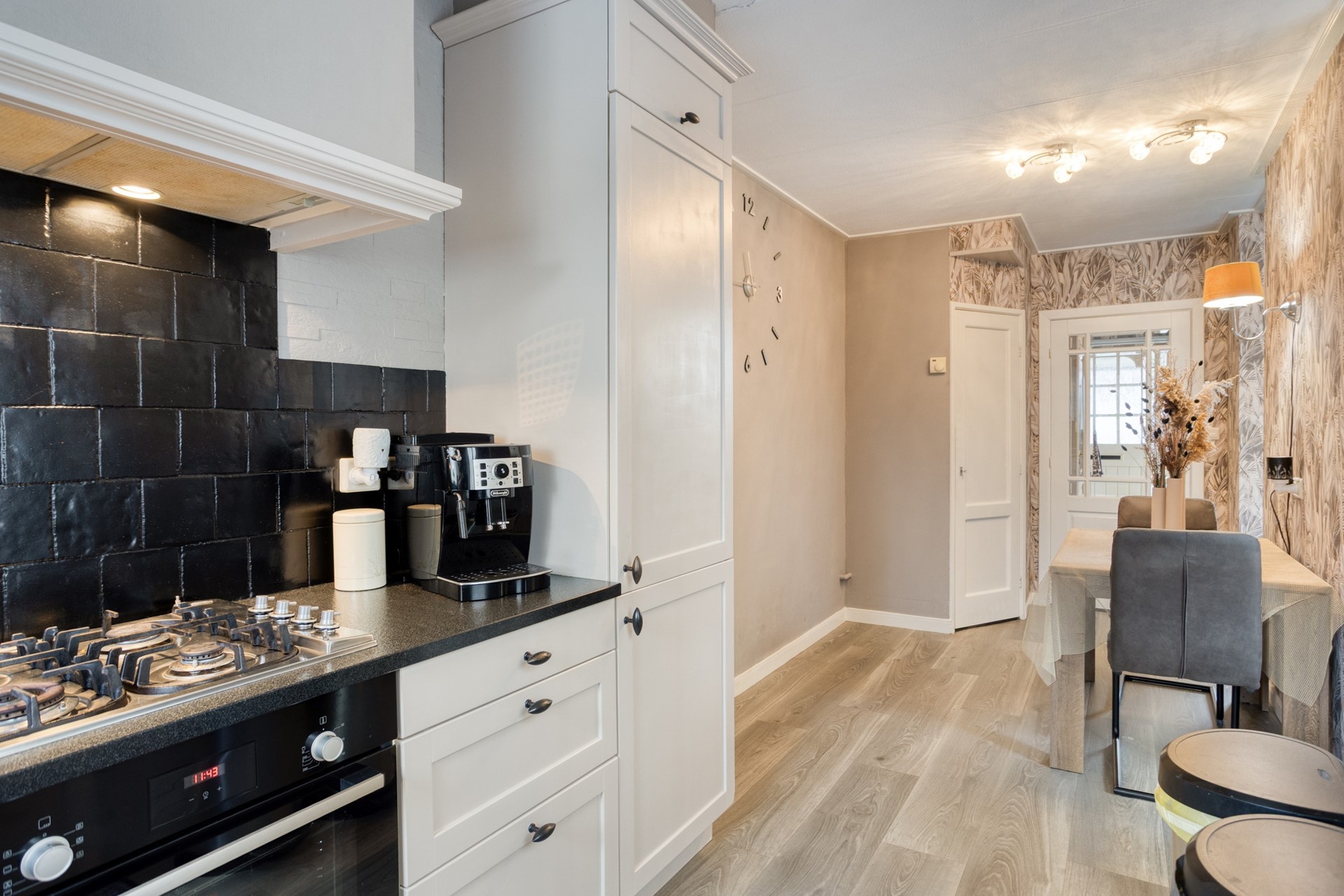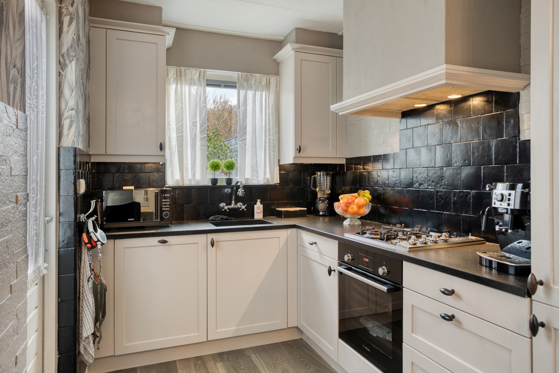 De keuken is uitgevoerd in landelijke stijl en voorzien van diverse inbouwapparatuur, waaronder een gaskookplaat, afzuigkap, oven, vaatwasser en koel-vriescombinatie. Daarnaast is er een praktische trapkast voor extra bergruimte. Vanuit de keuken is de tuin bereikbaar.