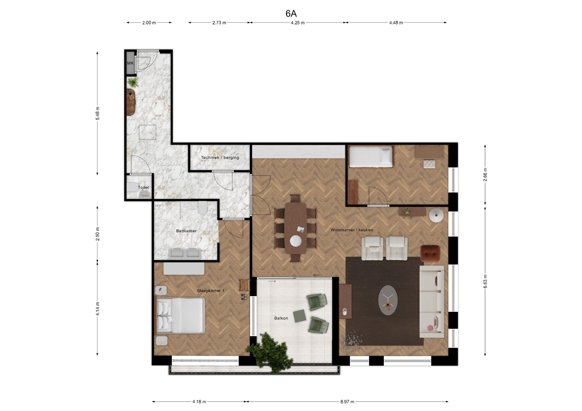 De grote woonkamer van ca. 57 m² met open keuken geeft toegang tot een op het zuiden gelegen balkon.