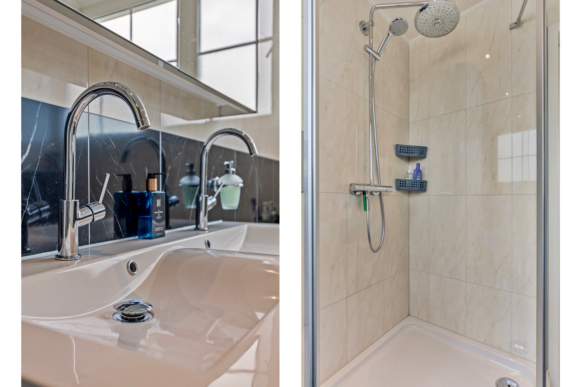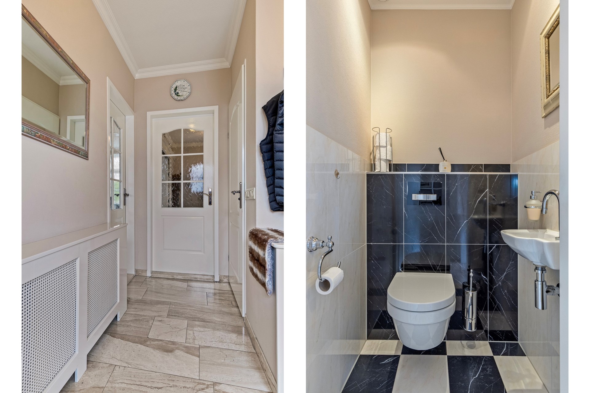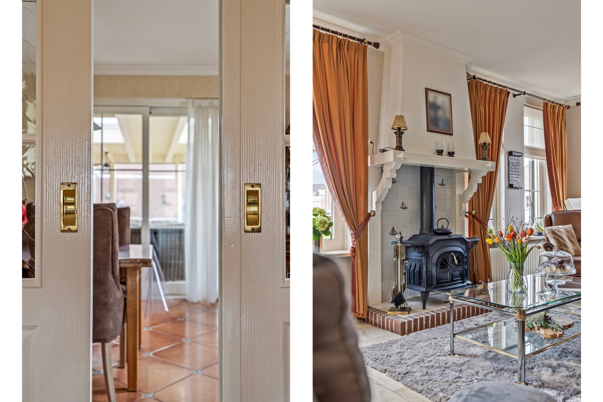 In de ruime hal bevinden zich de meterkast en het toilet, dat keurig is afgewerkt met een hangtoilet en fonteintje. De riante woonkamer is een sfeervolle, lichte leefruimte met meerdere raampartijen, waardoor er veel daglicht binnenkomt. De fraaie natuurstenenvloer met vloerverwarming en de gezellige schouw met houtkachel zorgen voor optimaal comfort. Middels schuifdeuren kan de woonkamer en de woonkeuken van elkaar worden gescheiden.