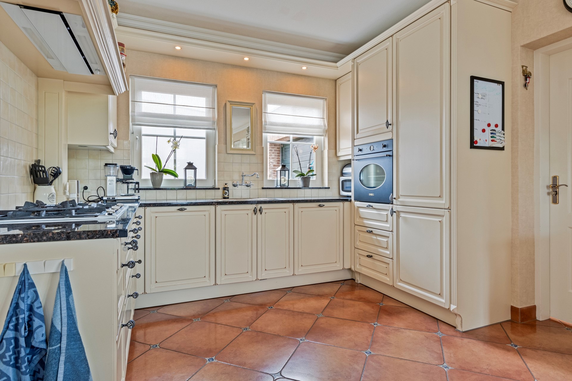 De grote woonkeuken van ca. 25 m² is voorzien van een fraaie landelijke keukenopstelling en moderne inbouwapparatuur – een droom voor kookliefhebbers. De ruimte biedt voldoende plek voor een grote eettafel. Via de schuifpui is er direct toegang tot de serre. Aangrenzend treft je de praktische bijkeuken met keukenblok en aansluitingen voor huishoudelijk apparatuur.