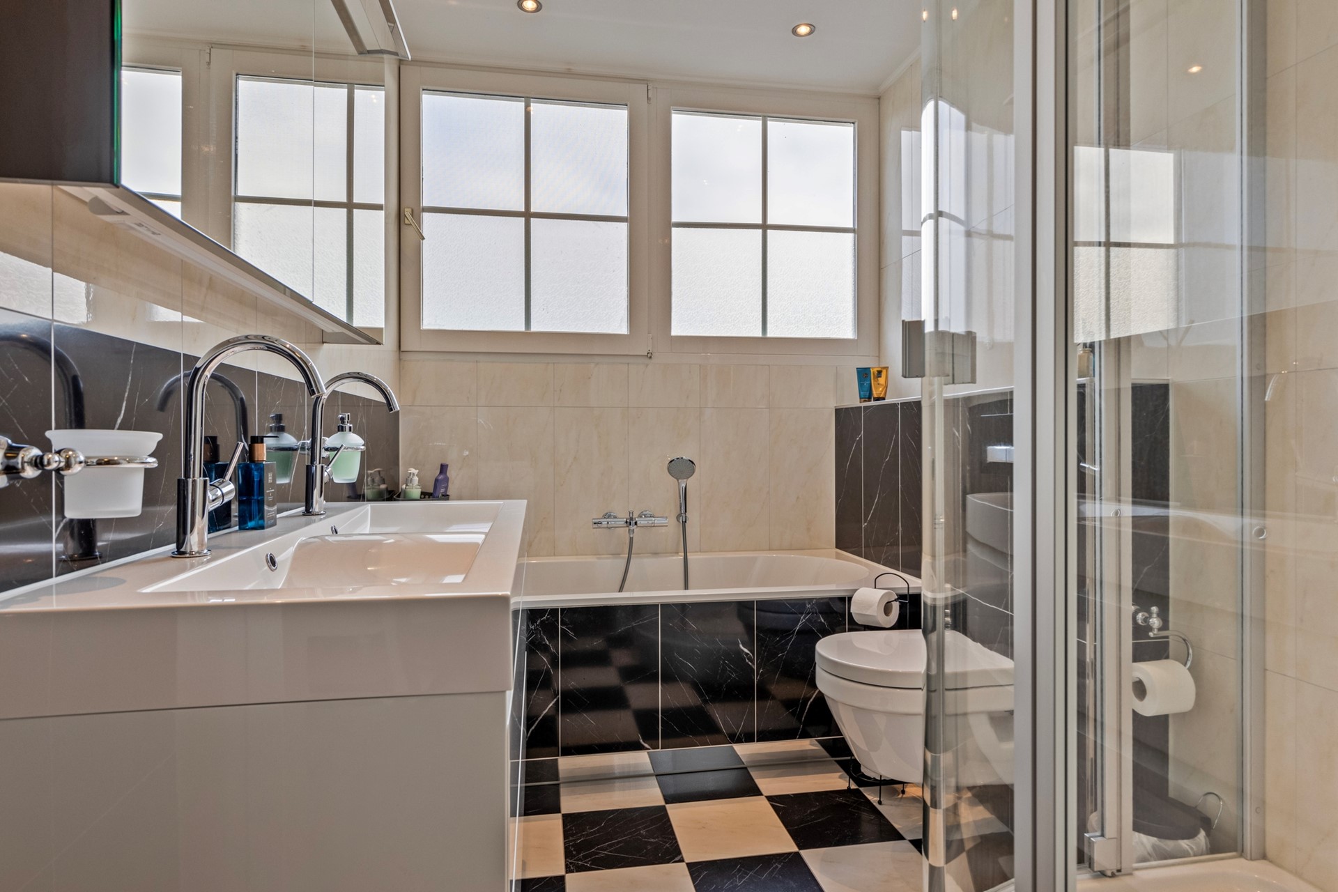 Ook op de eerste verdieping is volop ruimte. Hier bevinden zich een overloop, vier slaapkamers en een badkamer. De slaapkamers zijn ruim en praktisch ingedeeld. De grootste slaapkamer beschikt over een inloopkast. De badkamer is netjes onderhouden, compleet uitgevoerd en voorzien van alle gemakken. De badkamer beschikt over een douchehoek, ligbad, toilet en dubbele badkamermeubel.