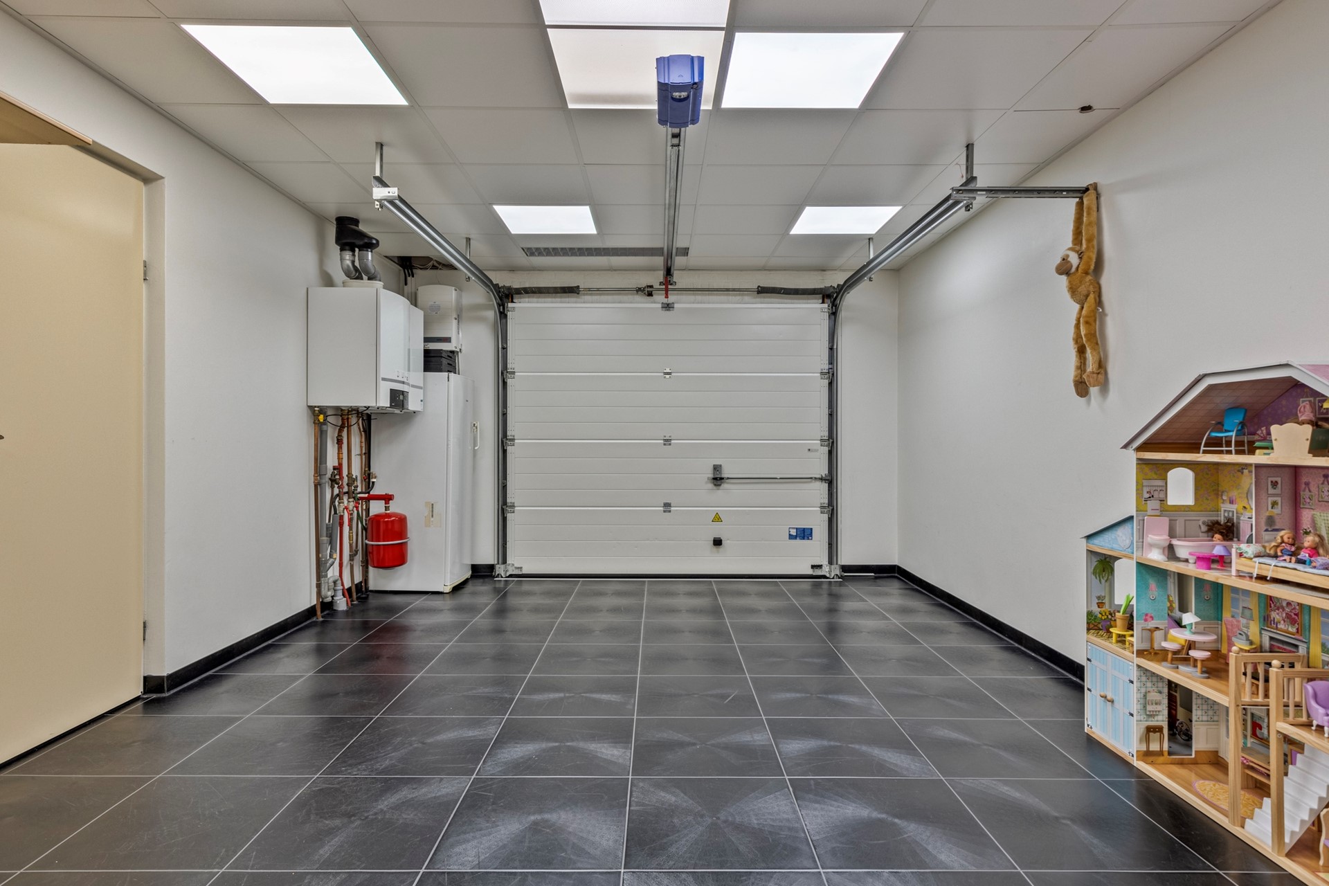 De ruime garage heeft een oppervlakte van ca. 27,5 m2 en beschikt over de cv-installatie (2010) en de omvormer voor de zonnepanelen. Daarnaast beschikt de garage over een elektrische garagedeur, verwarming en een volledig betegelde vloer. Aan de voorzijde is een grote oprit met ruimte voor het parkeren van de auto op eigen terrein. Achter de garage bevindt zich een aparte berging voor fietsen en extra opslag.