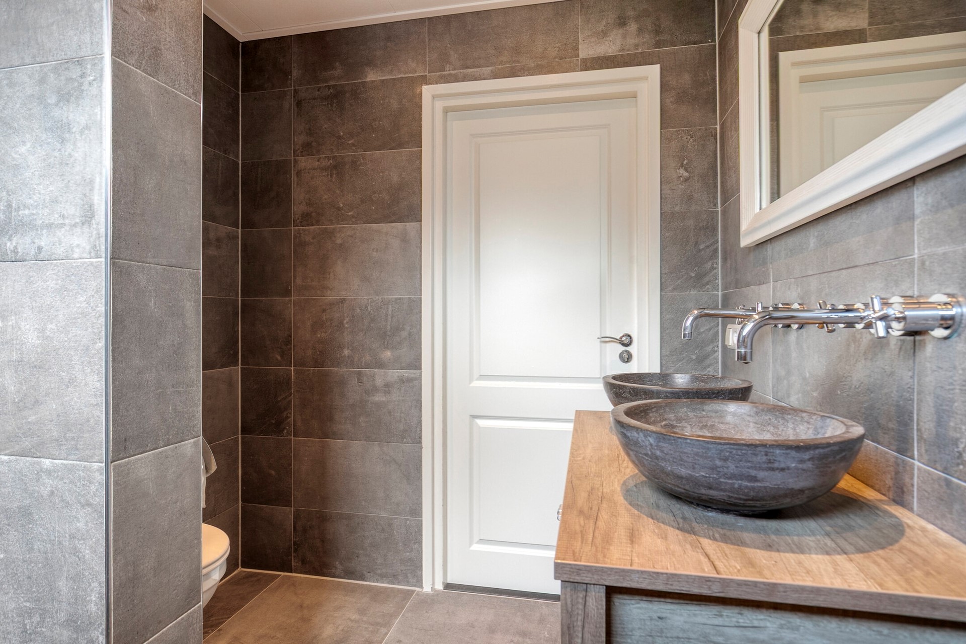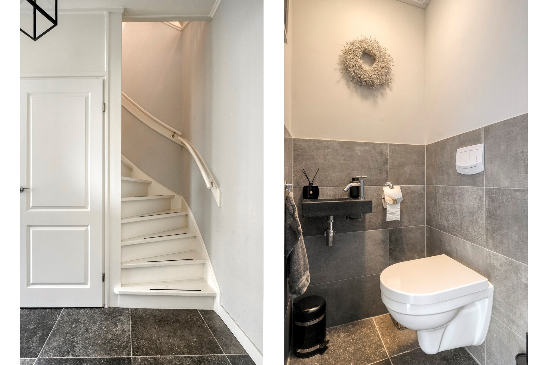 In de ruime hal bevinden zich de meterkast, het toilet en trapopgang naar de eerste verdieping. Het toilet is keurig uitgevoerd met een hangtoilet en een fonteintje.