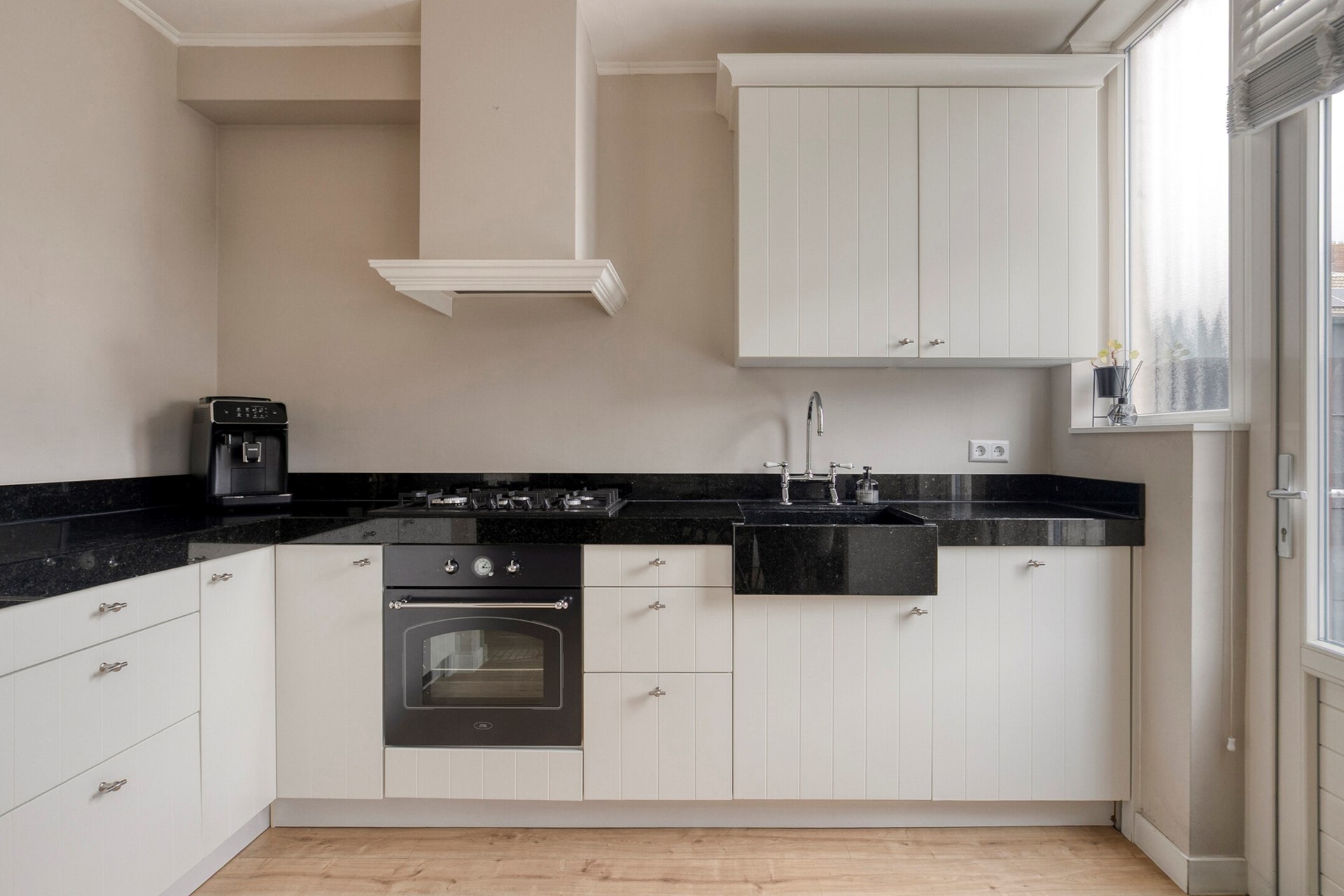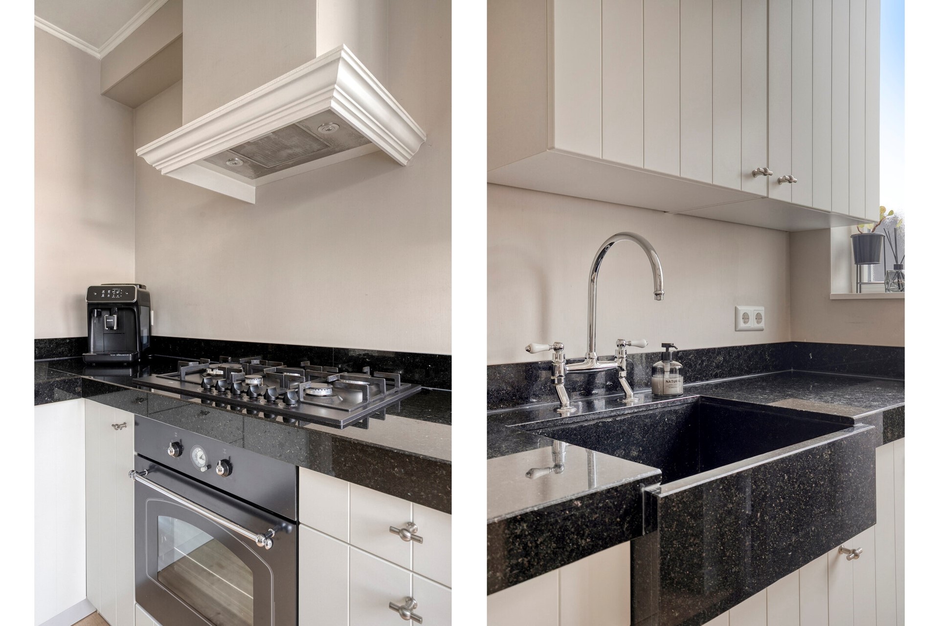 De ruime doorzonwoonkamer is heerlijk licht dankzij de grote raampartijen en biedt volop ruimte voor een gezellige zithoek aan de voorzijde van de woning. De eethoek is geplaatst aan de achterzijde naast de open verbinding met de keukenruimte. De fraaie landelijke keuken is voorzien van alle wenselijke inbouwapparatuur, waaronder een gaskookplaat, afzuigkap, koel-vriescombinatie, vaatwasser en oven. Vanuit de keuken is directe toegang tot de tuin.