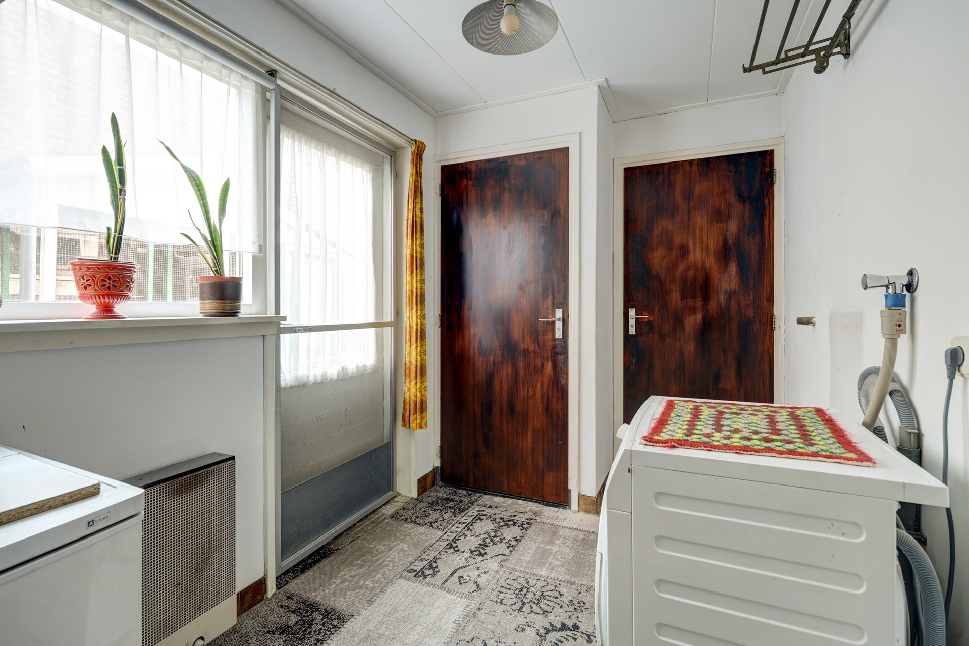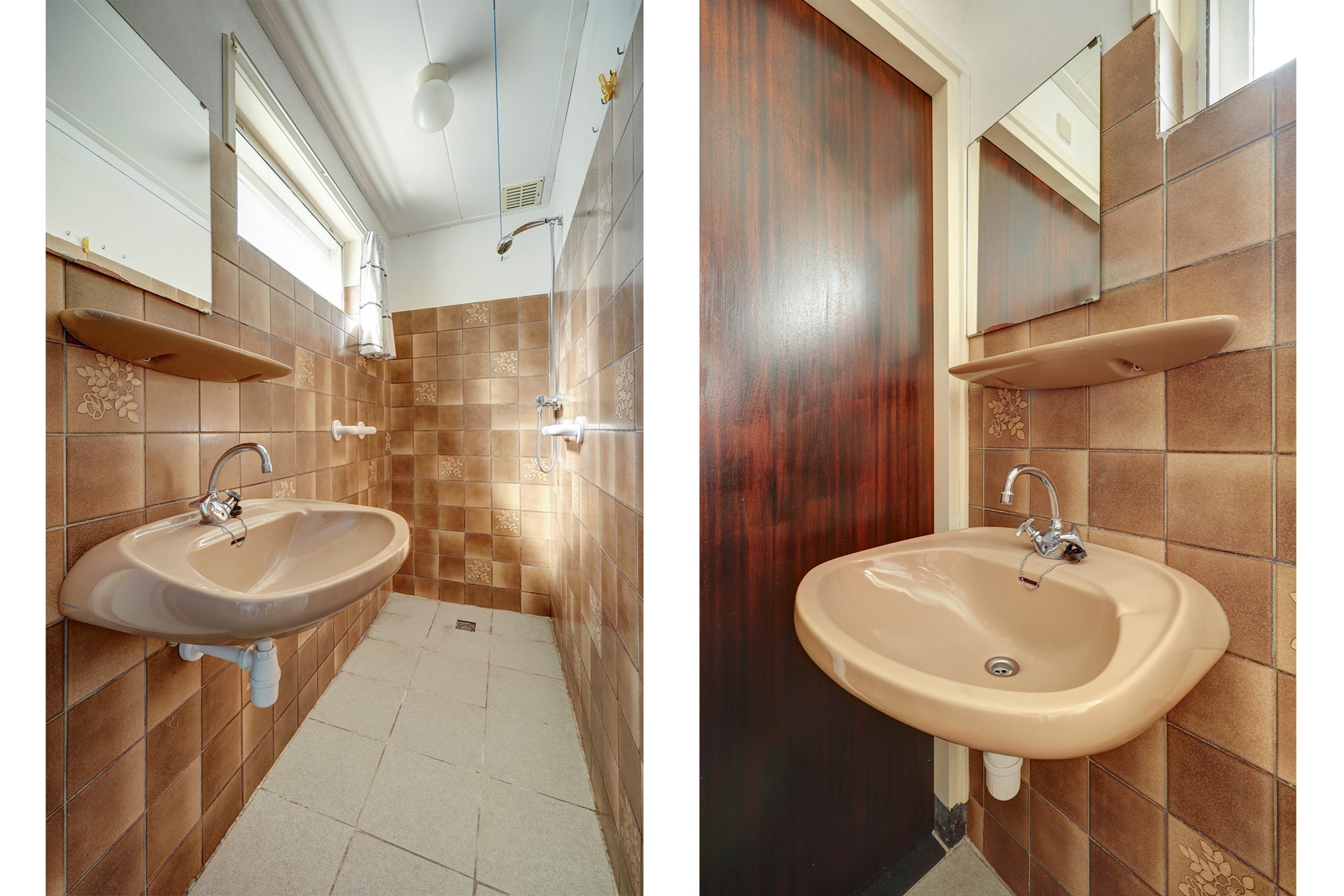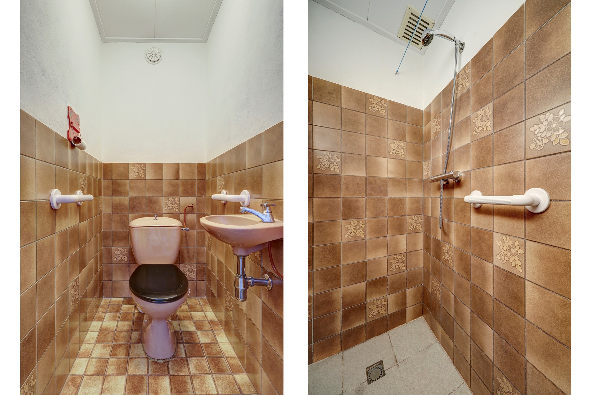 Achter de keuken bevindt zich de aanbouw met de bijkeuken, waar tevens de badkamer is gesitueerd. De compacte badkamer is voorzien van een douche en wastafel en heeft een oppervlakte van ca. 2 m2. Daarnaast is er een separaat toilet en zijn in de bijkeuken de aansluitingen voor huishoudelijke apparatuur aanwezig.