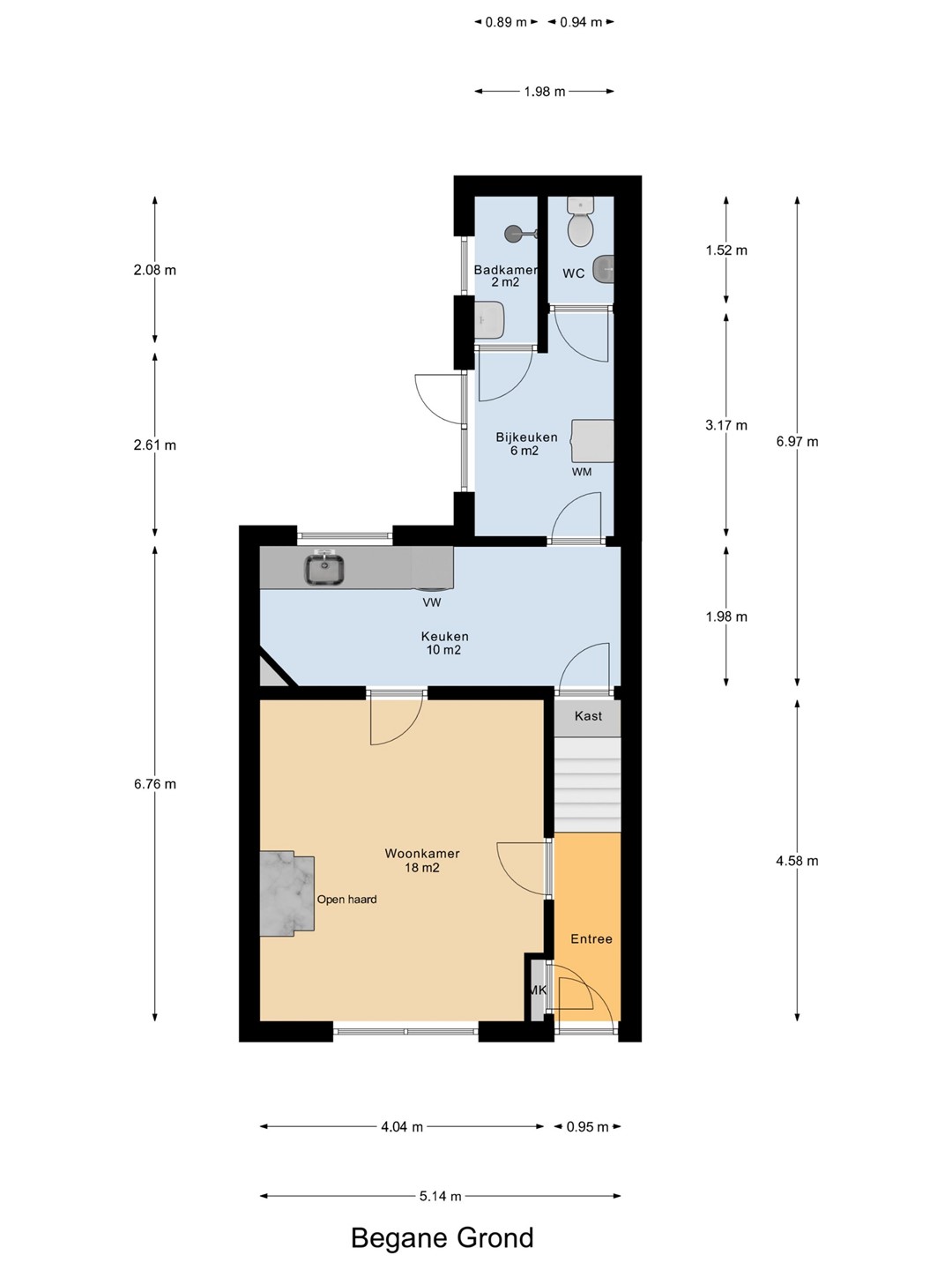 Via de entree kom je binnen in de hal met meterkast en trapopgang naar de eerste verdieping. Vanuit de hal bereik je de gezellige woonkamer, die is voorzien van een karakteristieke schouw en een warme uitstraling heeft. De woonkamer heeft een oppervlakte van ca. 18 m2. Aansluitend bevindt zich de keuken met een eenvoudige keukenopstelling en een praktische trapkast voor extra bergruimte. De keuken heeft een oppervlakte van ca. 10 m2.