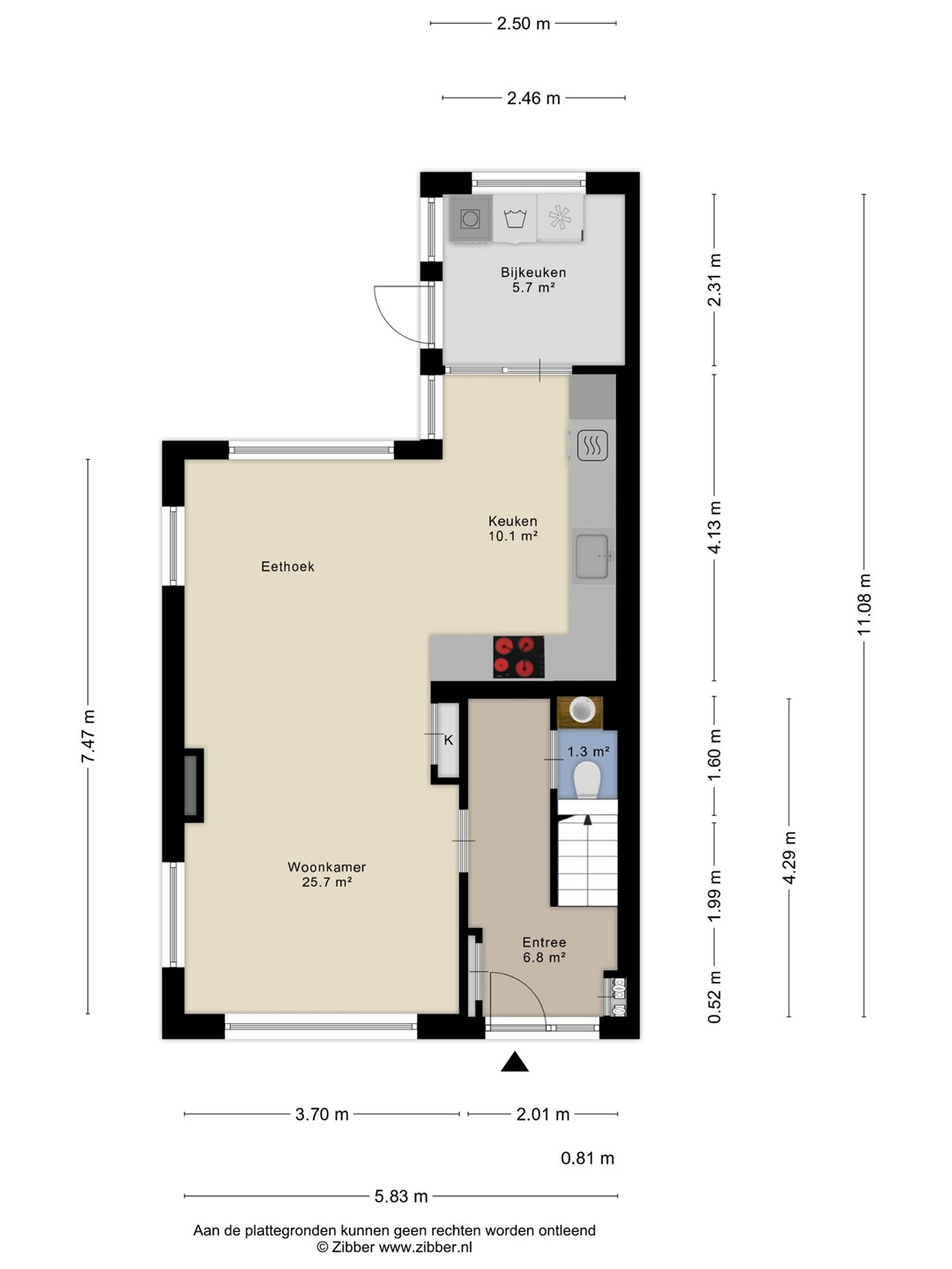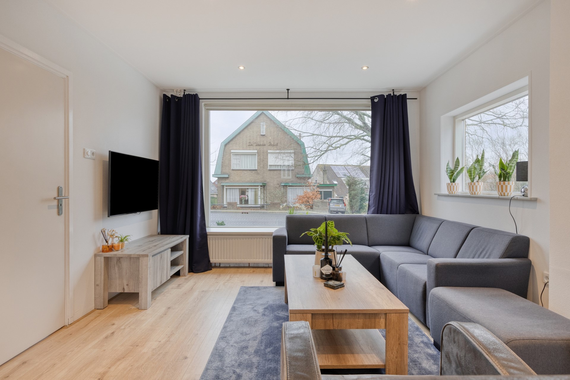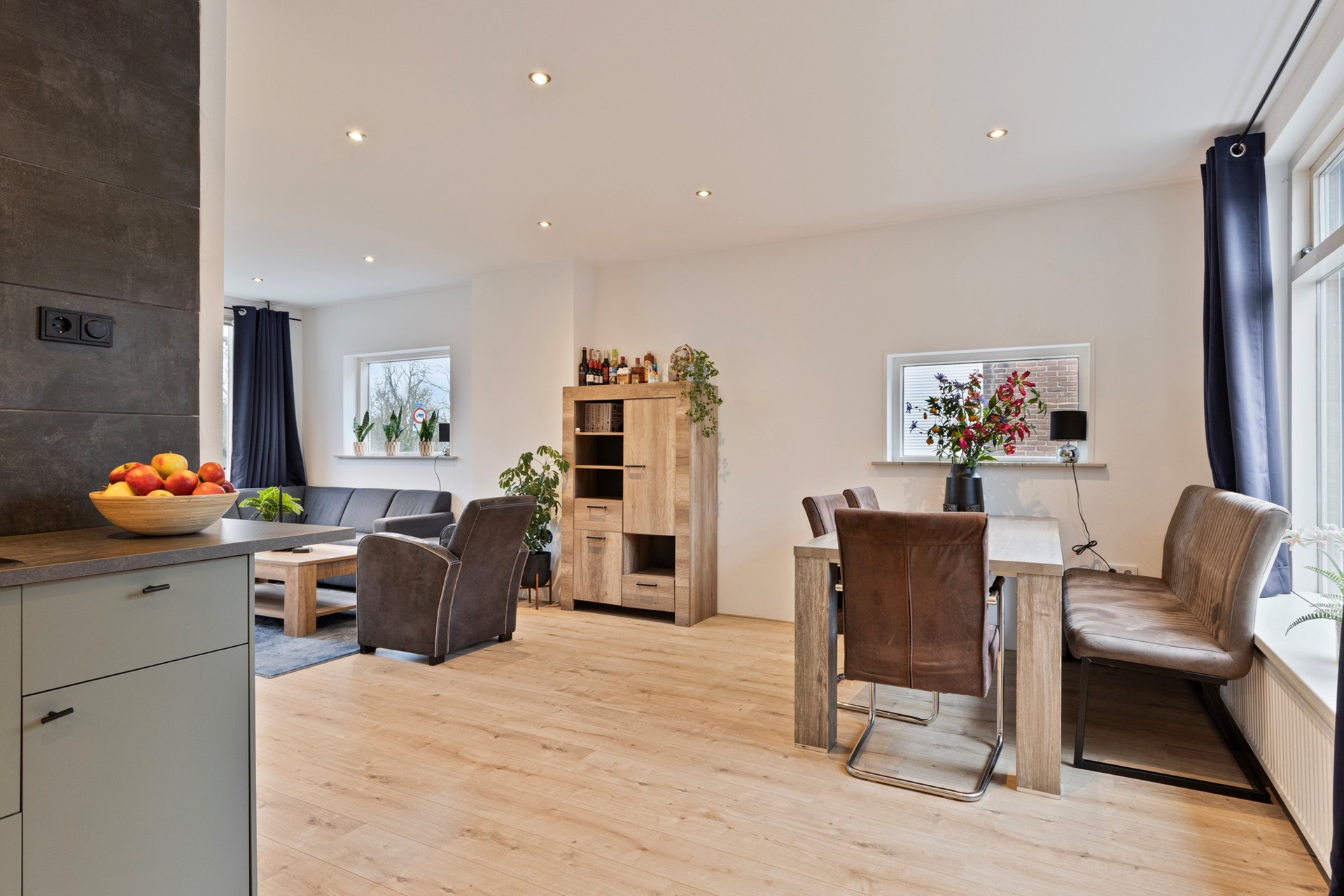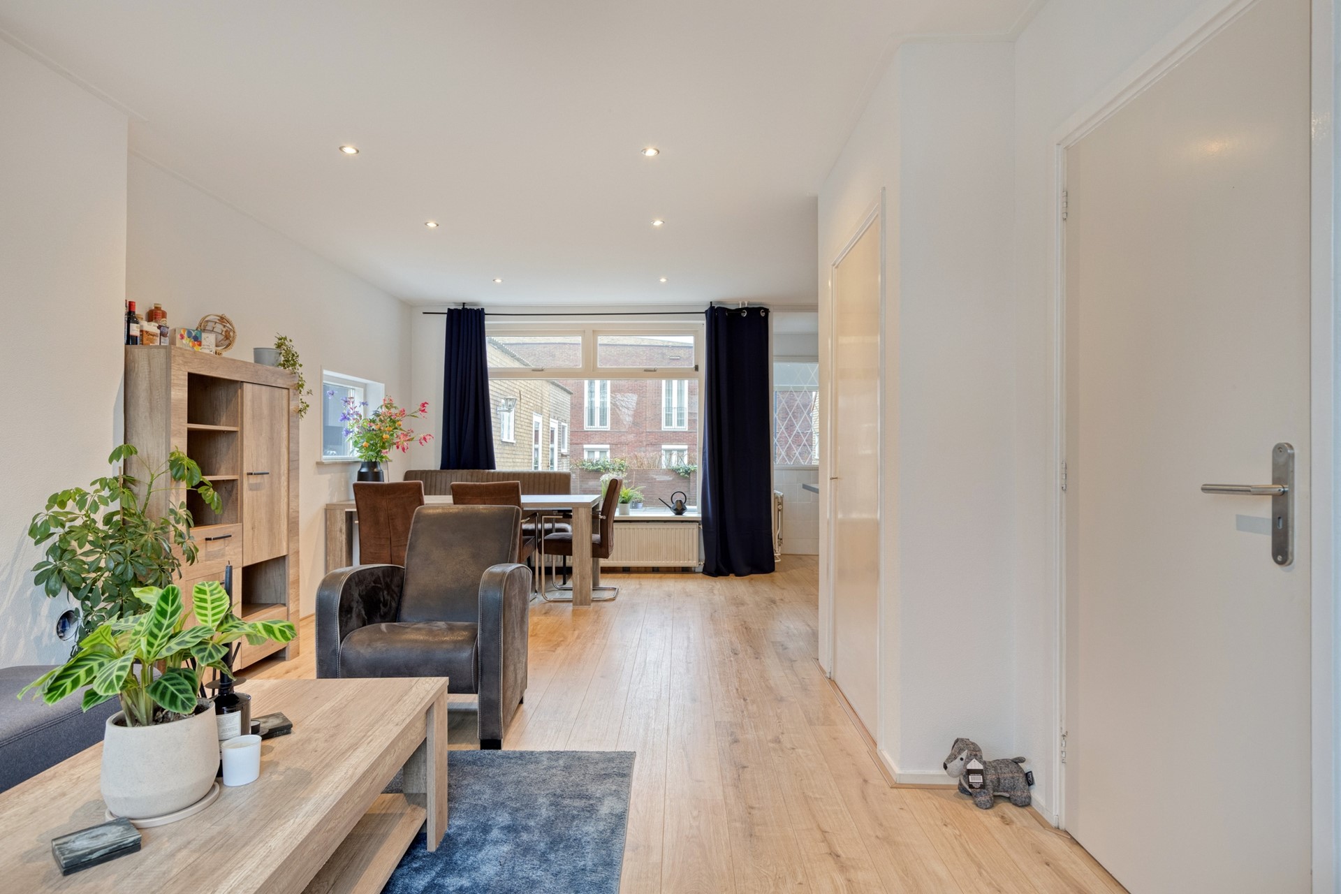 Vanuit de hal bereikt u de lichte en fijne woonkamer, die dankzij de grote raampartijen veel daglicht ontvangt. De woonkamer staat in open verbinding met de keuken, wat zorgt voor een ruimtelijk en gezellig geheel. De woonkamer heeft een oppervlakte van ca. 25,7 m².