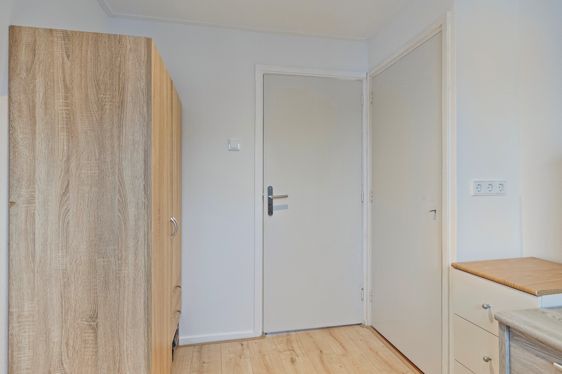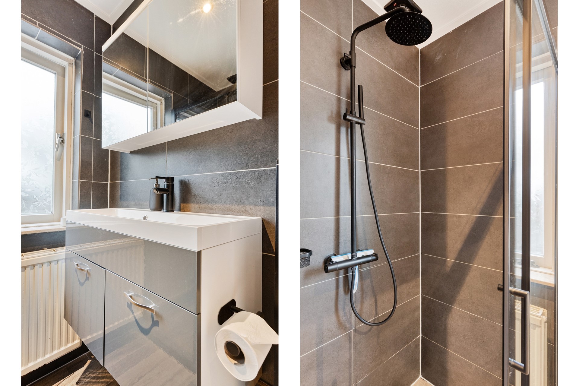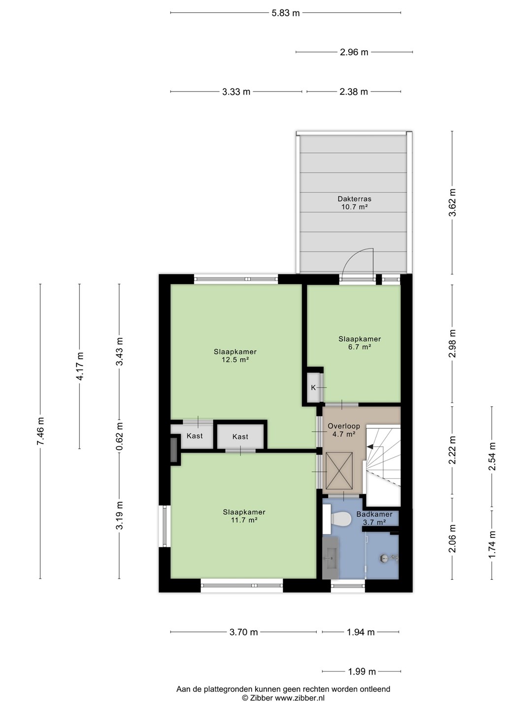 Op de eerste verdieping bevinden zich de overloop, drie comfortabele slaapkamers en een nette badkamer. De badkamer heeft een oppervlakte van ca. 3,7 m² en is uitgevoerd met een douchehoek, badkamermeubel en toilet. Daarnaast beschikt deze verdieping over een ruim dakterras van ca. 10,7 m², een heerlijke plek om buiten te zitten of om wasgoed te drogen.