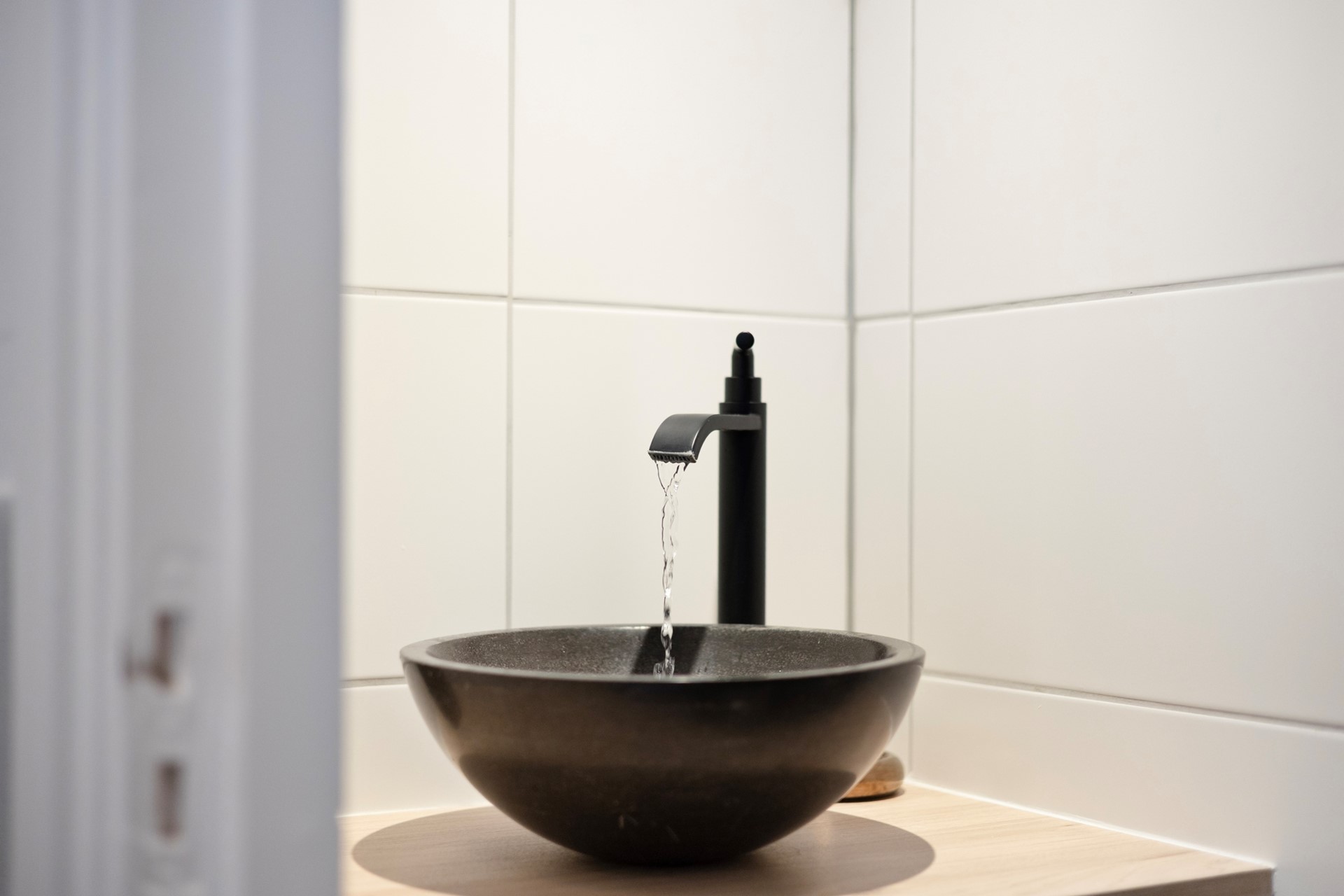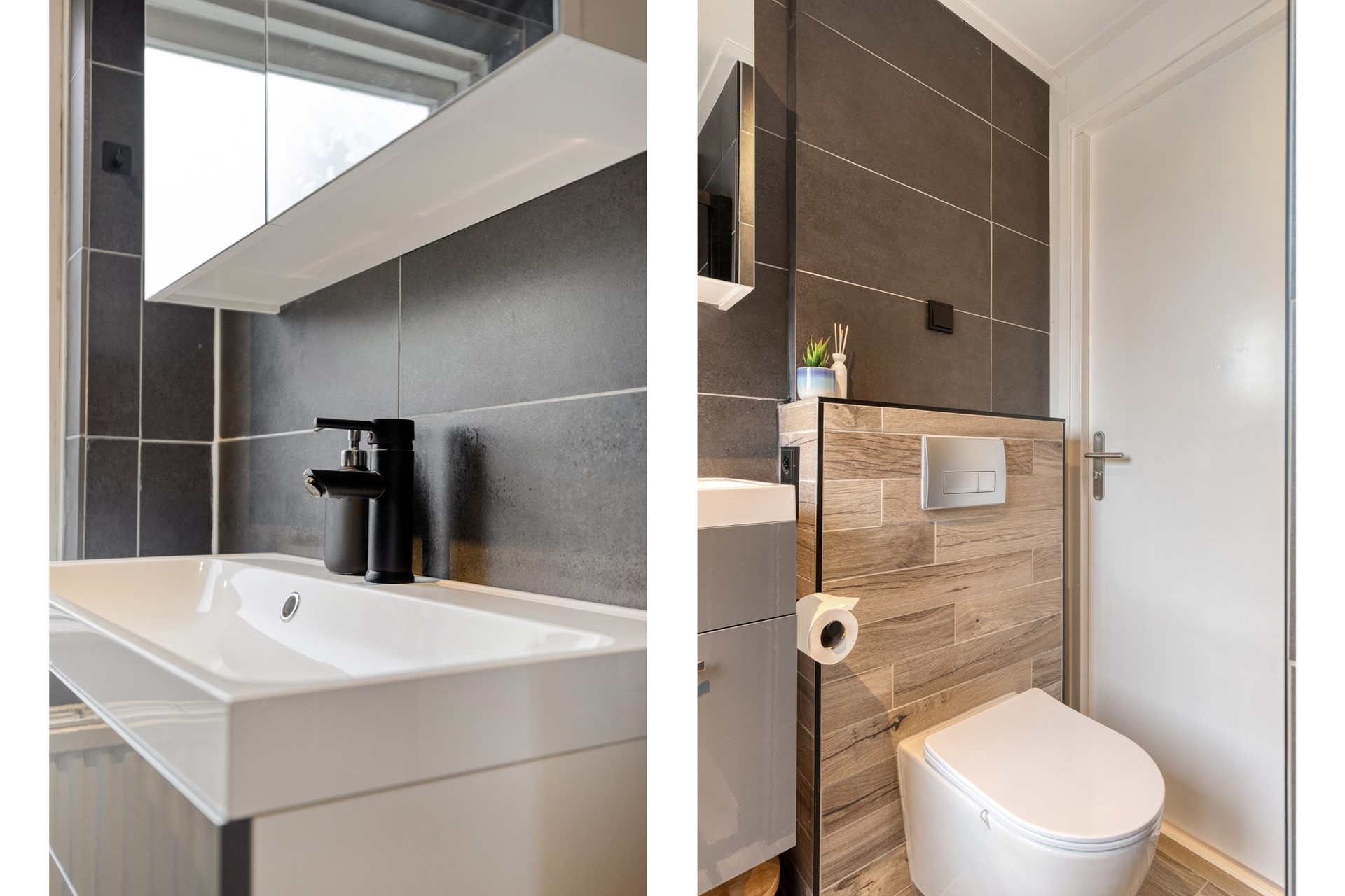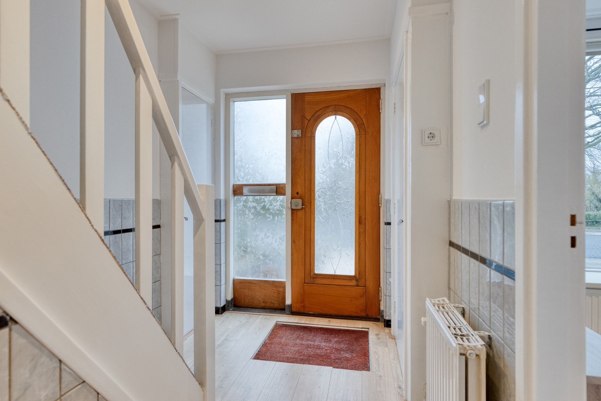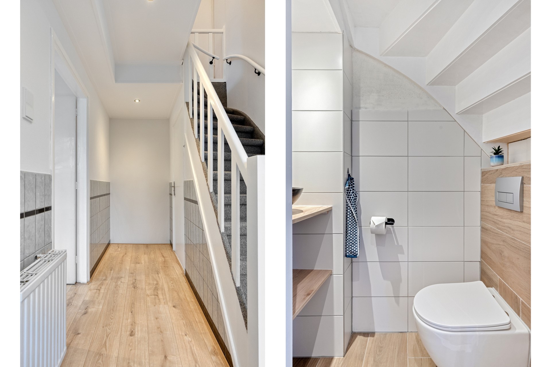 U komt de woning binnen in de ruime hal met meterkast, toilet en trapopgang naar de eerste verdieping. Het toilet is keurig uitgevoerd met een hangtoilet en fonteintje.