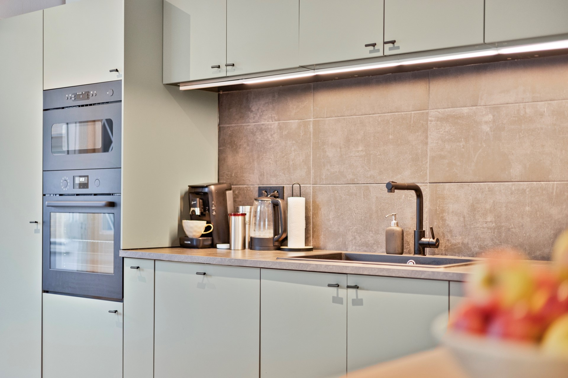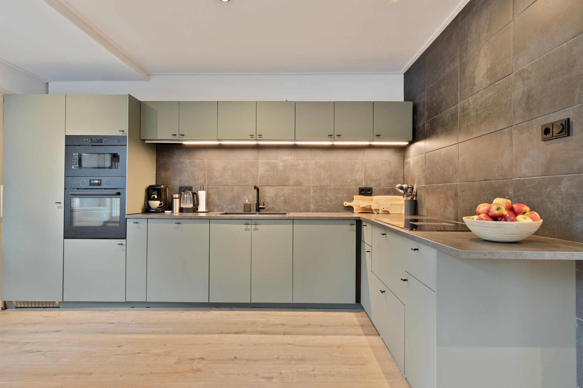 De moderne keuken is uitgevoerd met een grote keukenopstelling en voorzien van alle wenselijke inbouwapparatuur. De keuken heeft een oppervlakte van ca. 10 m². Aansluitend bevindt zich de praktische bijkeuken (ca. 5,7 m²) met aansluitingen voor huishoudelijke apparatuur en een directe toegang tot de tuin.