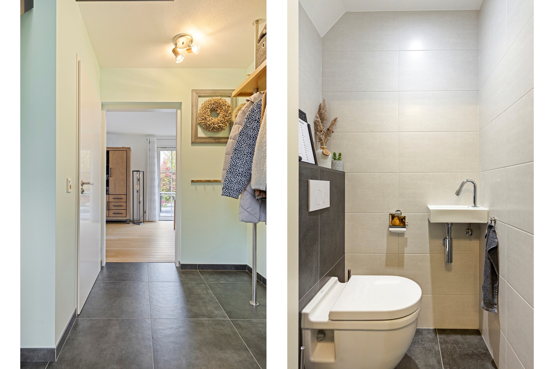 U komt de woning binnen in de ruime hal met een meterkast, toilet en trapopgang naar de eerste verdieping. Het toilet is keurig uitgevoerd met een hangtoilet en een fonteintje. Vanuit de hal komt u in de ruime L-vormige woonkamer met een oppervlakte van maar liefst ca. 42 m2. Vanuit de zithoek is er vrij uitzicht. De vloer en de wanden zijn netjes afgewerkt en door de vele raampartijen komt veel daglicht de ruimte binnen.