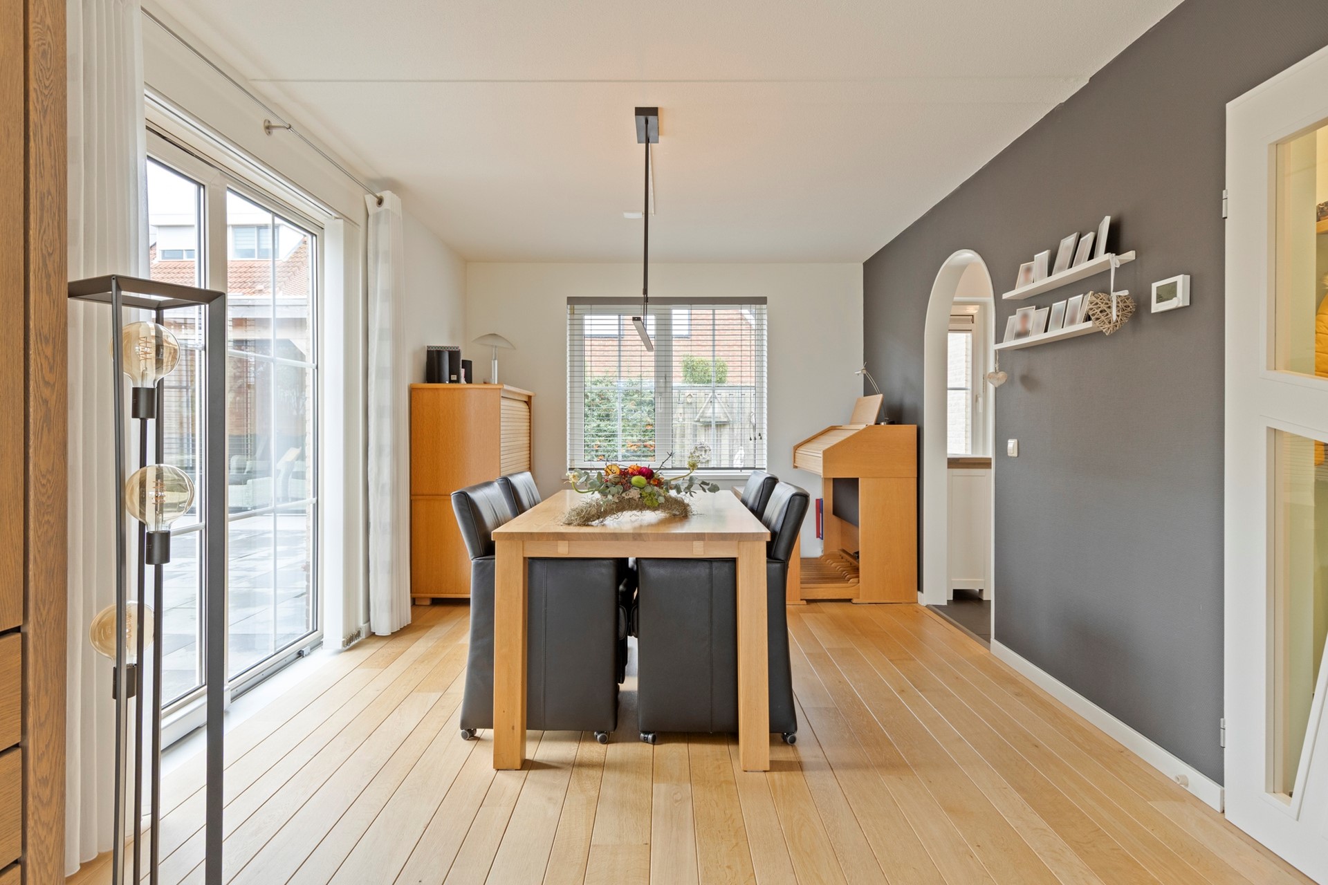 Aan de achterzijde van de woning bevindt zich de sfeervolle eetkamer met een leuk uitzicht over de tuin. Vanuit de eetkamer bereikt u de halfopen keuken.