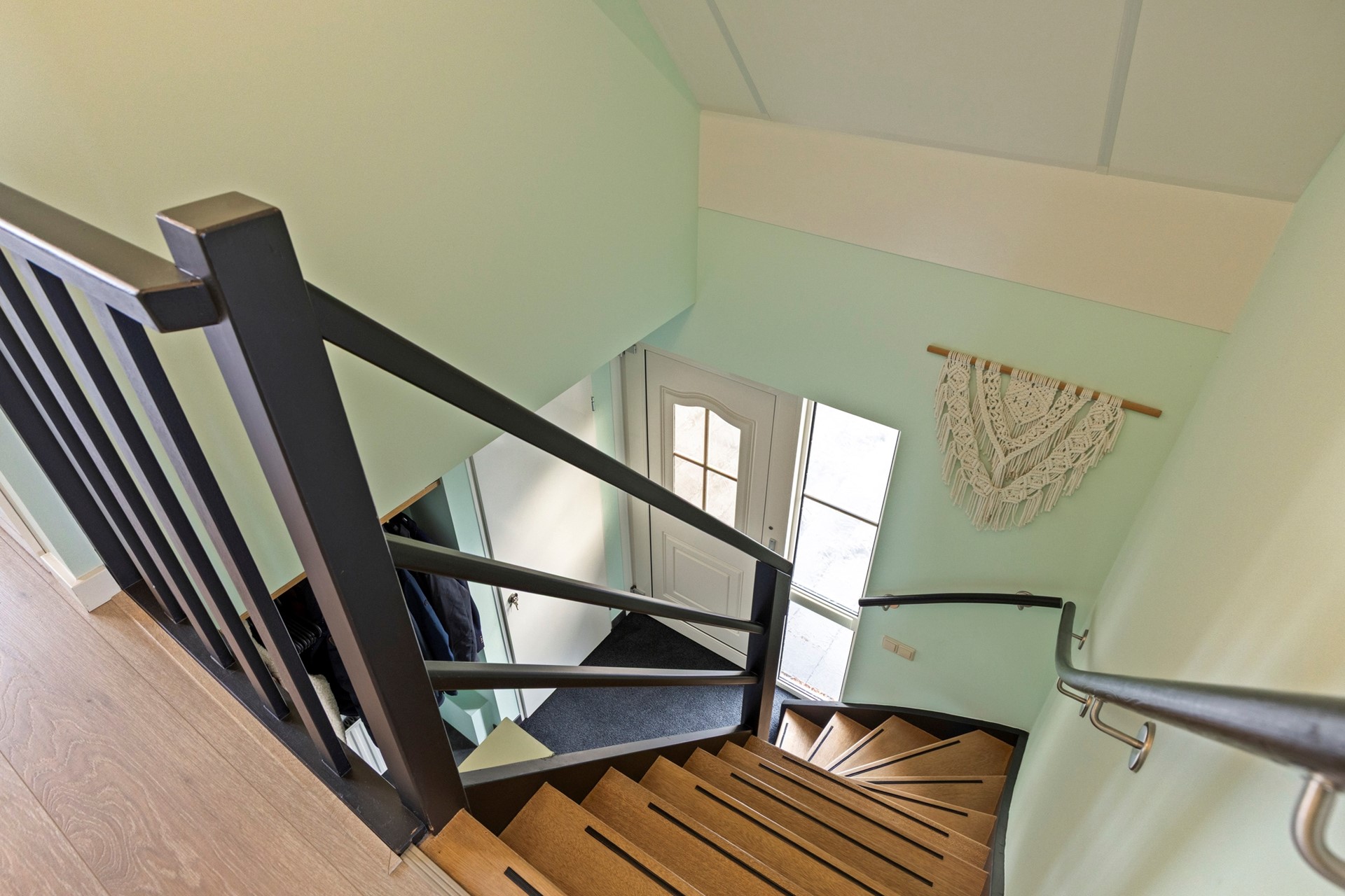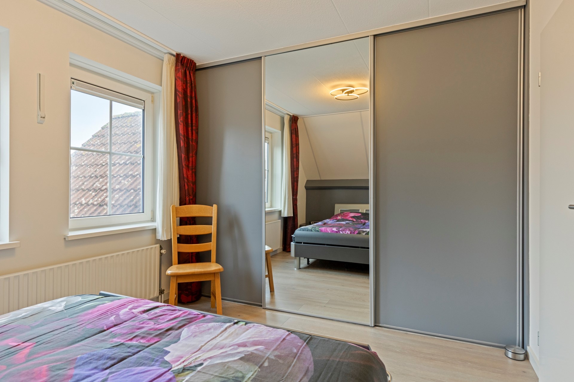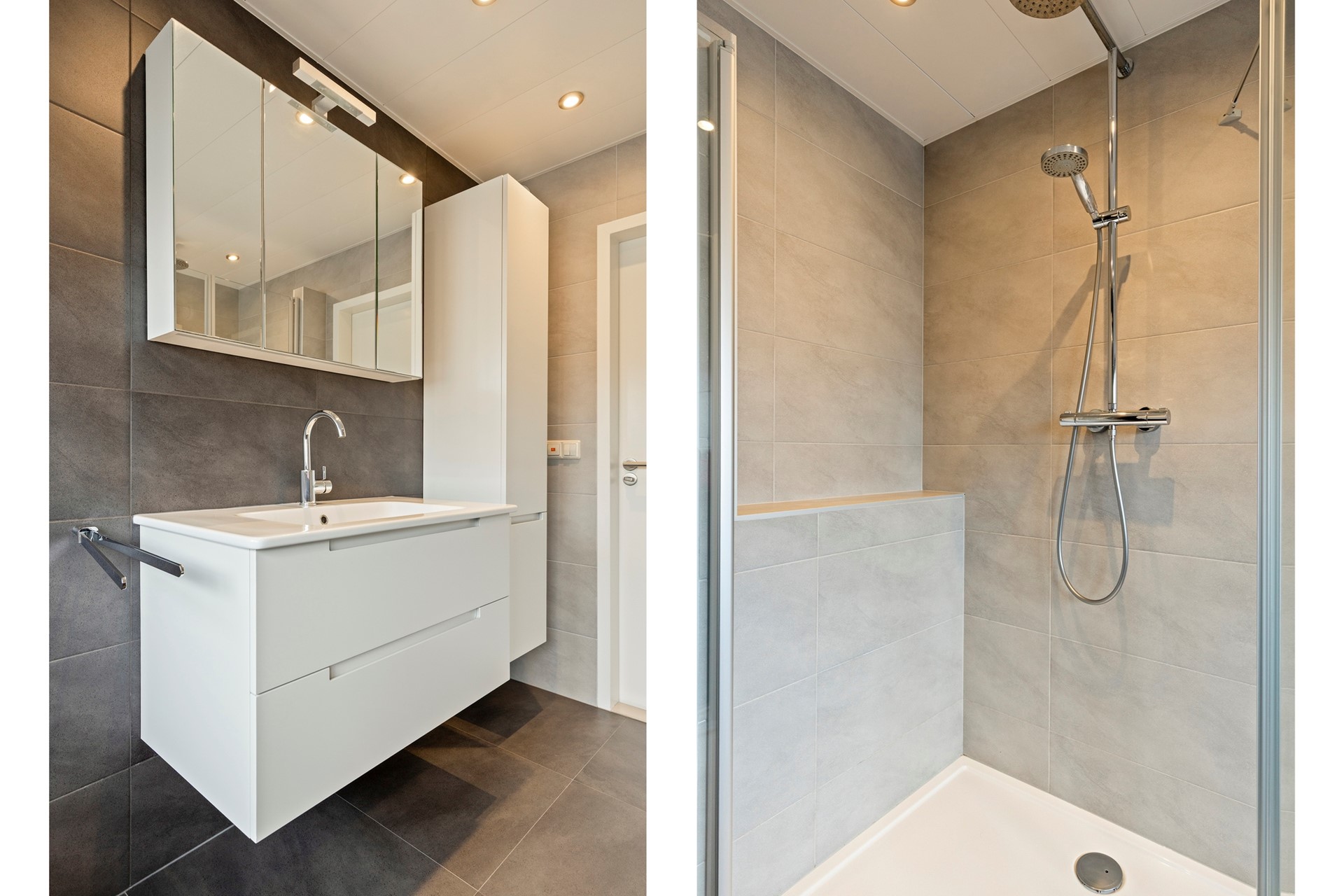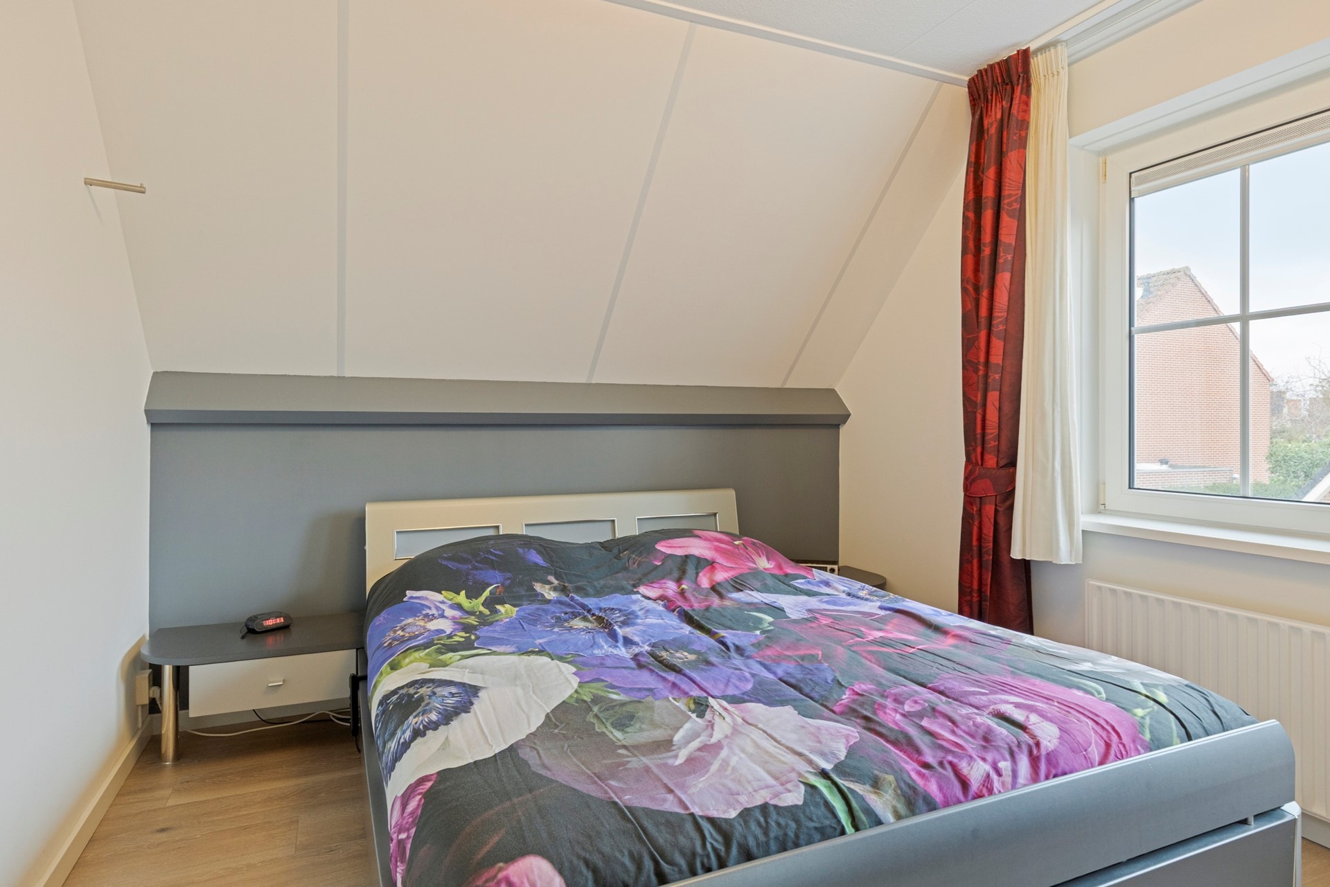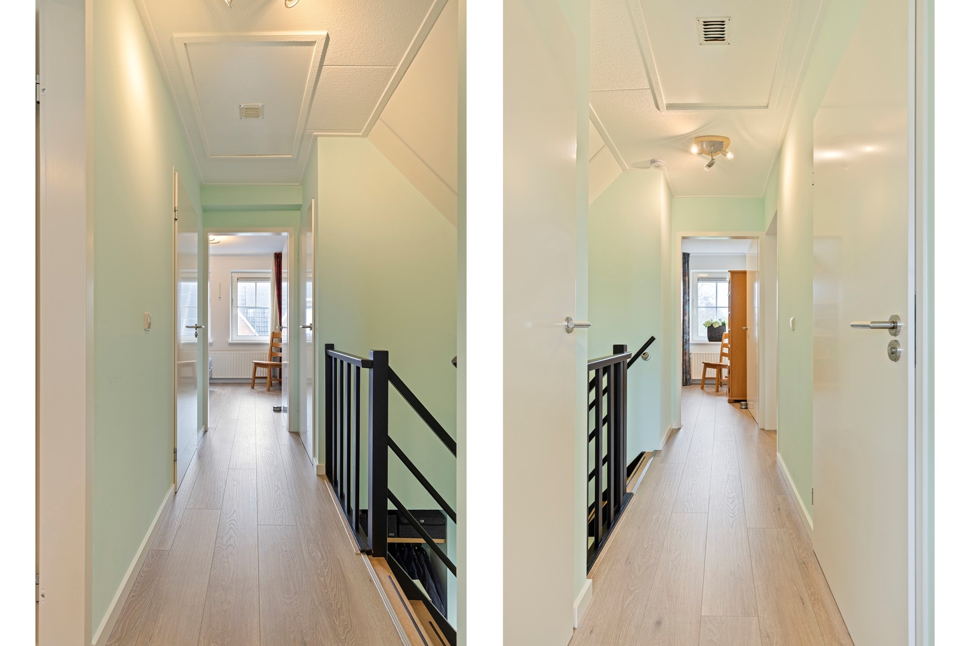 Aan de voorzijde van de woning bevinden zich twee slaapkamers met een fraai uitzicht. De master bedroom ligt aan de achterzijde en is voorzien van een net afgewerkte, ingebouwde kastruimte. Alle slaapkamers zijn uitgerust met ventilatieroosters bij de ramen, wat zorgt voor een prettig binnenklimaat. De badkamer ligt centraal op de verdieping en heeft een moderne uitstraling dankzij de combinatie van lichtgrijze en donkergrijze tegels. De ruimte is verder uitgerust met een net wastafelmeubel, douche en toilet. Daarnaast bevindt zich op deze verdieping een CV-kast, waarin ook de waterontharder en de omvormer van de zonnepanelen zijn geplaatst.