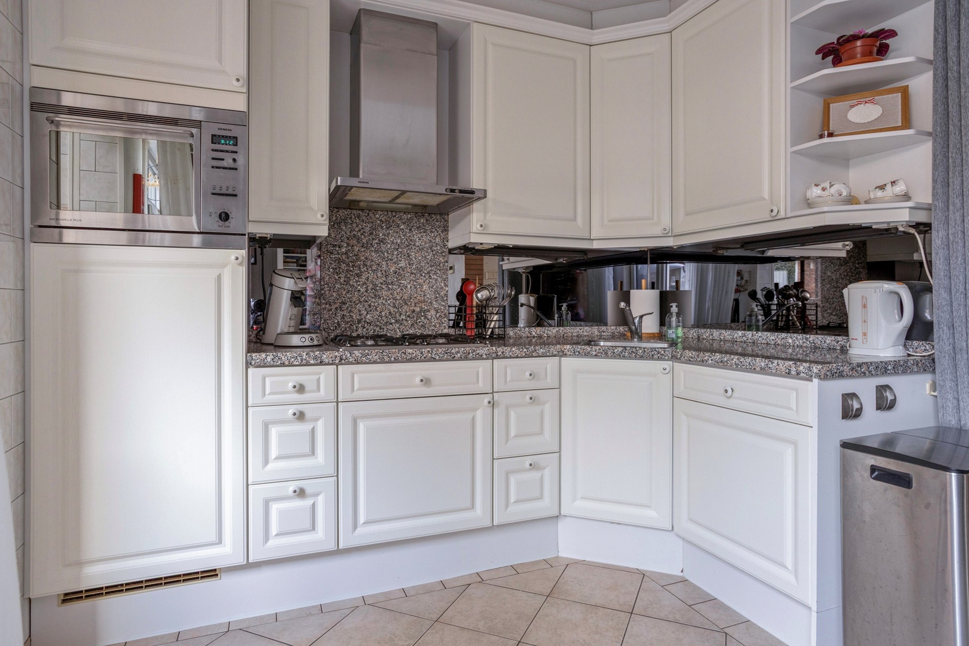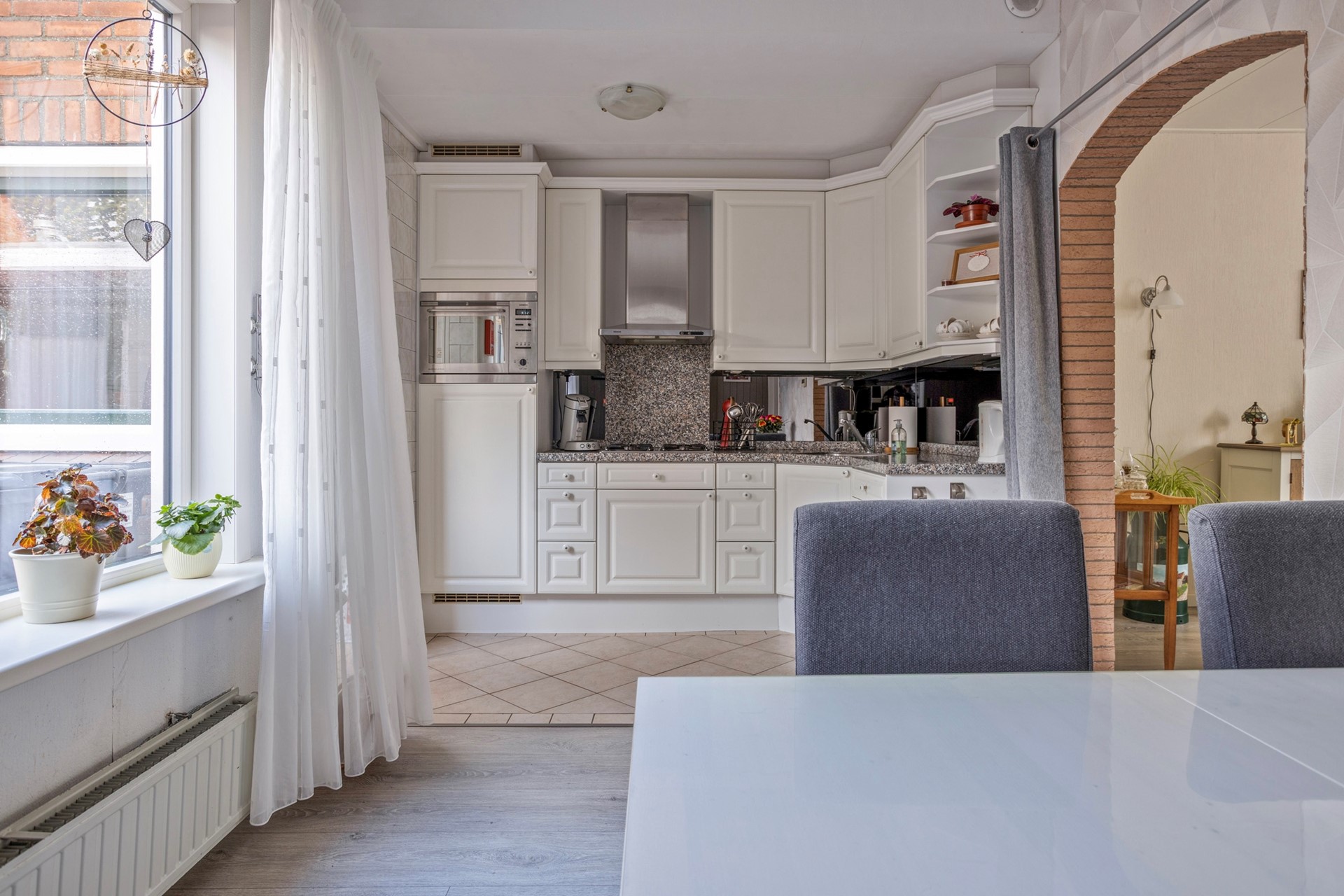 Aansluitend ligt de ruime keuken, uitgevoerd in een hoekopstelling en voorzien van diverse inbouwapparatuur: o.a. gaskookplaat, afzuigkap, combi-oven, vaatwasser en koelkast.