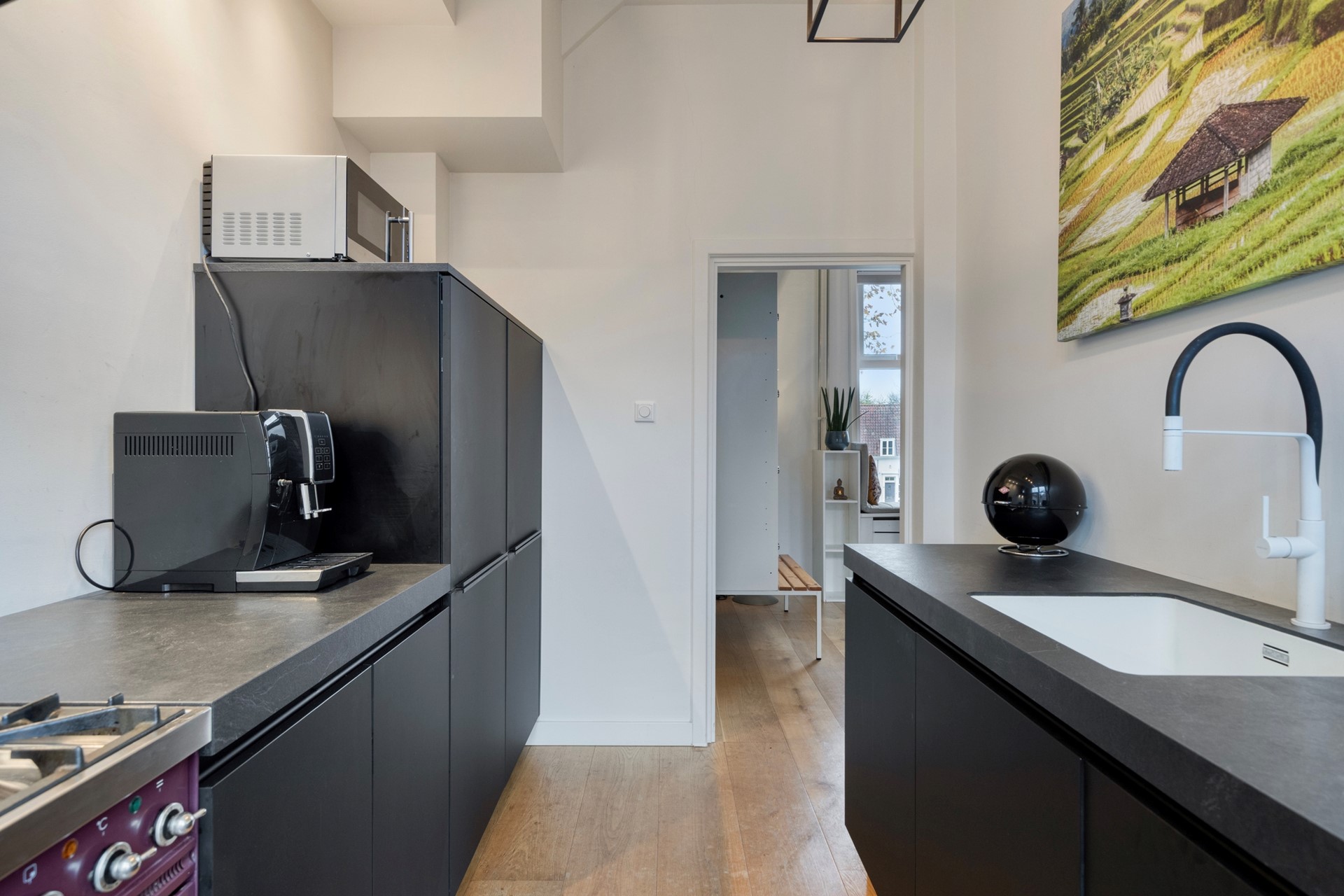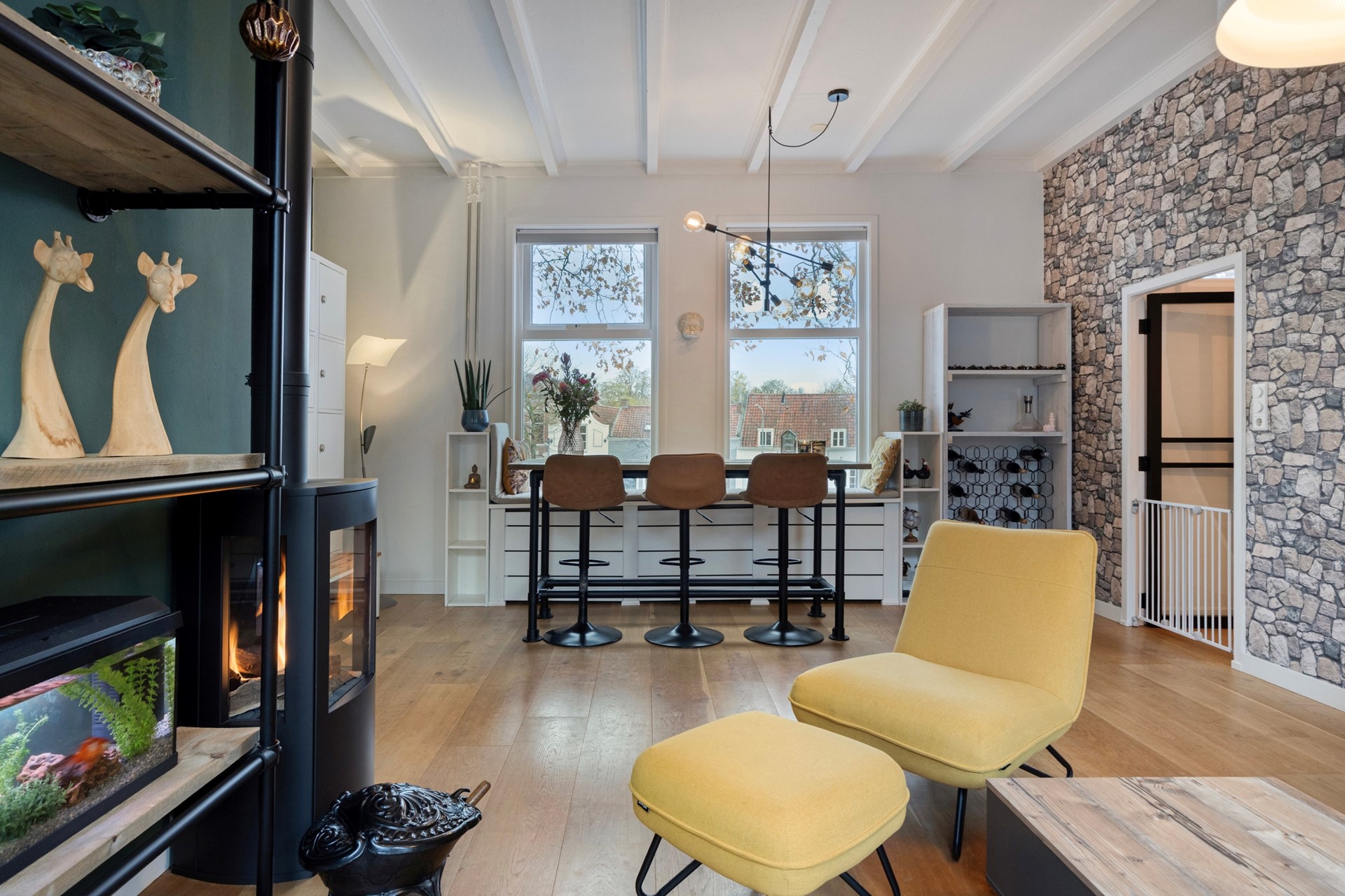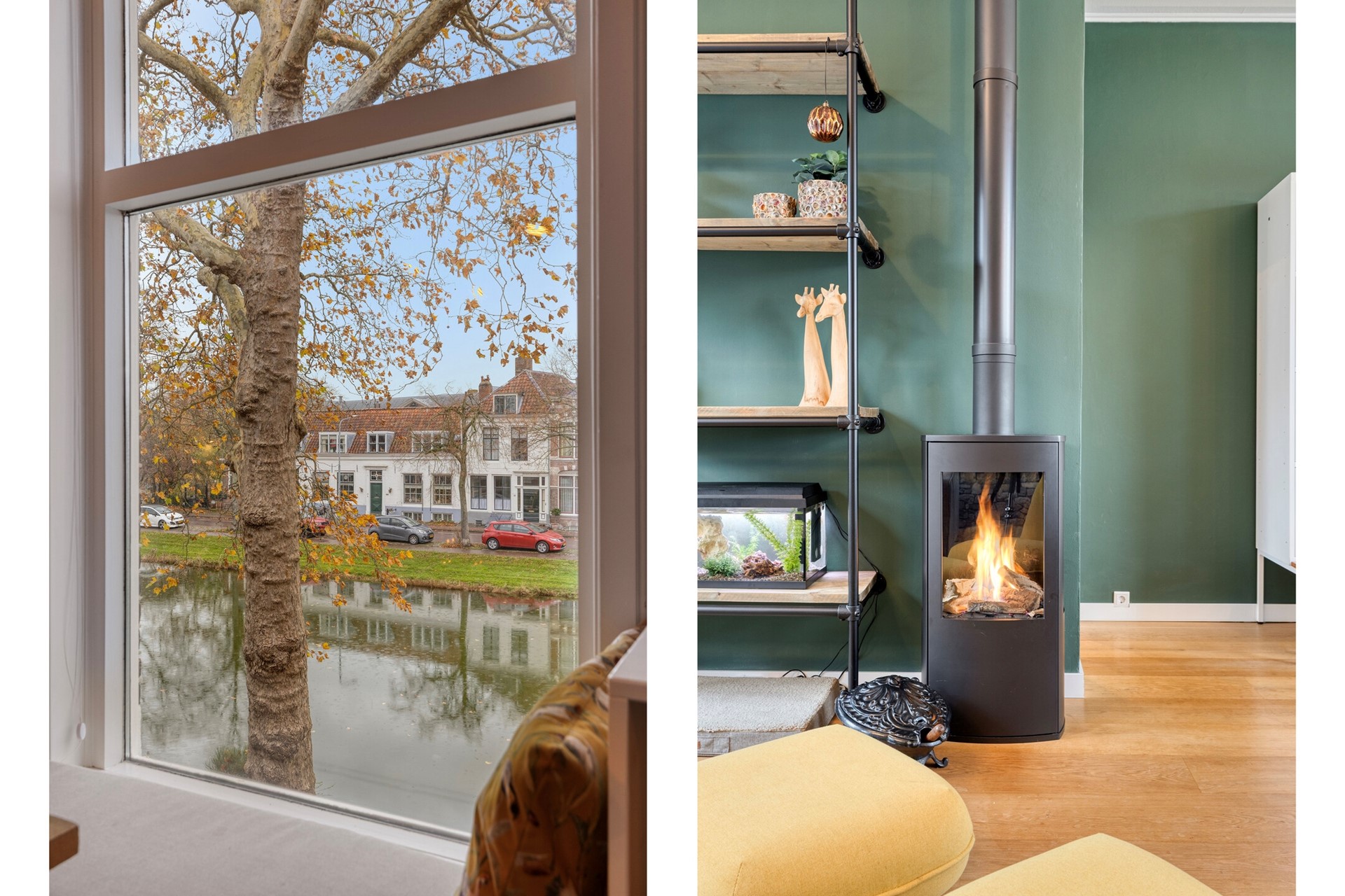 Op de eerste verdieping vindt u de woonverdieping met overloop, een separaat toilet, de woonkamer en de keuken. De royale woonkamer vormt het hart van het huis en biedt een prachtig uitzicht over de gracht. De sfeervolle gaskachel, hoge ramen en karakteristieke details creëren een warme en uitnodigende leefruimte. De zithoek bevindt zich aan de achterzijde en de eethoek aan de voorzijde van de woning. De woonkamer heeft een oppervlakte van ca. 30 m². De moderne keuken is strak uitgevoerd en voorzien van alle wenselijke inbouwapparatuur, waaronder een Boretti fornuis, afzuigkap, koelkast, vriezer en vaatwasser. De keuken biedt directe toegang tot het grote dakterras, waardoor binnen en buiten mooi in elkaar overlopen.