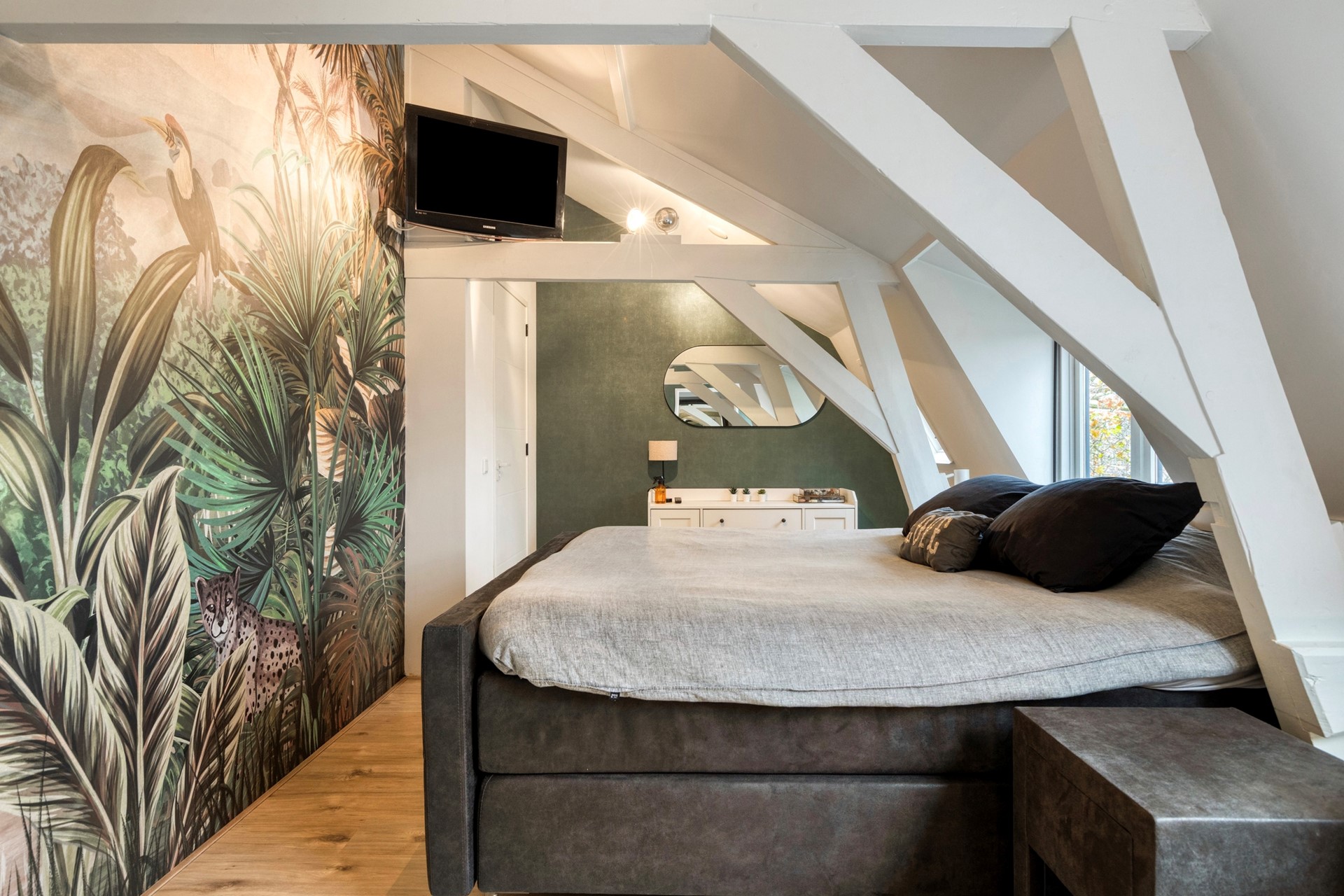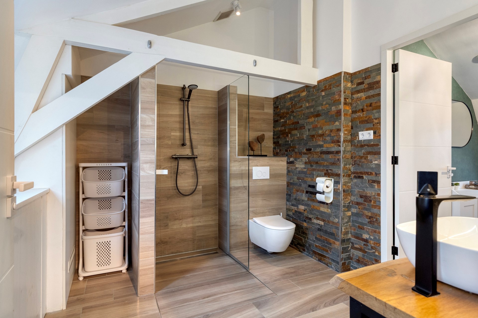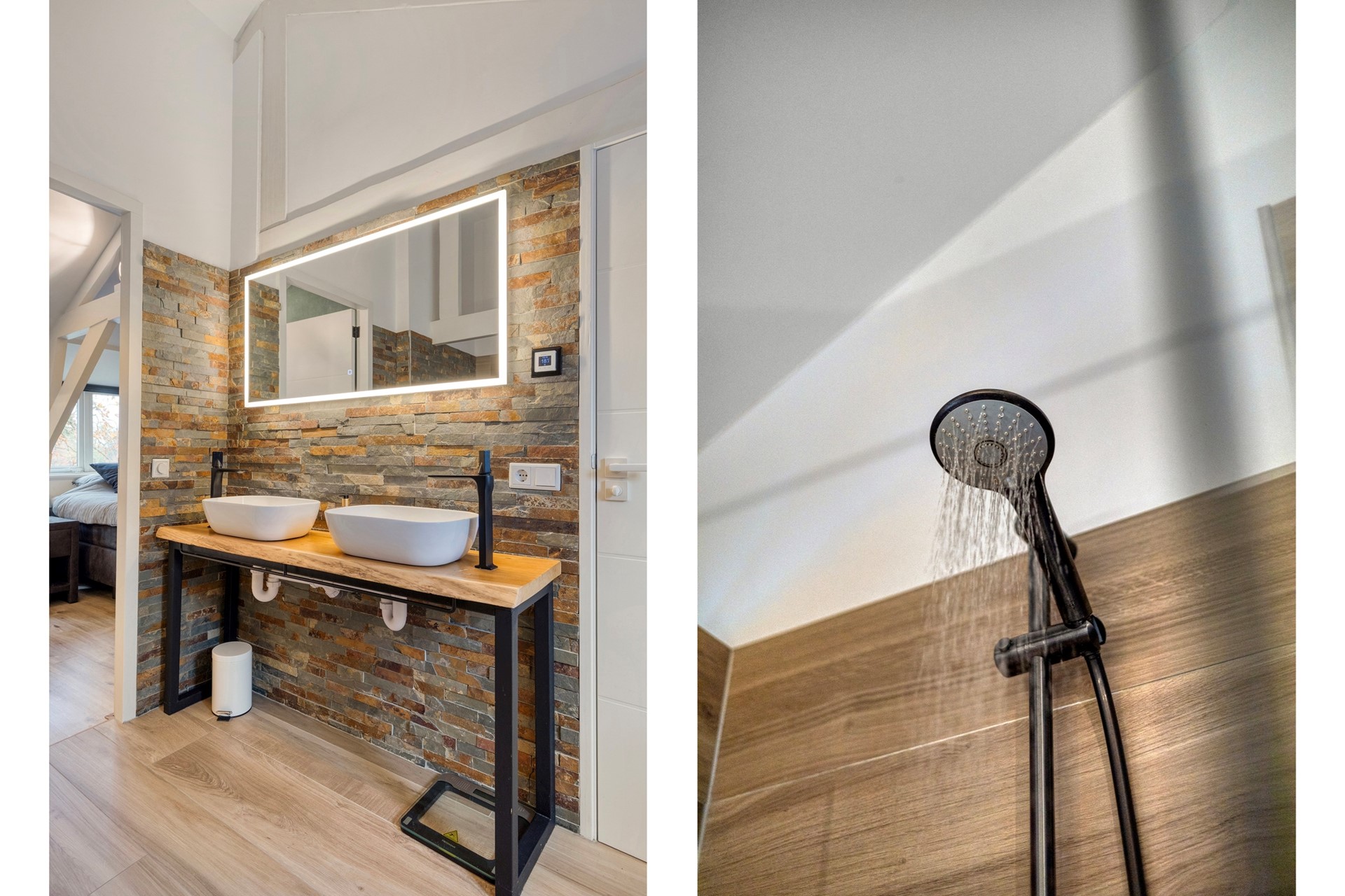 Op de tweede verdieping bevinden zich een overloop, een badkamer en twee grote slaapkamers. De zichtbare balken zorgen voor een sfeervol geheel en maken deze verdieping extra karaktervol. De grootste slaapkamer is voorzien van een inloopkast en biedt een riante slaapruimte van ca. 17,7 m². De moderne badkamer is verrassend ruim opgezet en keurig uitgevoerd met een inloopdouche, toilet en stijlvol dubbel wastafelmeubel. De gecombineerde vloer- en wandafwerking en de elektrische vloerverwarming zorgen voor extra comfort. Ook is er een wasmachine en drogeraansluiting aanwezig.
