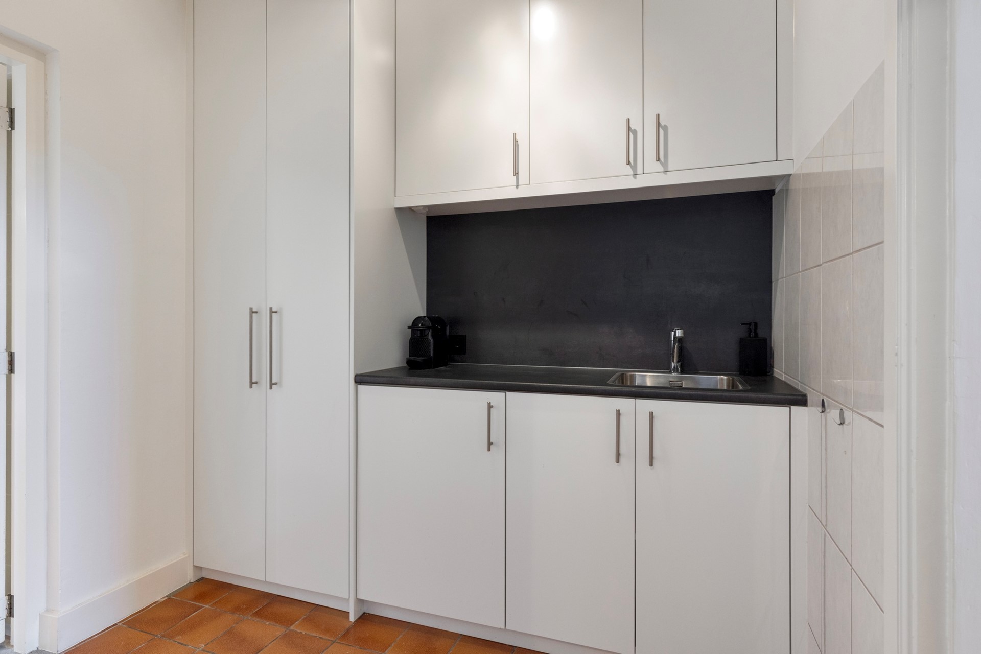 Het ruime en sfeervolle dakterras op de eerste verdieping is een fantastische plek om buiten te dineren of te genieten van een kop koffie in alle rust. Het dakterras beschikt bovendien over vaste bergruimte.