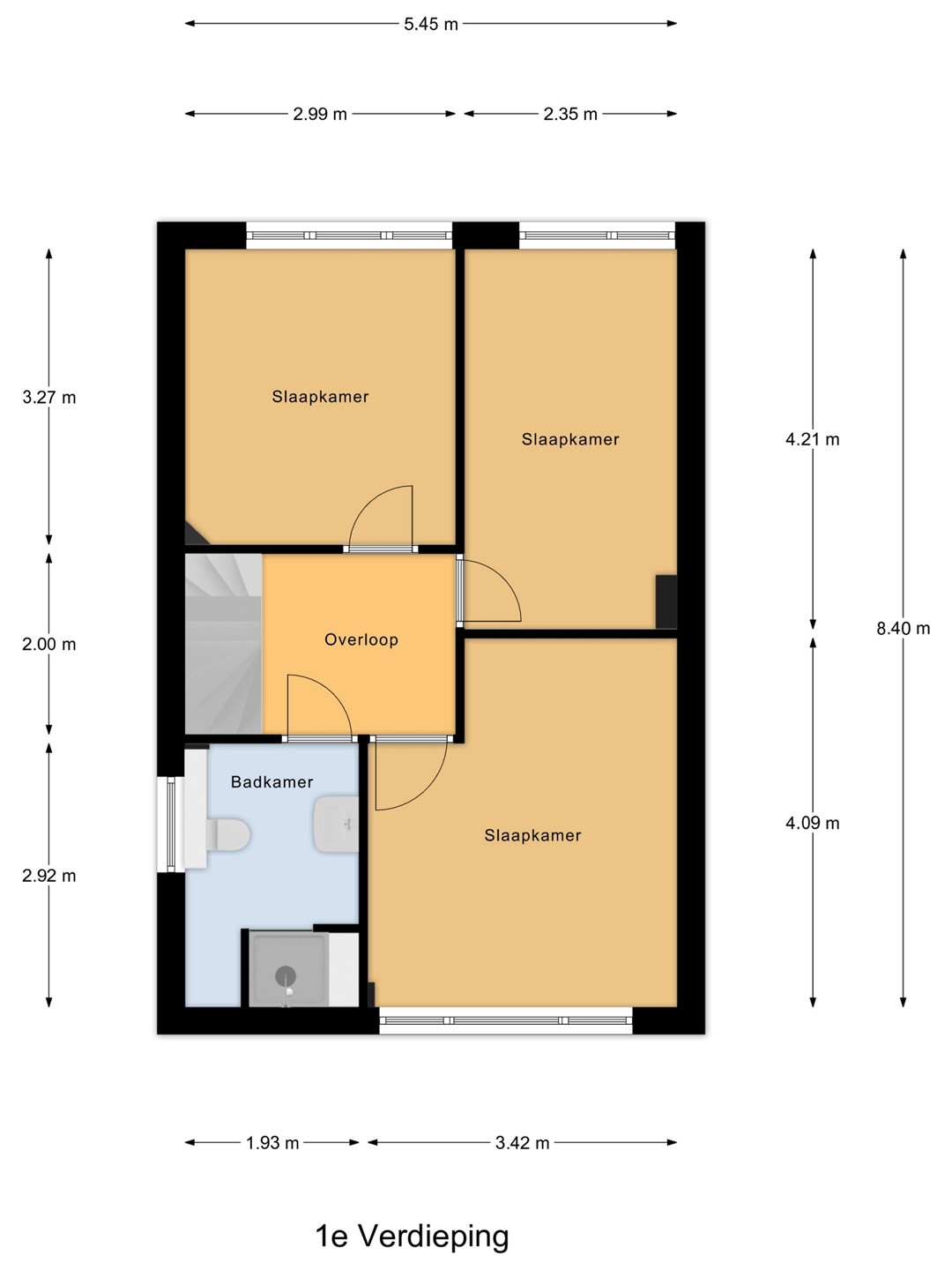 Op de eerste verdieping bevinden zich de overloop, drie goed bemeten slaapkamers en de badkamer. De slaapkamers zijn praktisch ingedeeld en bieden volop mogelijkheden voor een gezin, thuiswerken of hobby. De badkamer, gelegen aan de voorzijde, is functioneel ingericht met een douchehoek, toilet en wastafel. De badkamer heeft een oppervlakte van ca. 5,6 m2.