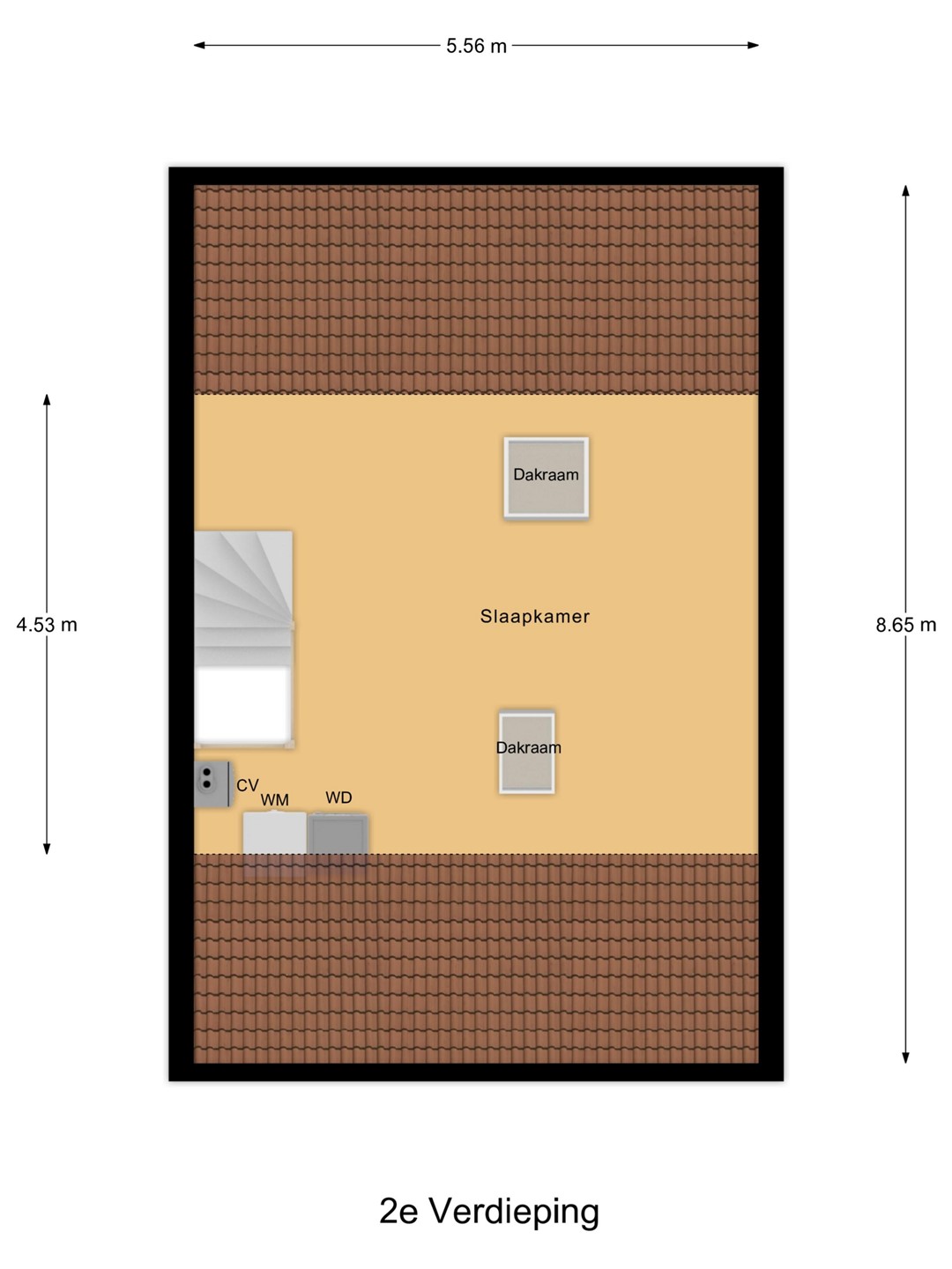 De tweede verdieping bestaat uit een open zolderruimte van ca. 25 m², die naar wens kan worden ingericht als extra slaapkamer, werkruimte of bergruimte. Hier bevinden zich tevens de cv-ketel en de aansluitingen voor huishoudelijk apparatuur.