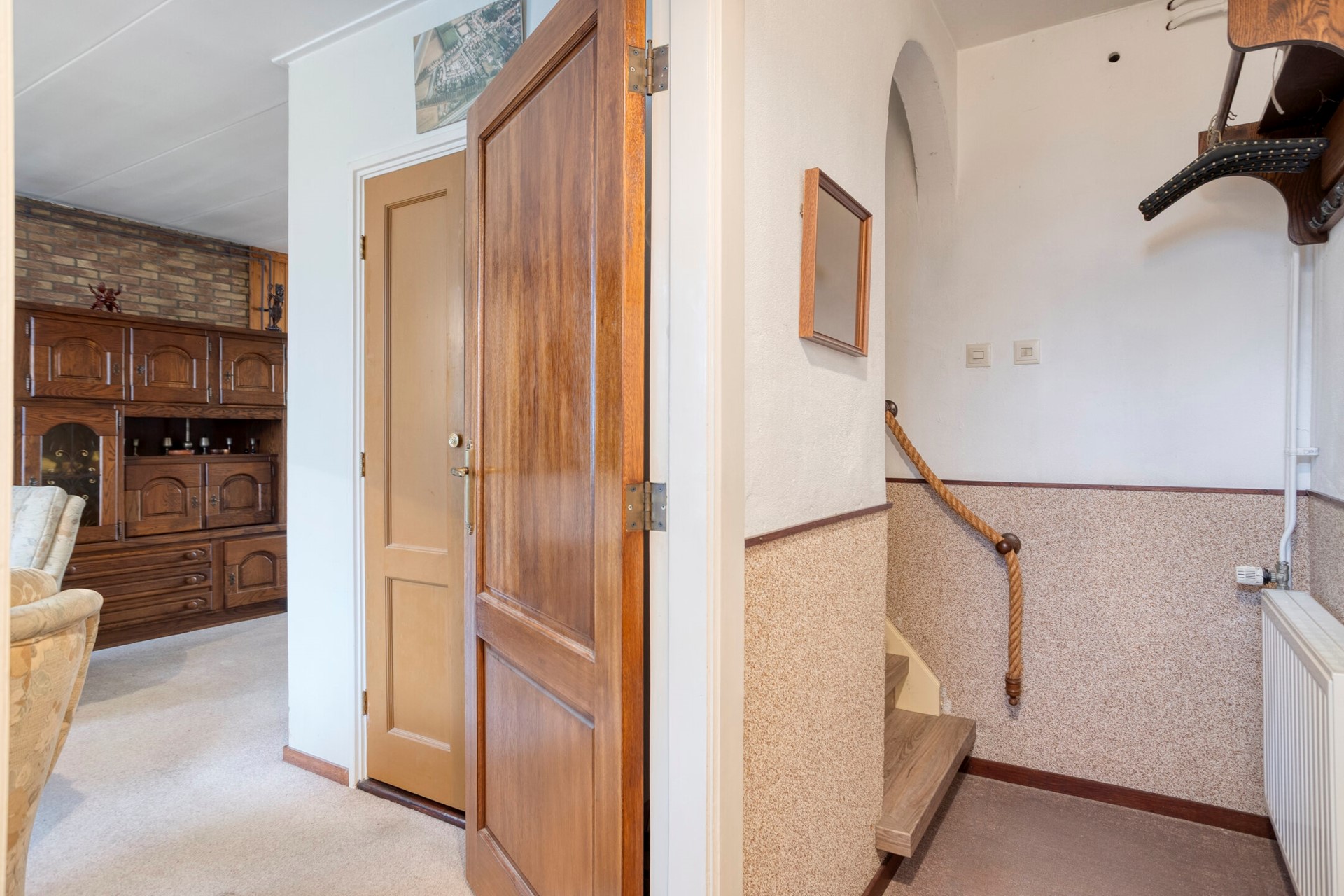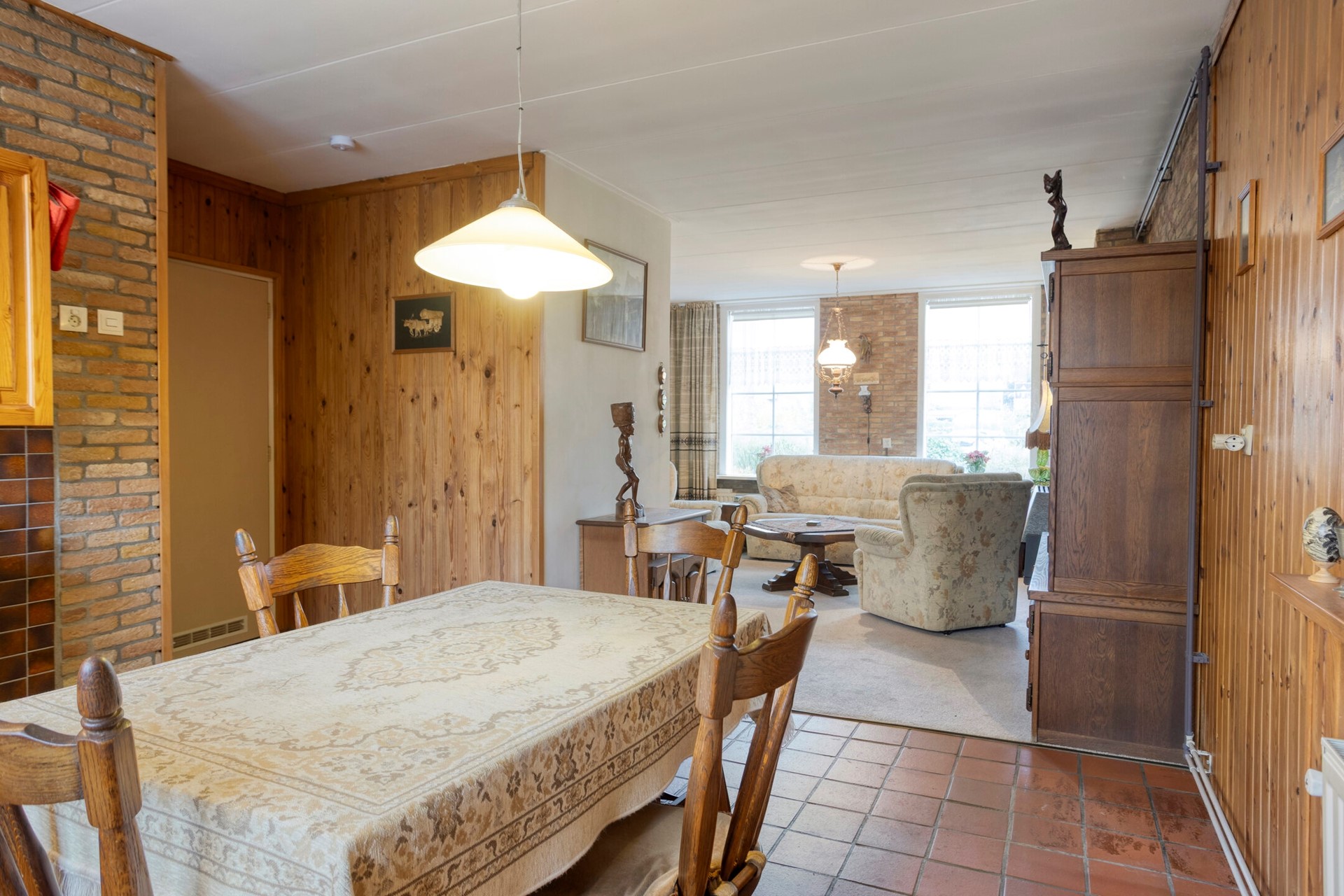 Je komt de woning binnen in de hal met meterkast, trapopgang naar de verdieping en toegang tot de gezellige woonruimte. In de woonkamer zorgen de twee raampartijen voor fijne lichtinval en de schouwpartij voor extra sfeer. Aansluitend vind je de eetruimte met open verbinding naar de keuken. De keuken heeft een eenvoudige opstelling en biedt uitzicht op de achtertuin. In het achterste gedeelte van de woning bevinden zich het toilet (met cv-opstelling, Nefit 2014) en de badkamer met wastafel en douche.
