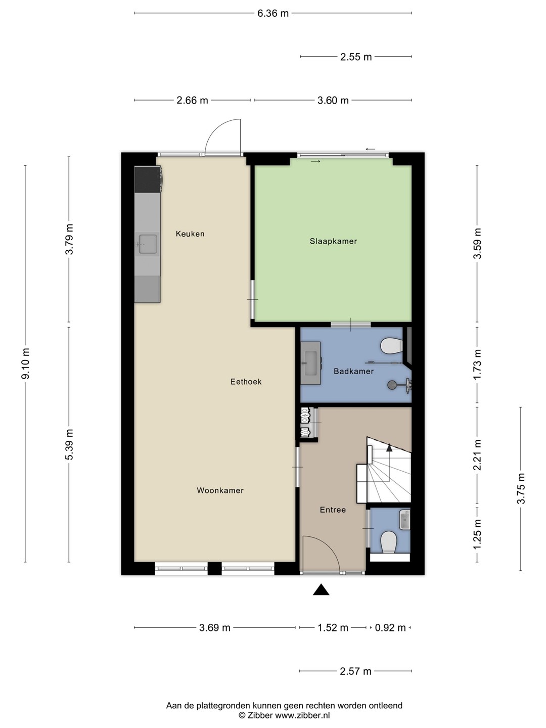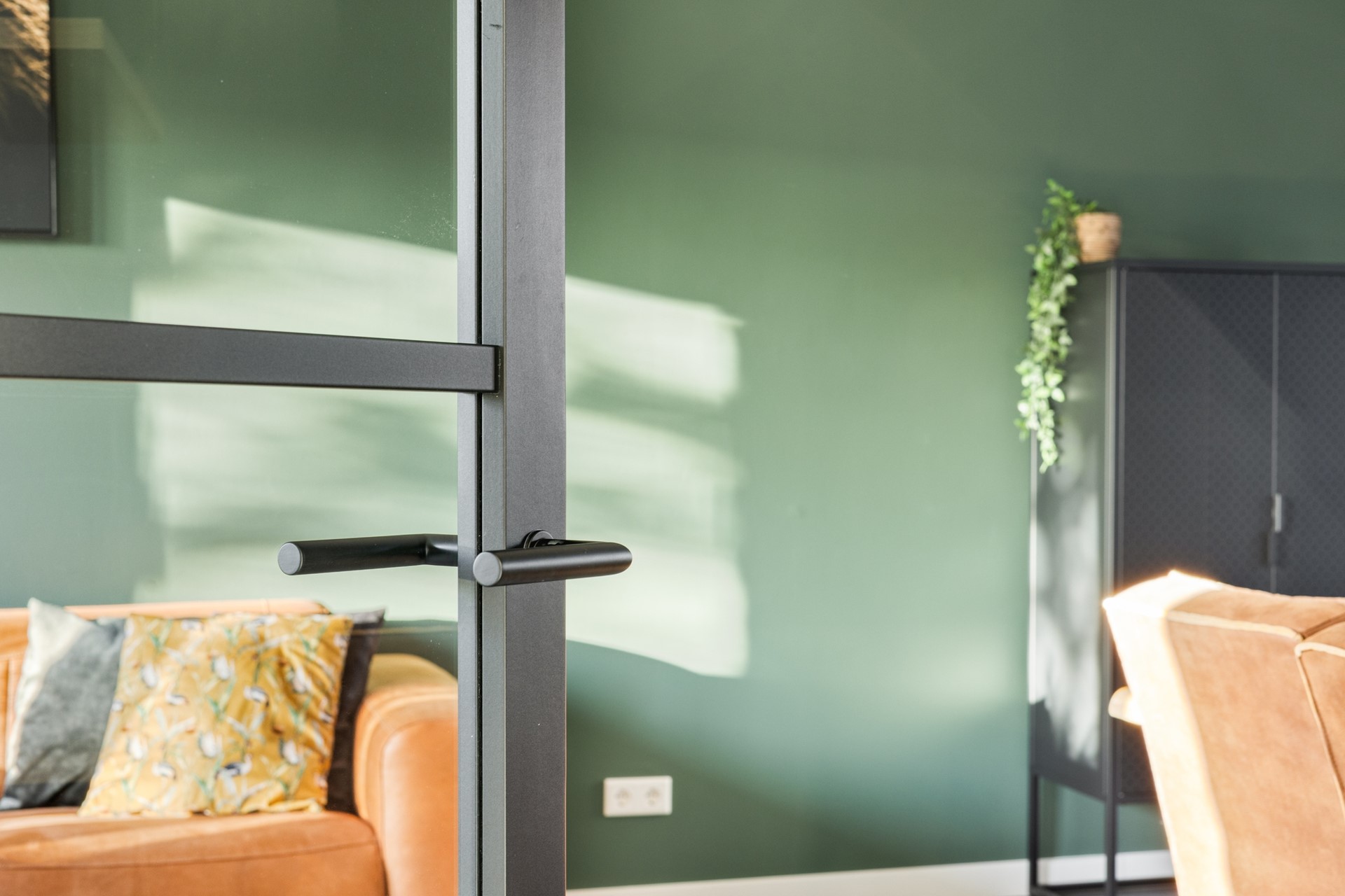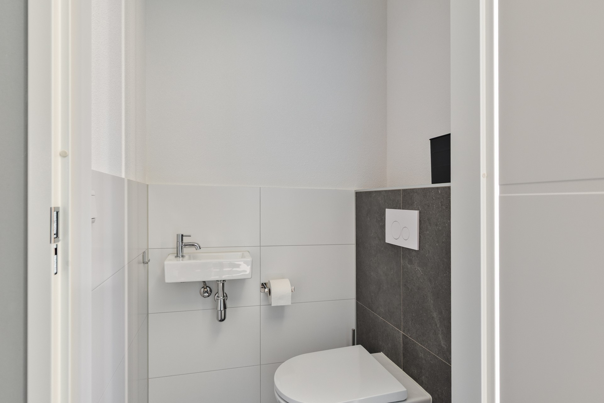 Vanuit deze slaapkamer bereik je de moderne badkamer op de begane grond. De badkamer is uitgerust met een inloopdouche, toilet en wastafelmeubel. De combinatie van witte en donkere tegels zorgt voor een stijlvolle, tijdloze uitstraling.