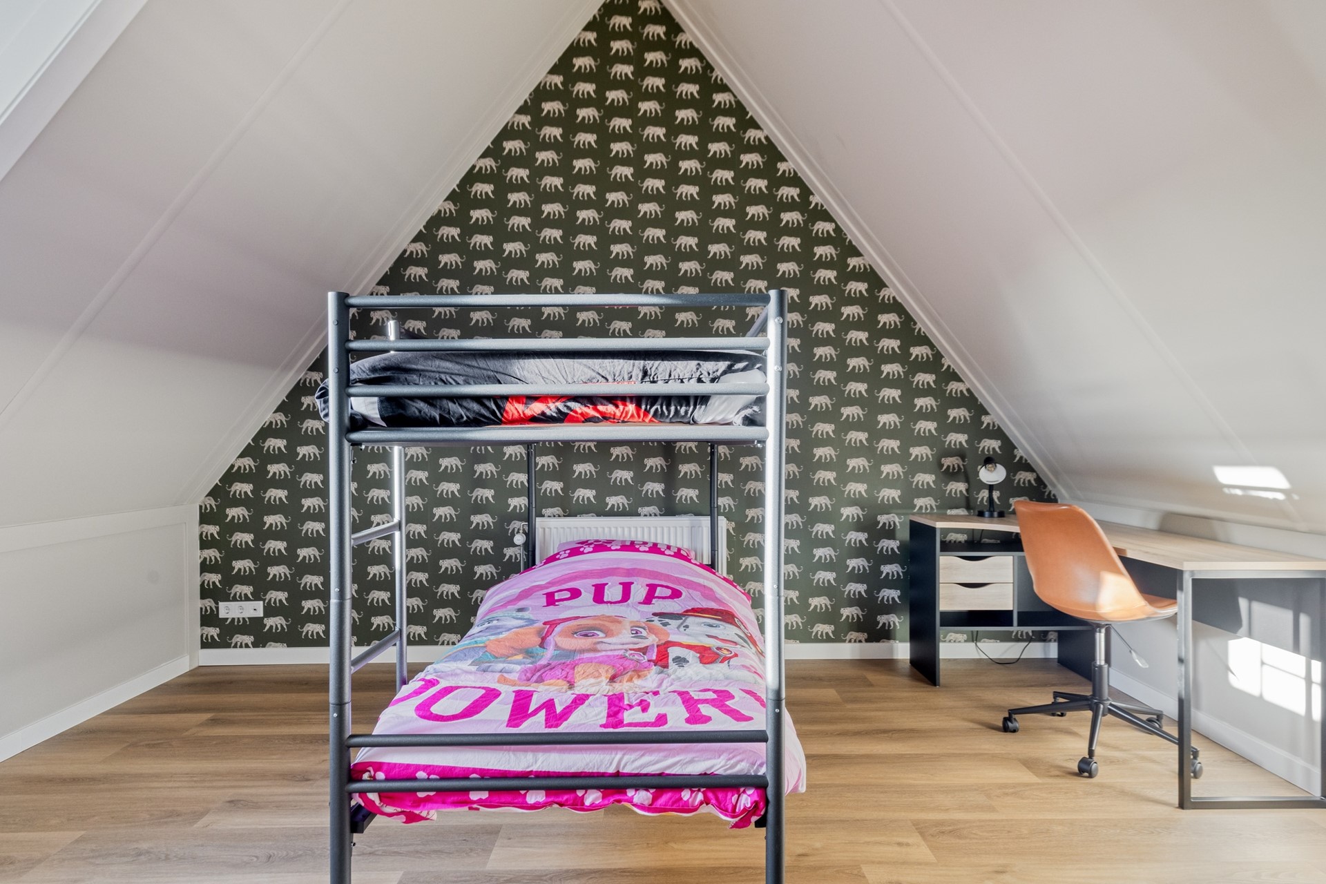 De eerste verdieping beschikt over een ruime overloop en een grote slaapkamer. Op de overloop vind je de aansluitingen voor huishoudelijk apparatuur, de cv-ketel (Intergas, 2022), de mechanische ventilatie box en de omvormer voor de zonnepanelen, allemaal netjes weggewerkt en goed bereikbaar. De grote slaapkamer, met een oppervlakte van circa 13 m², biedt volop ruimte en comfort als master bedroom of extra slaapkamer. De vloer op de eerste verdieping is voorzien van een fraaie PCV-vloer.